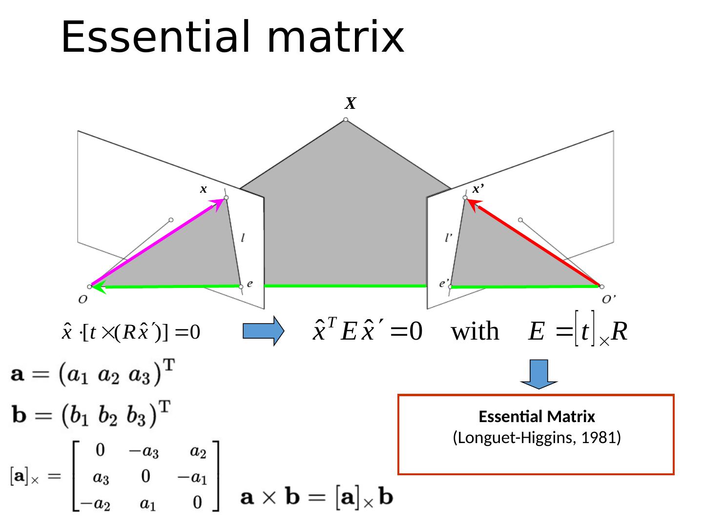 18 .Essential Matrix (Longuet-Higgins, 1981) Essential matrix X x x’