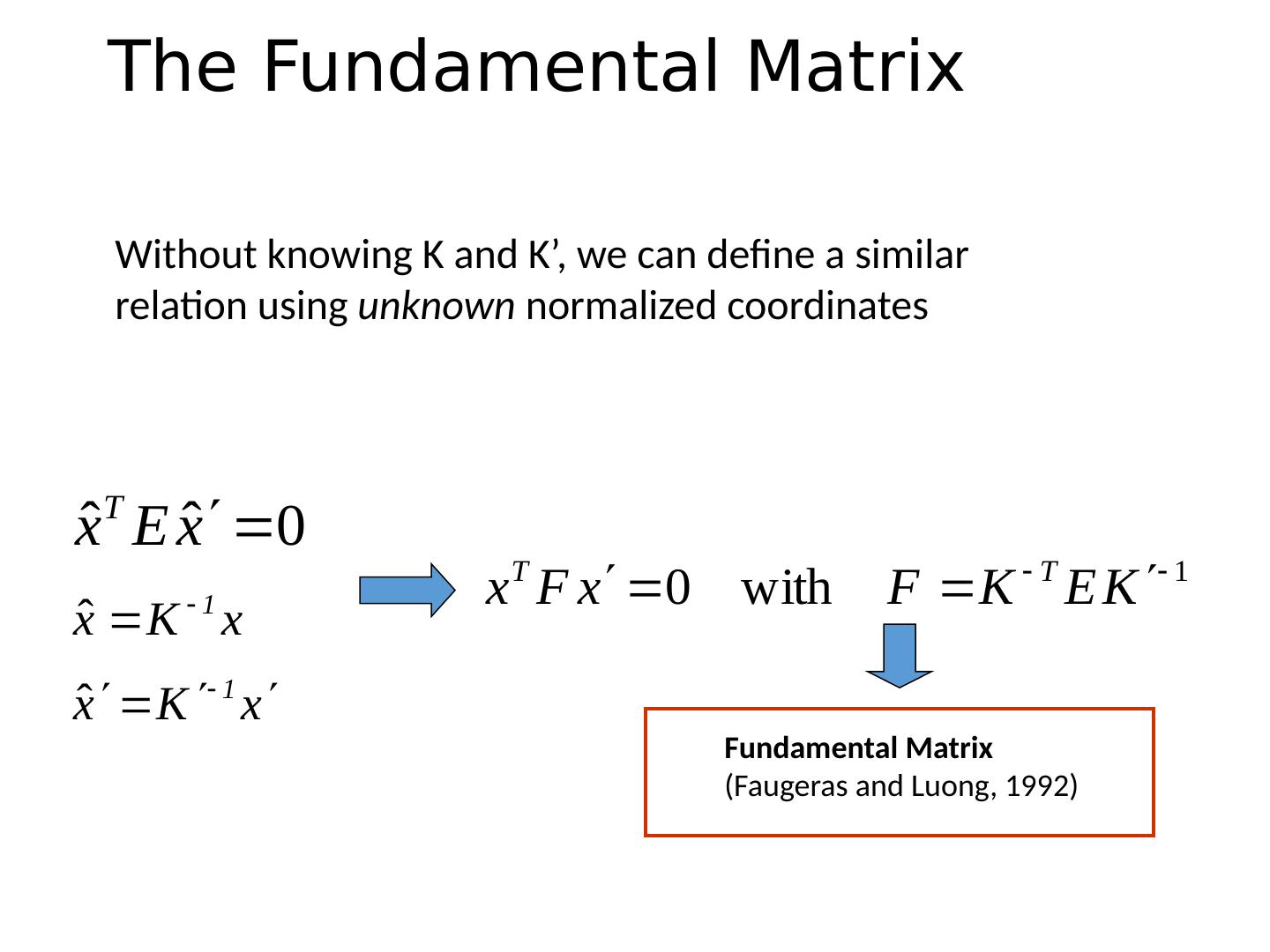 21 .The Fundamental Matrix Fundamental Matrix ( Faugeras and Luong , 1992) Without knowing K and K’, we can define a similar relation using unknown normalized coordinates