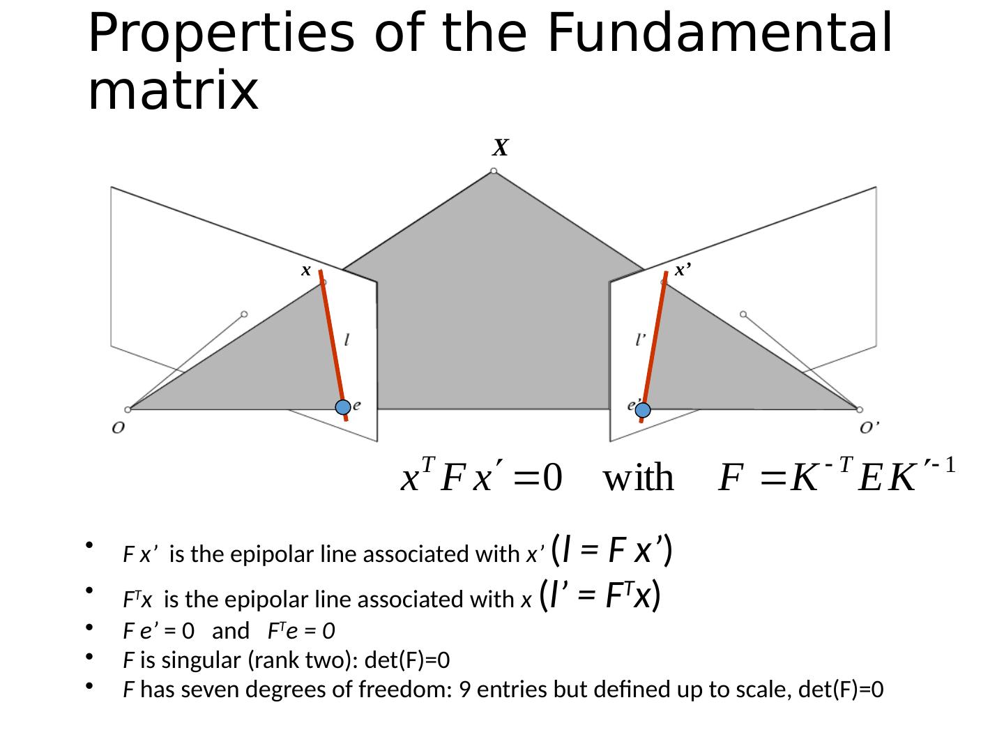 22 .Properties of the Fundamental matrix F x’ is the epipolar line associated with x’ ( l = F x’ ) F T x is the epipolar line associated with x ( l’ = F T x ) F e’ = 0 and F T e = 0 F is singular (rank two): det (F)=0 F has seven degrees of freedom: 9 entries but defined up to scale, det (F)=0 X x x’