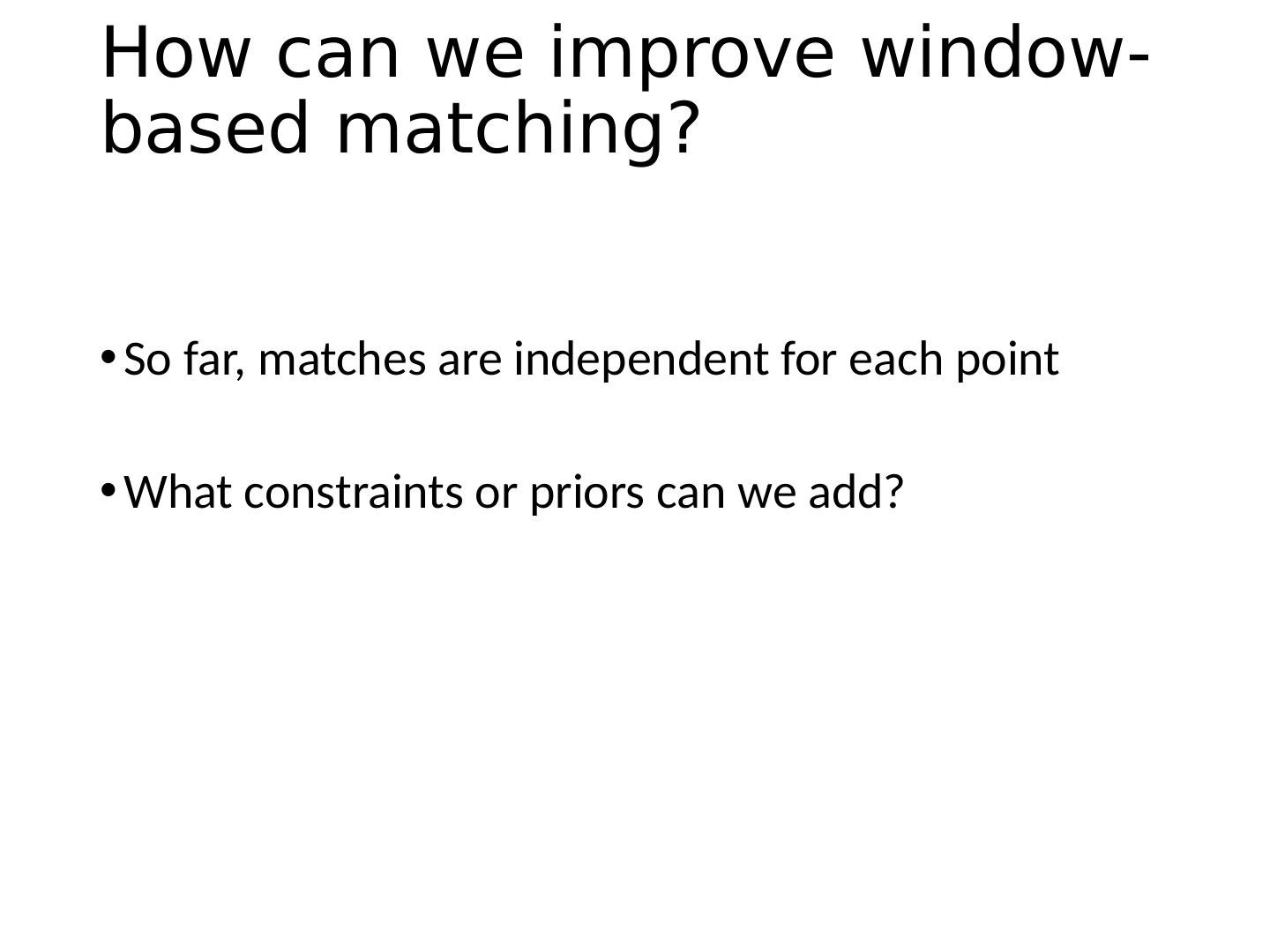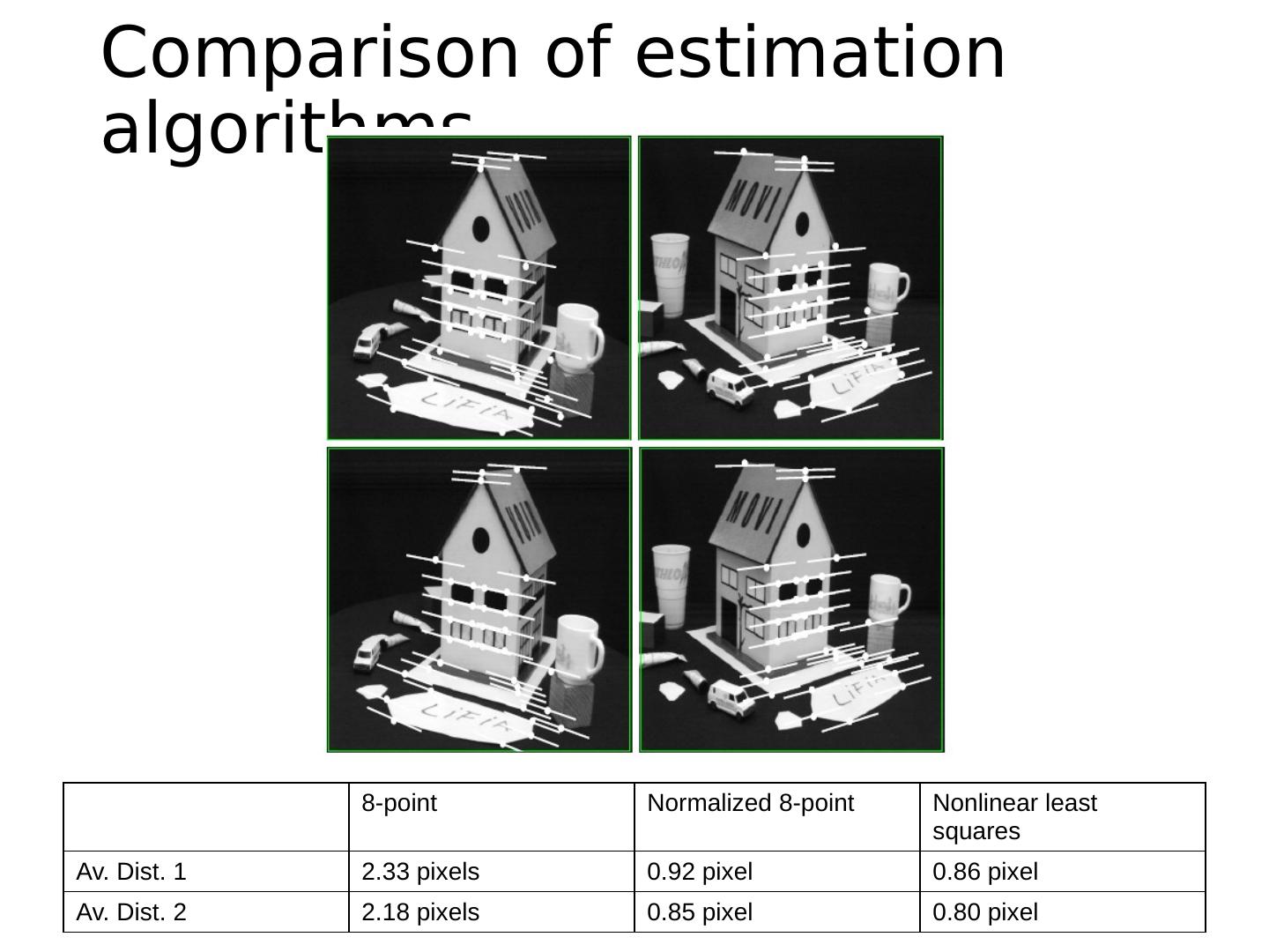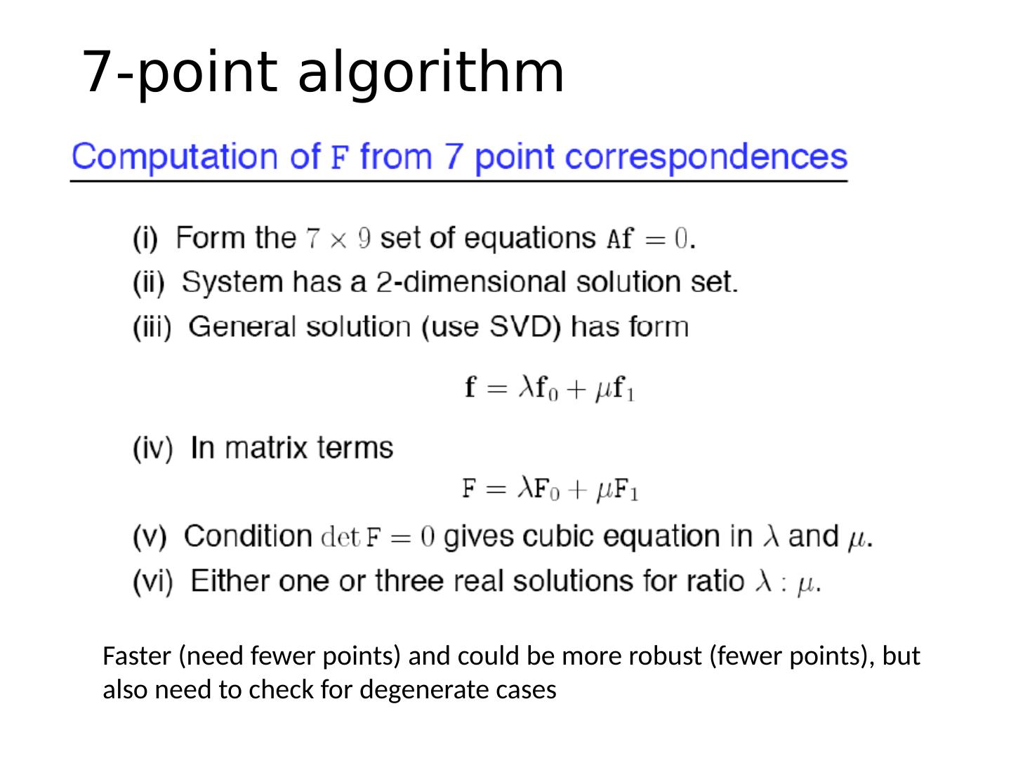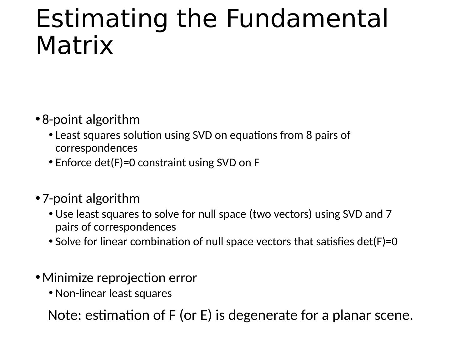 23 .Estimating the Fundamental Matrix 8-point algorithm Least squares solution using SVD on equations from 8 pairs of correspondences Enforce det (F)=0 constraint using SVD on F 7-point algorithm Use least squares to solve for null space (two vectors) using SVD and 7 pairs of correspondences Solve for linear combination of null space vectors that satisfies det (F)=0 Minimize reprojection error Non-linear least squares Note: estimation of F (or E) is degenerate for a planar scene.