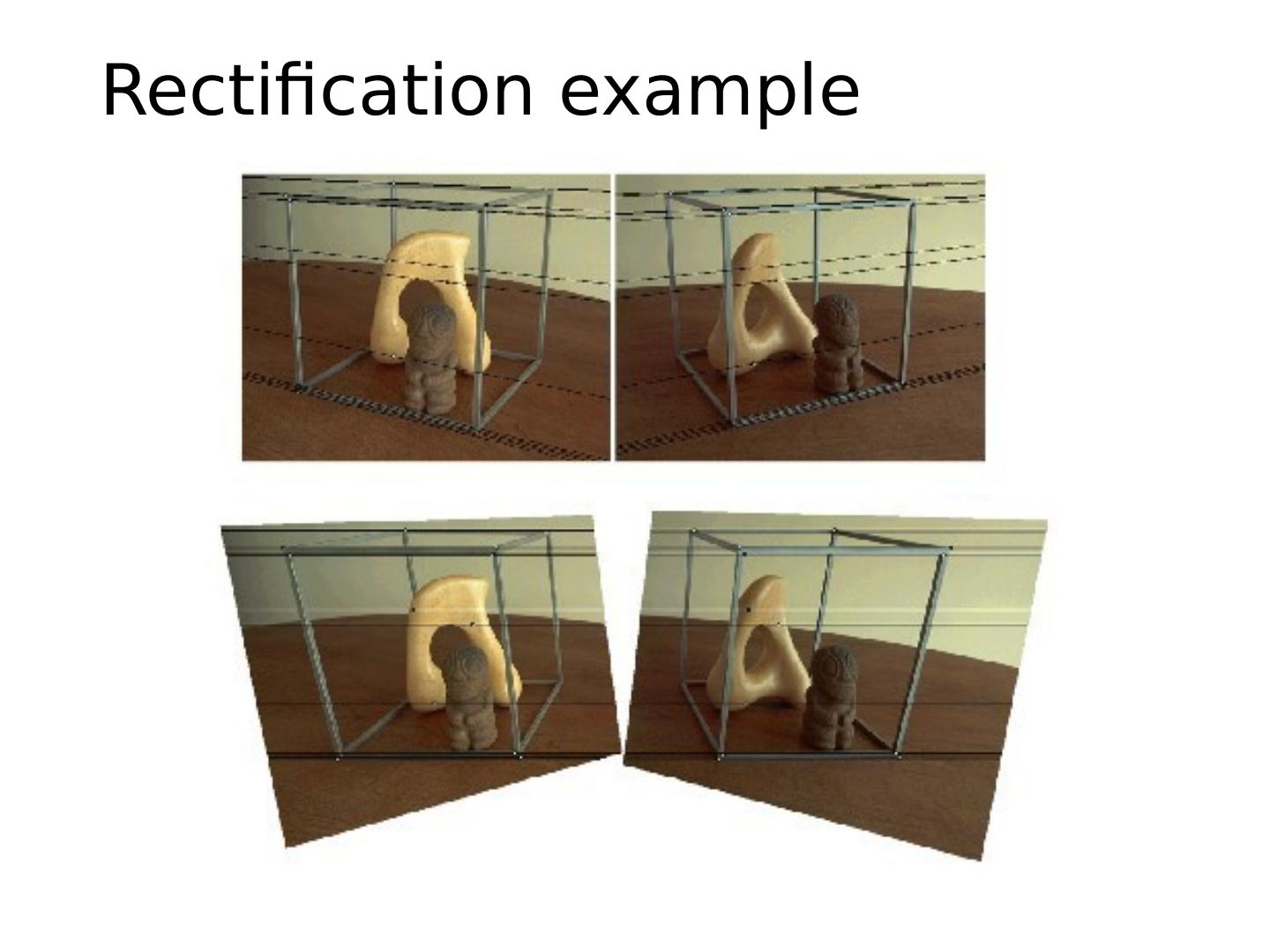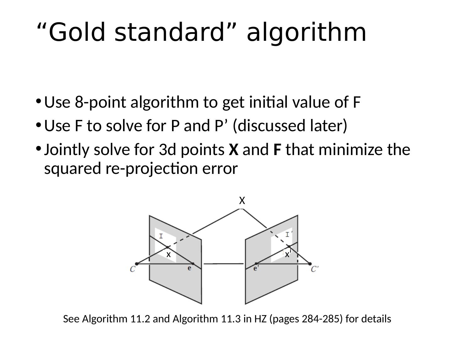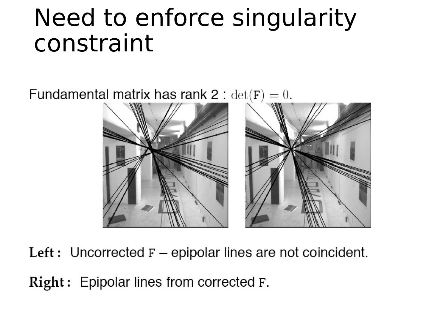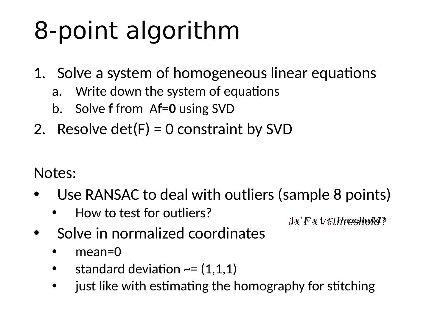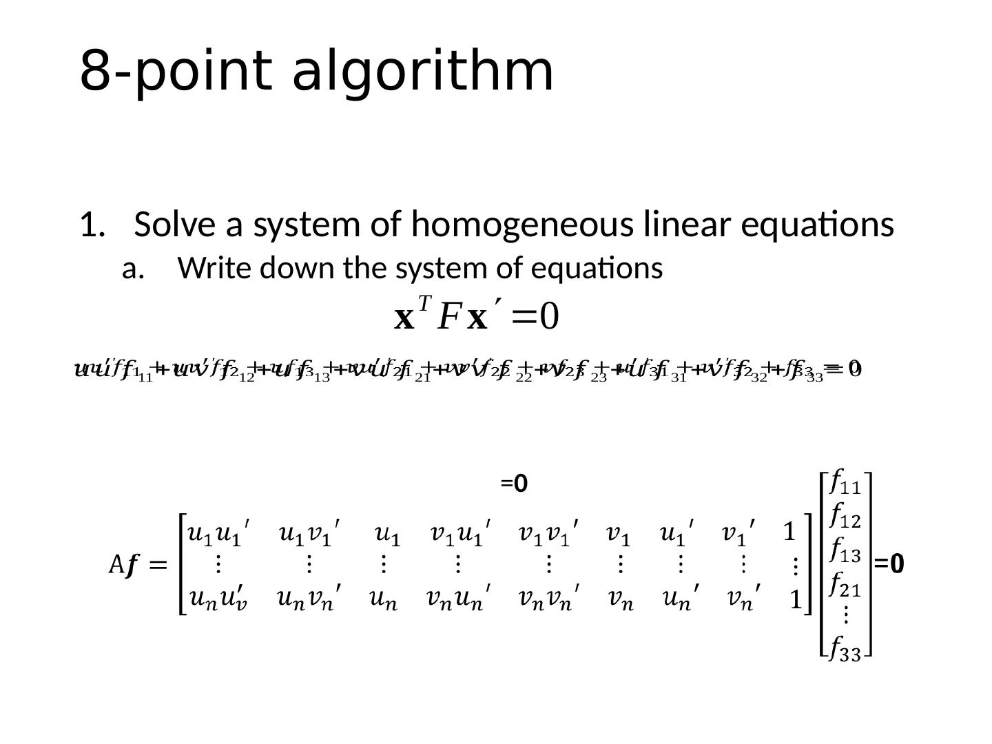 25 .8-point algorithm Solve a system of homogeneous linear equations Write down the system of equations Solve f from A f = 0 using SVD Matlab : [U, S, V] = svd (A); f = V(:, end); F = reshape(f, [3 3])’;
