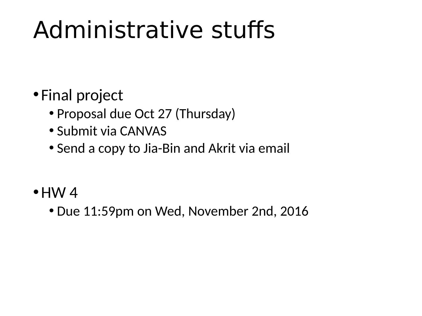 2 .Administrative stuffs Final project Proposal due Oct 27 (Thursday ) Submit via CANVAS Send a copy to Jia-Bin and Akrit via email HW 4 Due 11:59pm on Wed, November 2nd, 2016