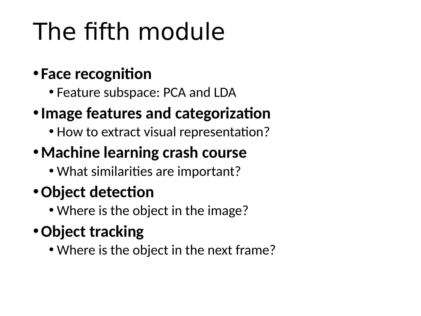 3 .The fifth module Face recognition Feature subspace: PCA and LDA Image features and categorization How to extract visual representation? Machine learning crash course What similarities are important ? Object detection Where is the object in the image? Object tracking Where is the object in the next frame?