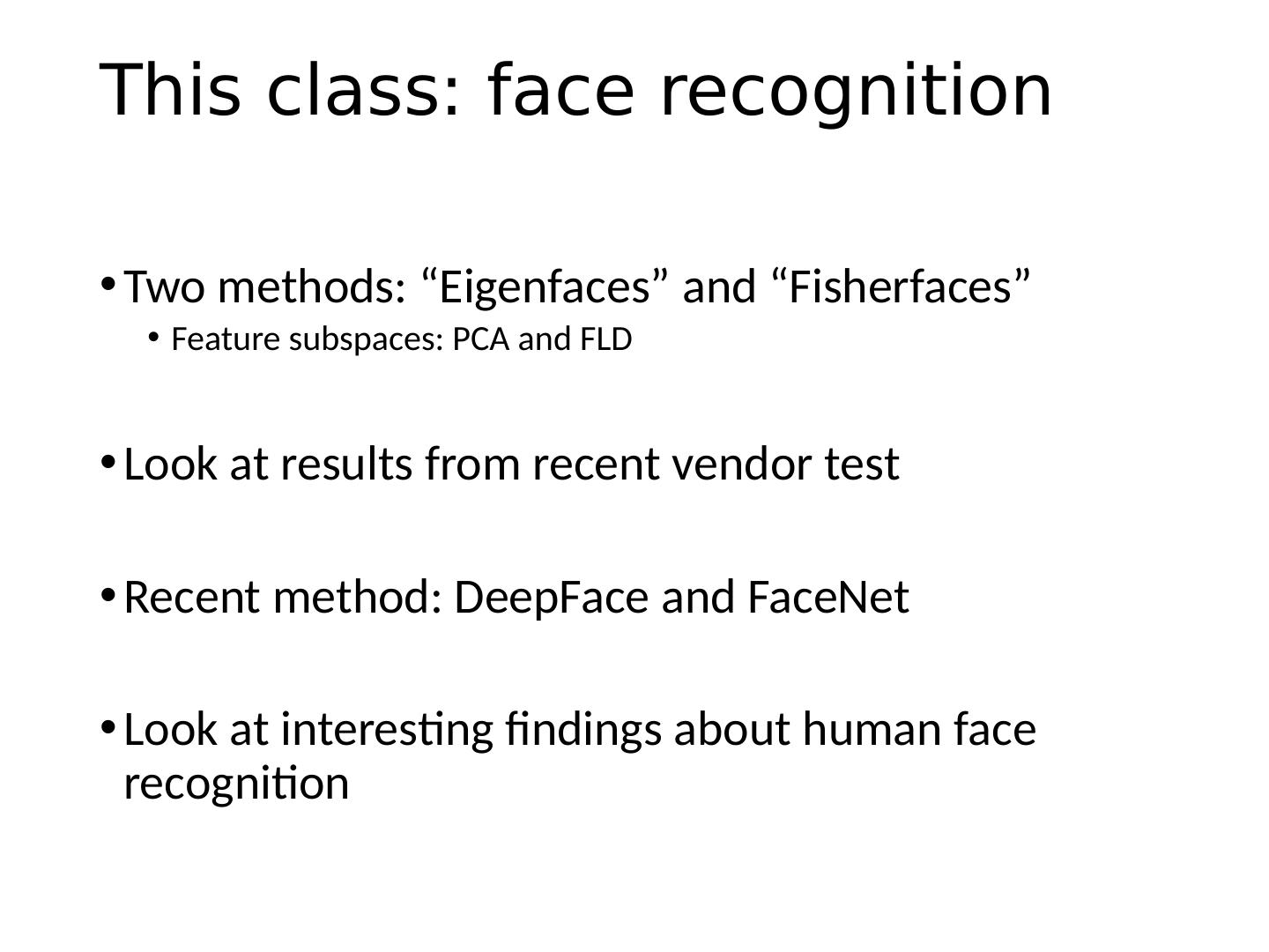 4 .This class: face recognition Two methods: “Eigenfaces” and “ Fisherfaces ” Feature subspaces: PCA and FLD Look at results from recent vendor test Recent method: DeepFace and FaceNet Look at interesting findings about human face recognition