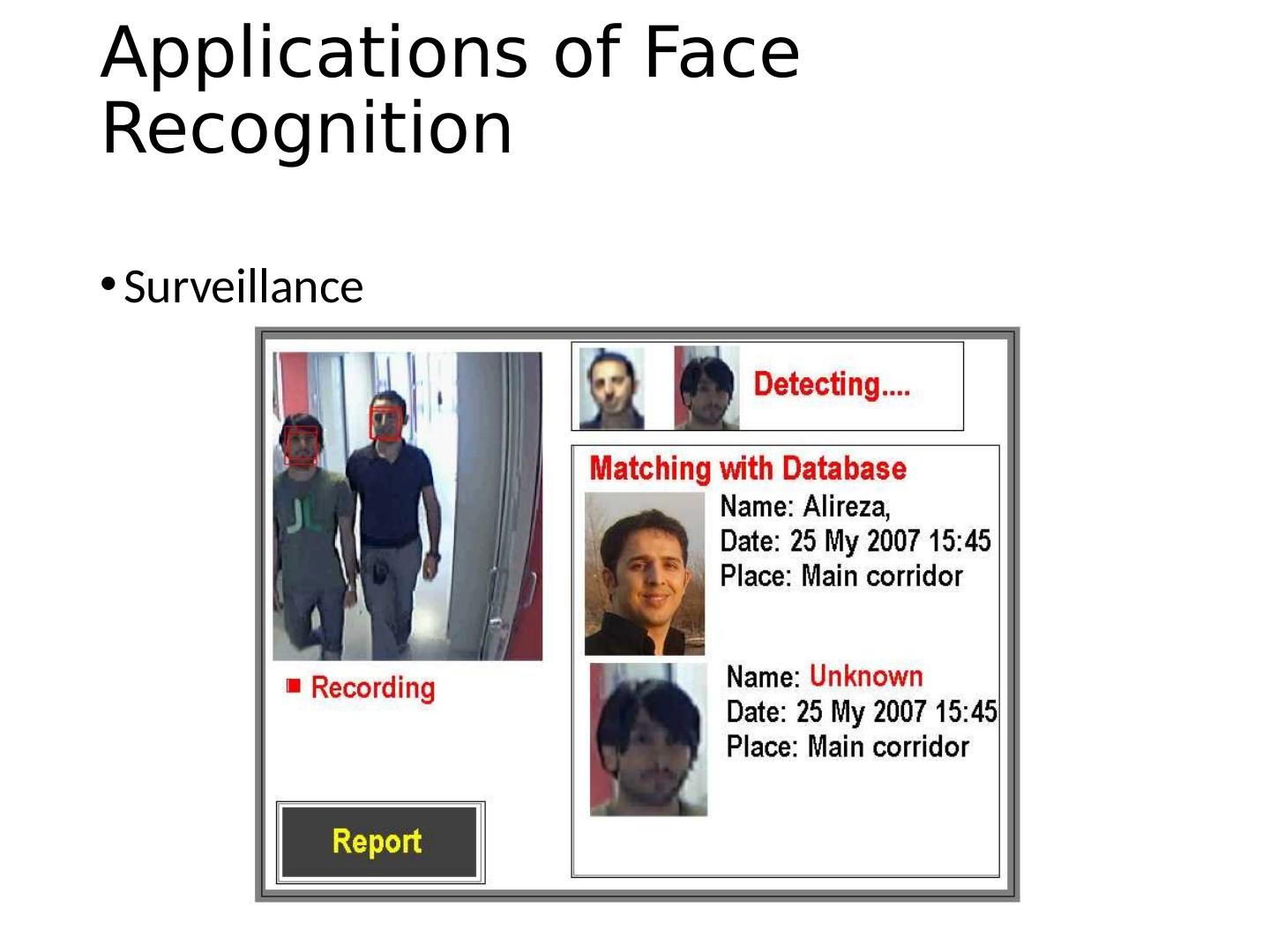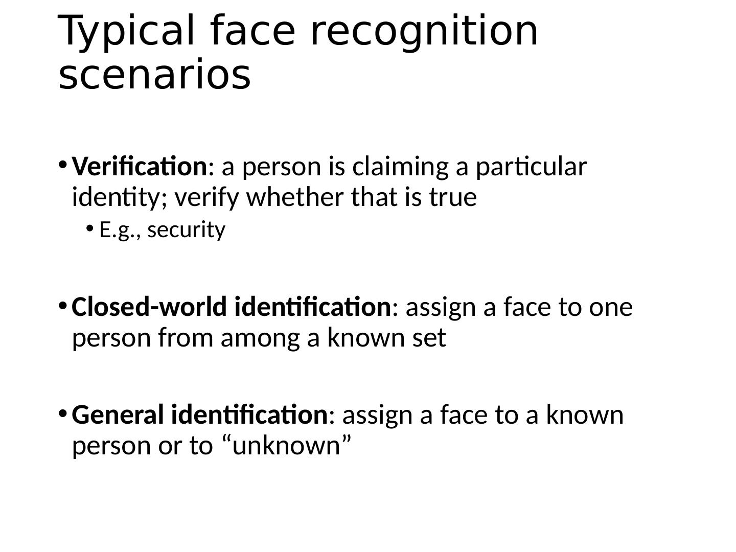 11 .Typical face recognition scenarios Verification : a person is claiming a particular identity; verify whether that is true E.g., security Closed-world identification : assign a face to one person from among a known set General identification : assign a face to a known person or to “unknown”