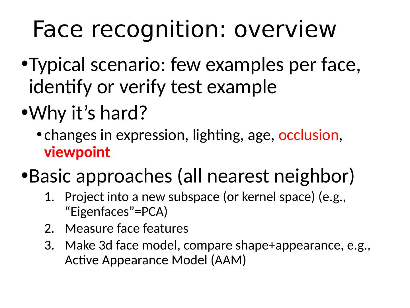 10 .Face recognition: overview Typical scenario: few examples per face, identify or verify test example Why it’s hard? changes in expression, lighting, age, occlusion , viewpoint Basic approaches (all nearest neighbor) Project into a new subspace (or kernel space) (e.g., “ Eigenfaces ”=PCA) Measure face features Make 3d face model, compare shape+appearance , e.g., Active Appearance Model (AAM)