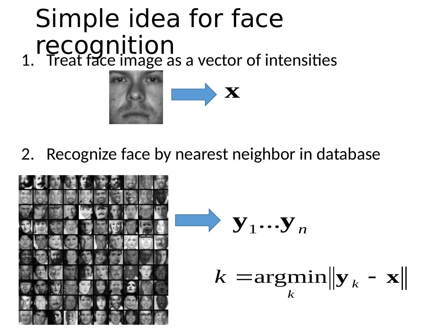 16 .Simple idea for face recognition Treat face image as a vector of intensities Recognize face by nearest neighbor in database