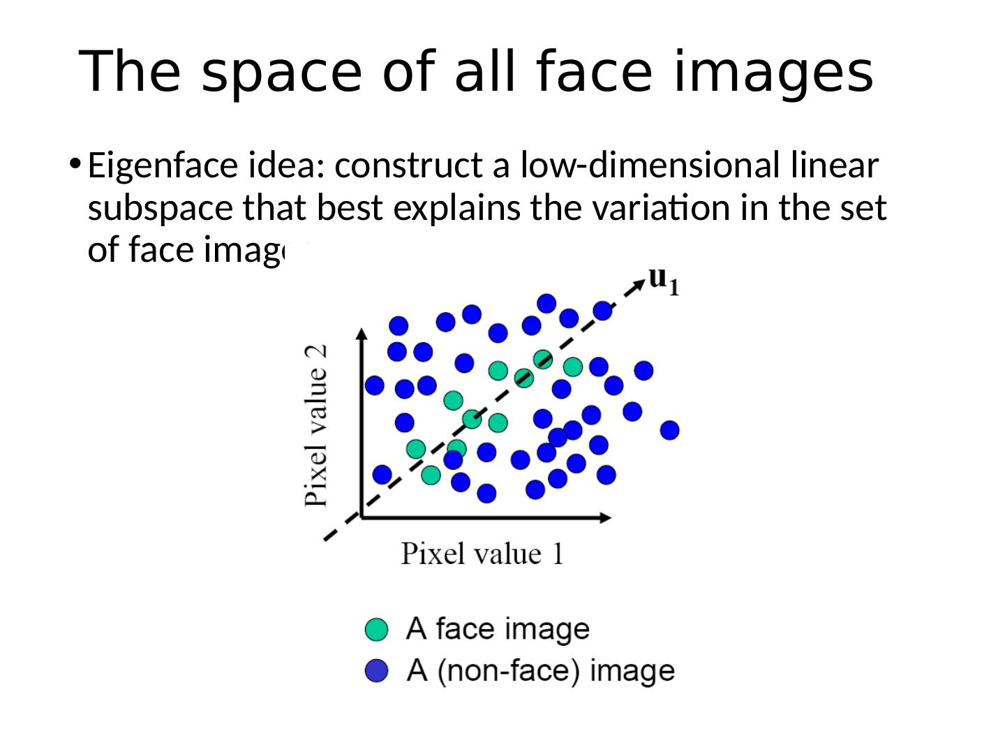 17 .The space of all face images When viewed as vectors of pixel values, face images are extremely high-dimensional 100x100 image = 10,000 dimensions Slow and lots of storage But very few 10,000-dimensional vectors are valid face images We want to effectively model the subspace of face images