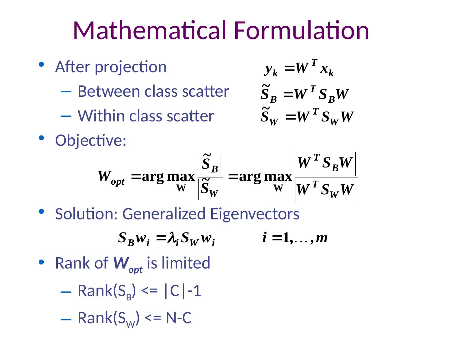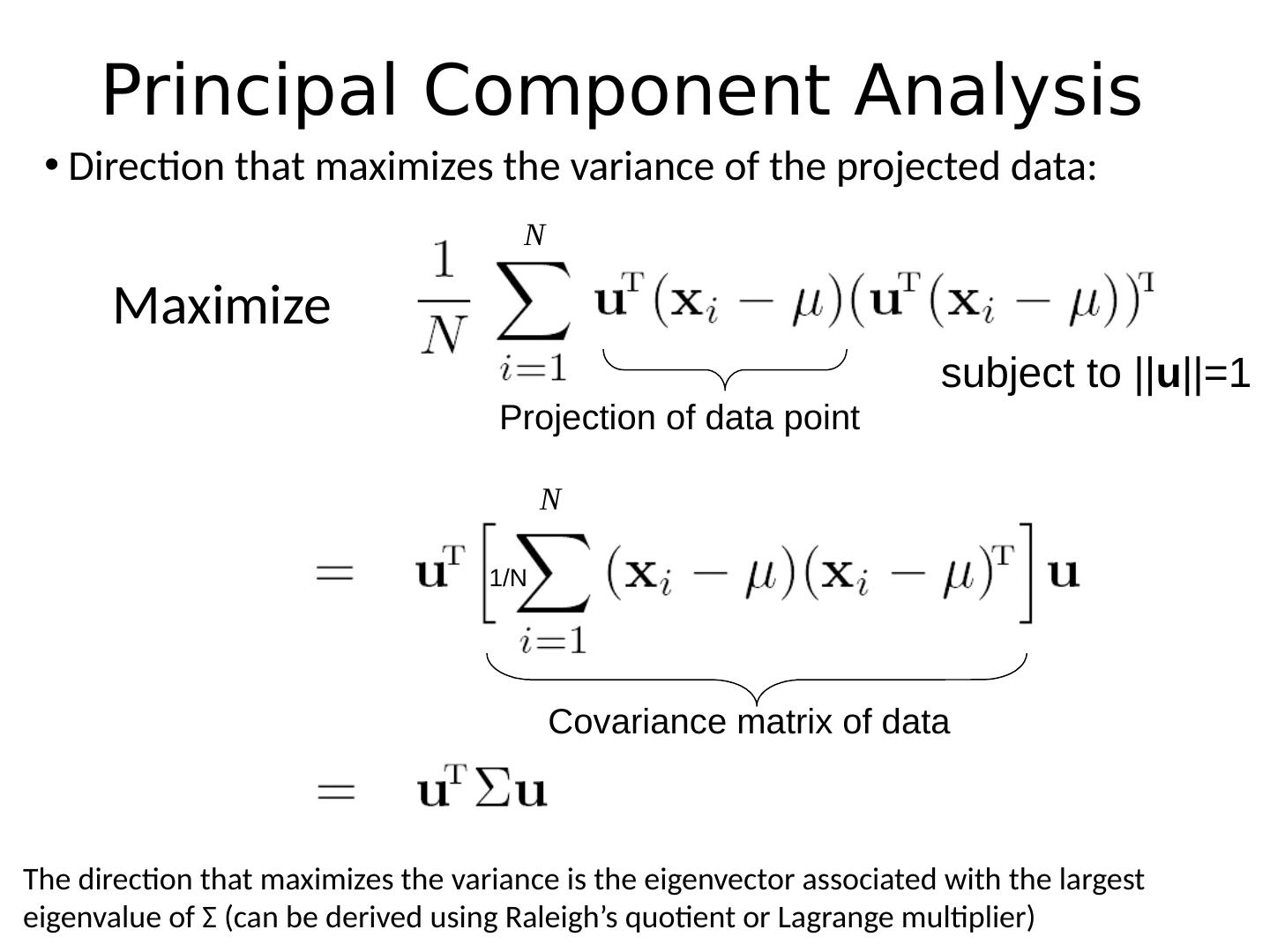 20 .Principal Component Analysis Direction that maximizes the variance of the projected data: Projection of data point Covariance matrix of data The direction that maximizes the variance is the eigenvector associated with the largest eigenvalue of Σ (can be derived using Raleigh’s quotient or Lagrange multiplier) N N 1/N Maximize subject to || u ||=1