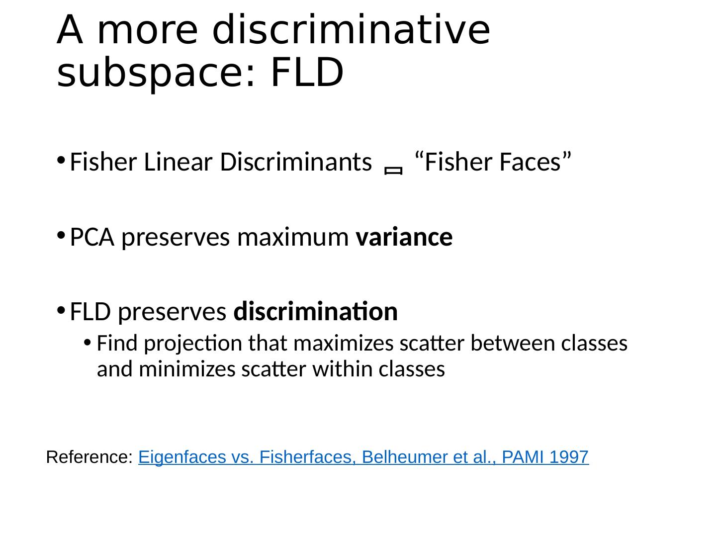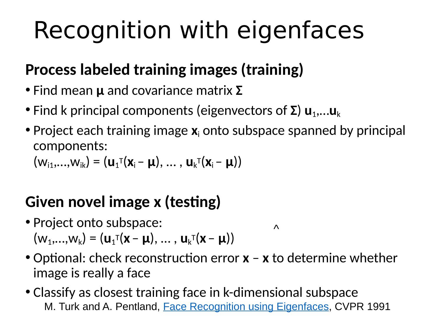22 .Eigenfaces (PCA on face images) Compute the principal components (“ eigenfaces ”) of the covariance matrix Keep K eigenvectors with largest eigenvalues Represent all face images in the dataset as linear combinations of eigenfaces Perform nearest neighbor on these coefficients M. Turk and A. Pentland , Face Recognition using Eigenfaces , CVPR 1991