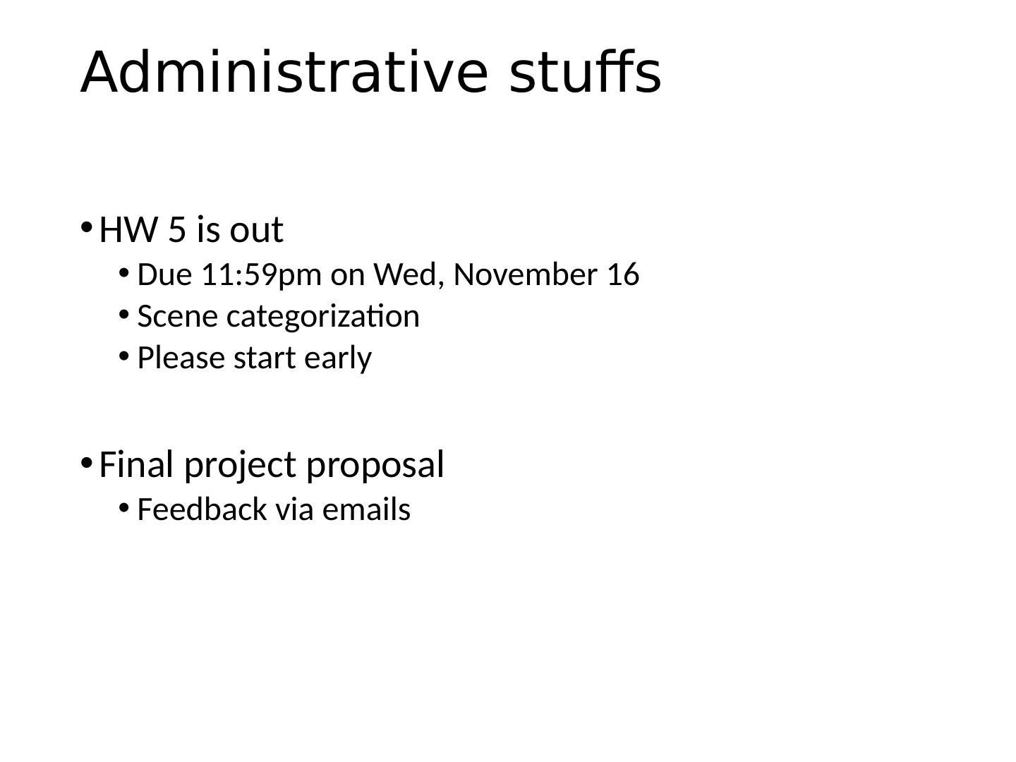 2 .Administrative stuffs HW 5 is out Due 11:59pm on Wed, November 16 Scene categorization Please s tart early Final project proposal Feedback via email s