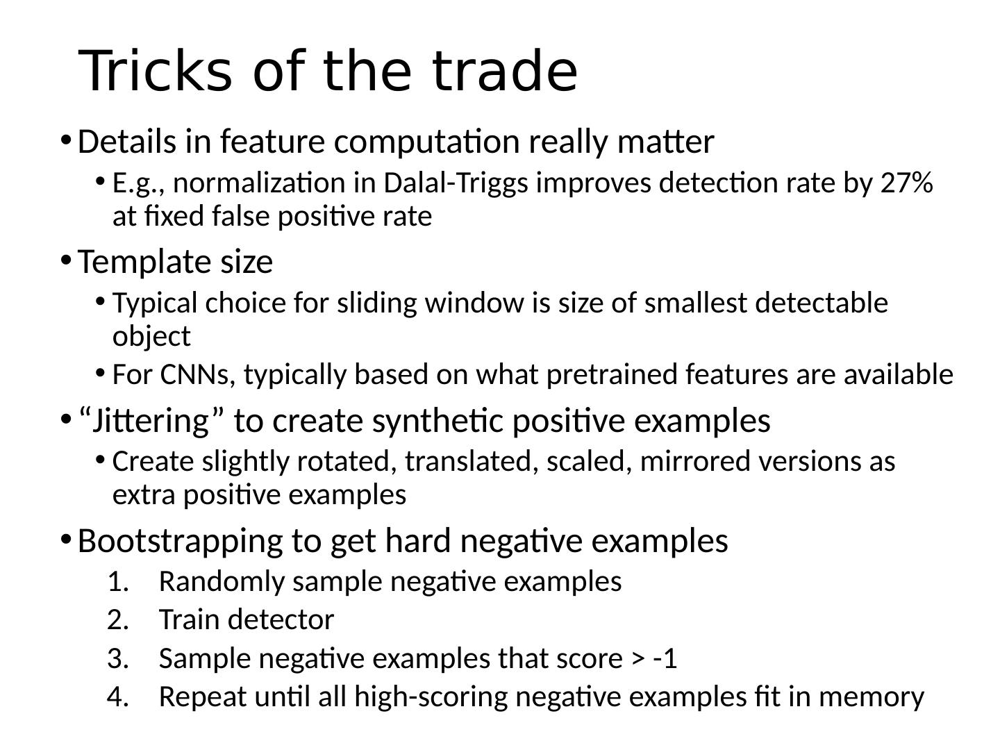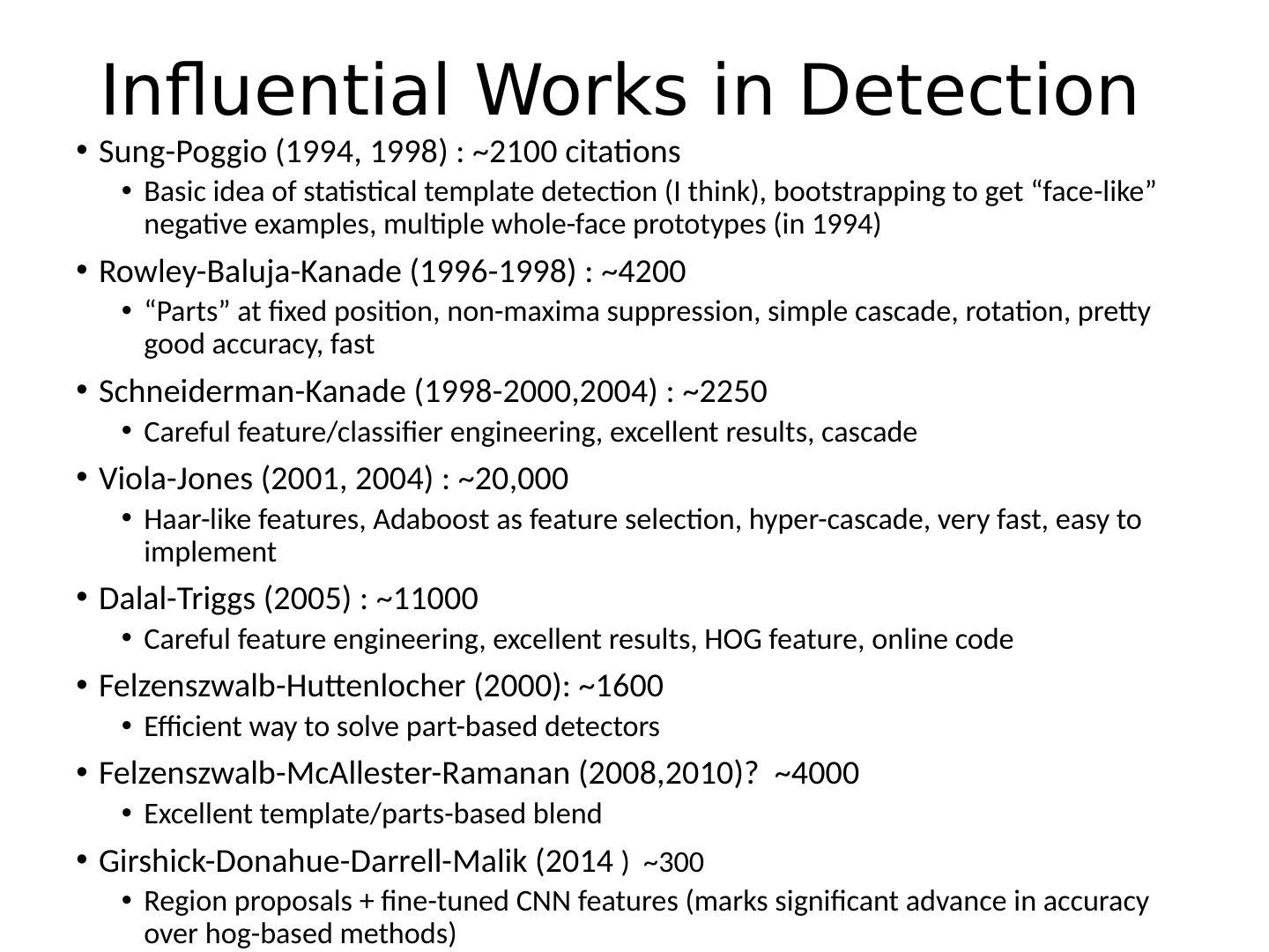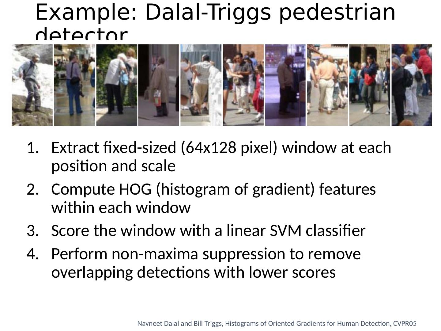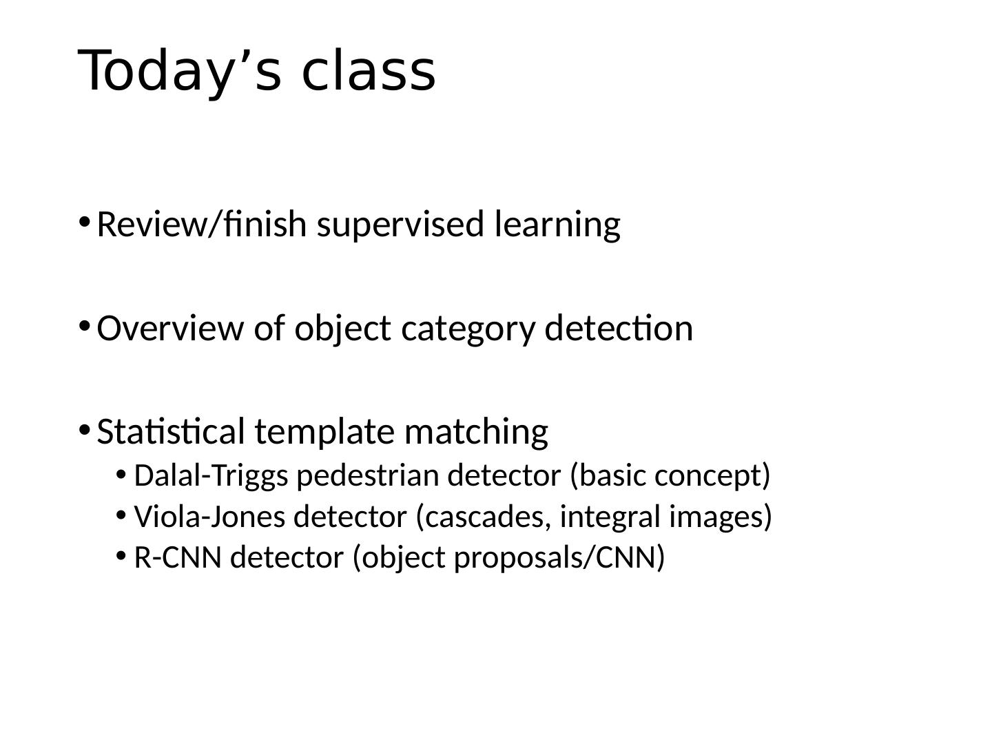 3 .Today’s class Review/finish supervised learning Overview of object category detection Statistical template matching Dalal-Triggs pedestrian detector (basic concept) Viola-Jones detector (cascades, integral images) R-CNN detector (object proposals/CNN)