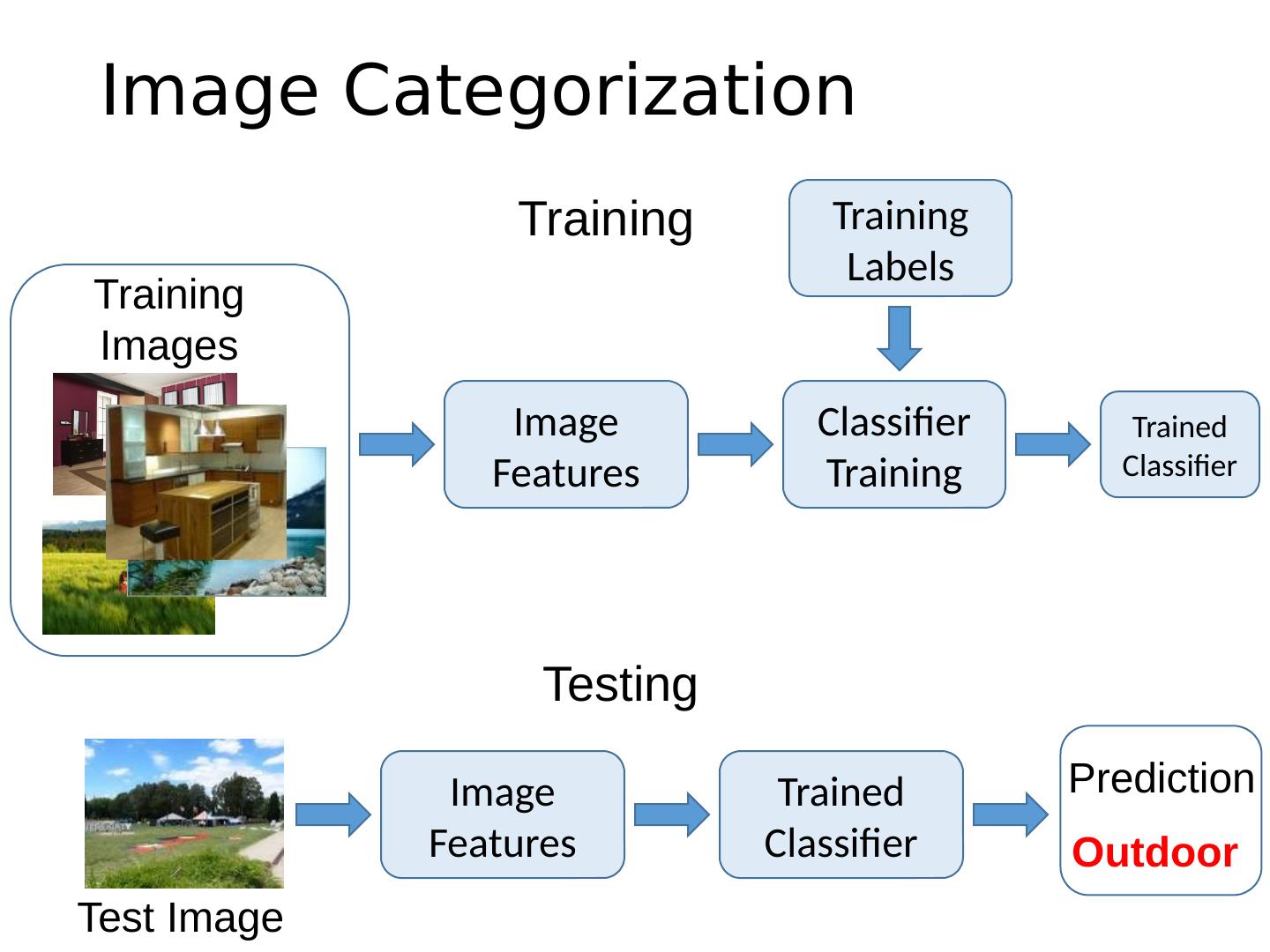 5 .Image Categorization Training Labels Training Images Classifier Training Training Image Features Image Features Testing Test Image Trained Classifier Trained Classifier Outdoor Prediction