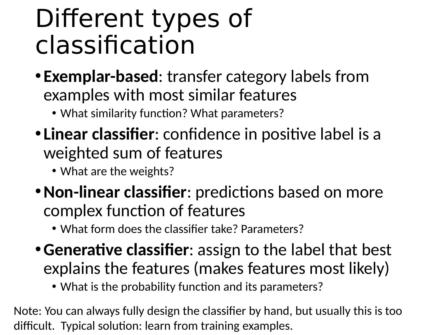 7 .Different types of classification Exemplar-based : transfer category labels from examples with most similar features What similarity function? What parameters? Linear classifier : confidence in positive label is a weighted sum of features What are the weights? Non-linear classifier : predictions based on more complex function of features What form does the classifier take? Parameters? Generative classifier : assign to the label that best explains the features (makes features most likely) What is the probability function and its parameters? Note: You can always fully design the classifier by hand, but usually this is too difficult. Typical solution: learn from training examples.