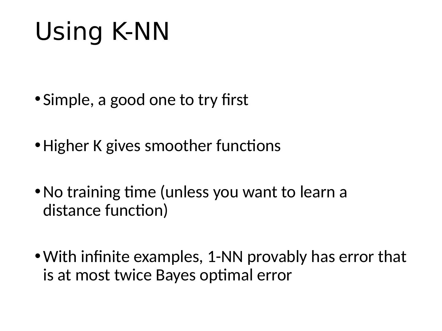 13 .Using K-NN Simple, a good one to try first Higher K gives smoother functions No training time (unless you want to learn a distance function) With infinite examples, 1-NN provably has error that is at most twice Bayes optimal error