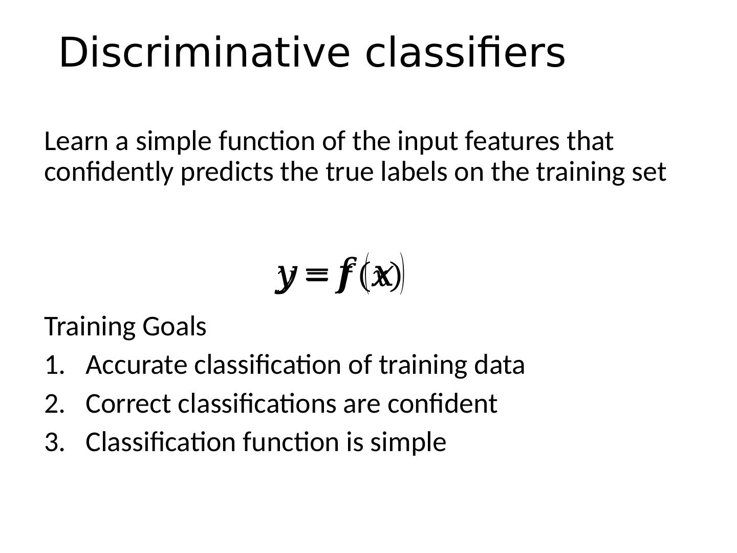 14 .Discriminative classifiers Learn a simple function of the input features that confidently predicts the true labels on the training set Training Goals Accurate classification of training data Correct classifications are confident Classification function is simple