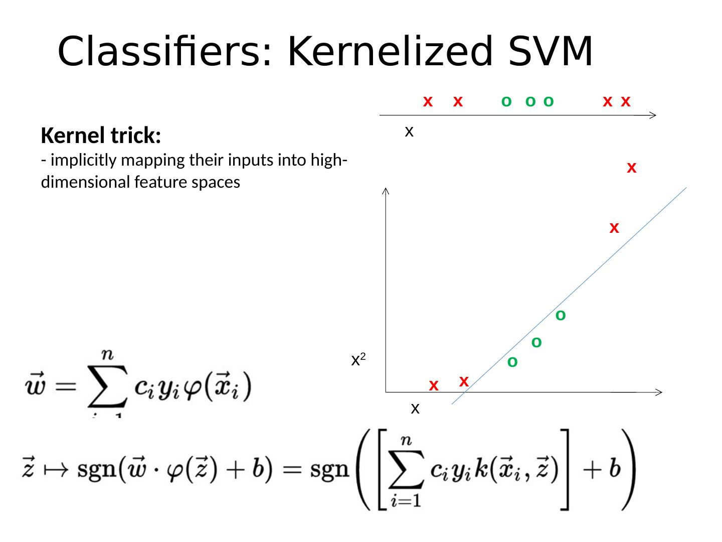 18 .Classifiers: Kernelized SVM x x x x o o o x x x x x o o o x x 2 Kernel trick: - implicitly mapping their inputs into high-dimensional feature spaces