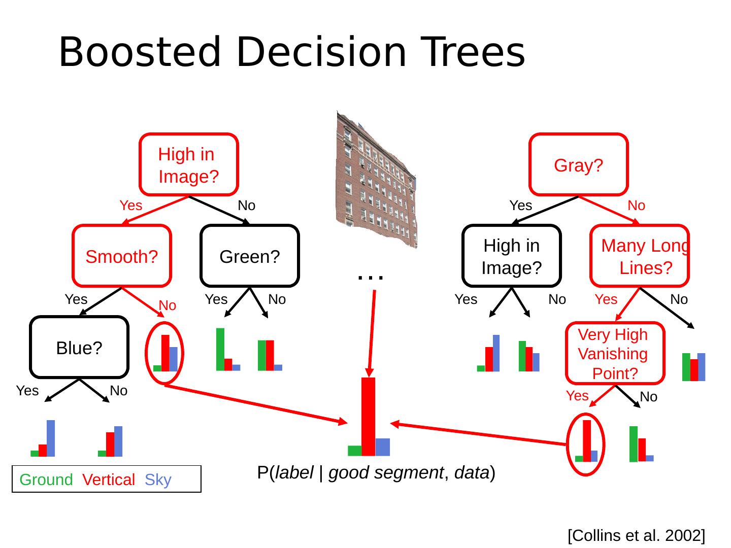 22 .Boosted Decision Trees … Gray? High in Image? Many Long Lines? Yes No No No No Yes Yes Yes Very High Vanishing Point? High in Image? Smooth? Green? Blue? Yes No No No No Yes Yes Yes Ground Vertical Sky [Collins et al. 2002] P( label | good segment , data )