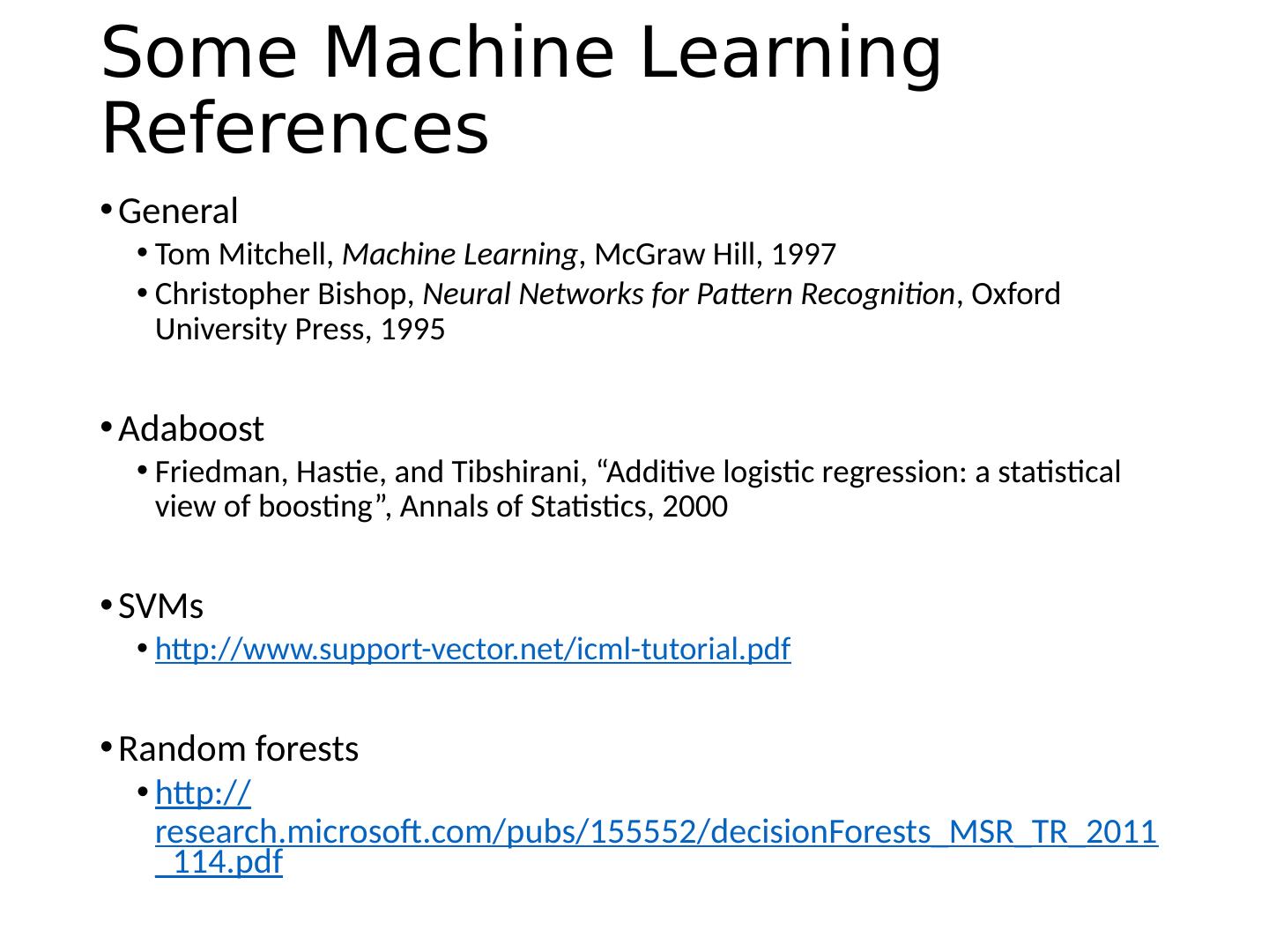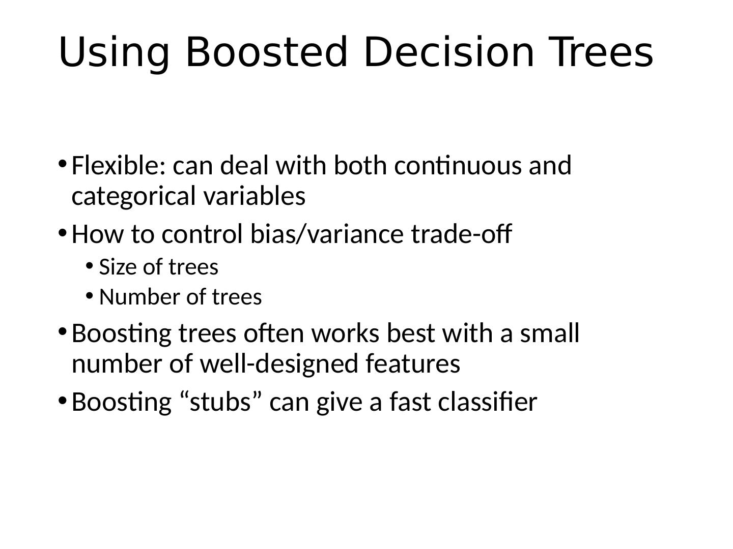 23 .Using Boosted Decision Trees Flexible: can deal with both continuous and categorical variables How to control bias/variance trade-off Size of trees Number of trees Boosting trees often works best with a small number of well-designed features Boosting “stubs” can give a fast classifier