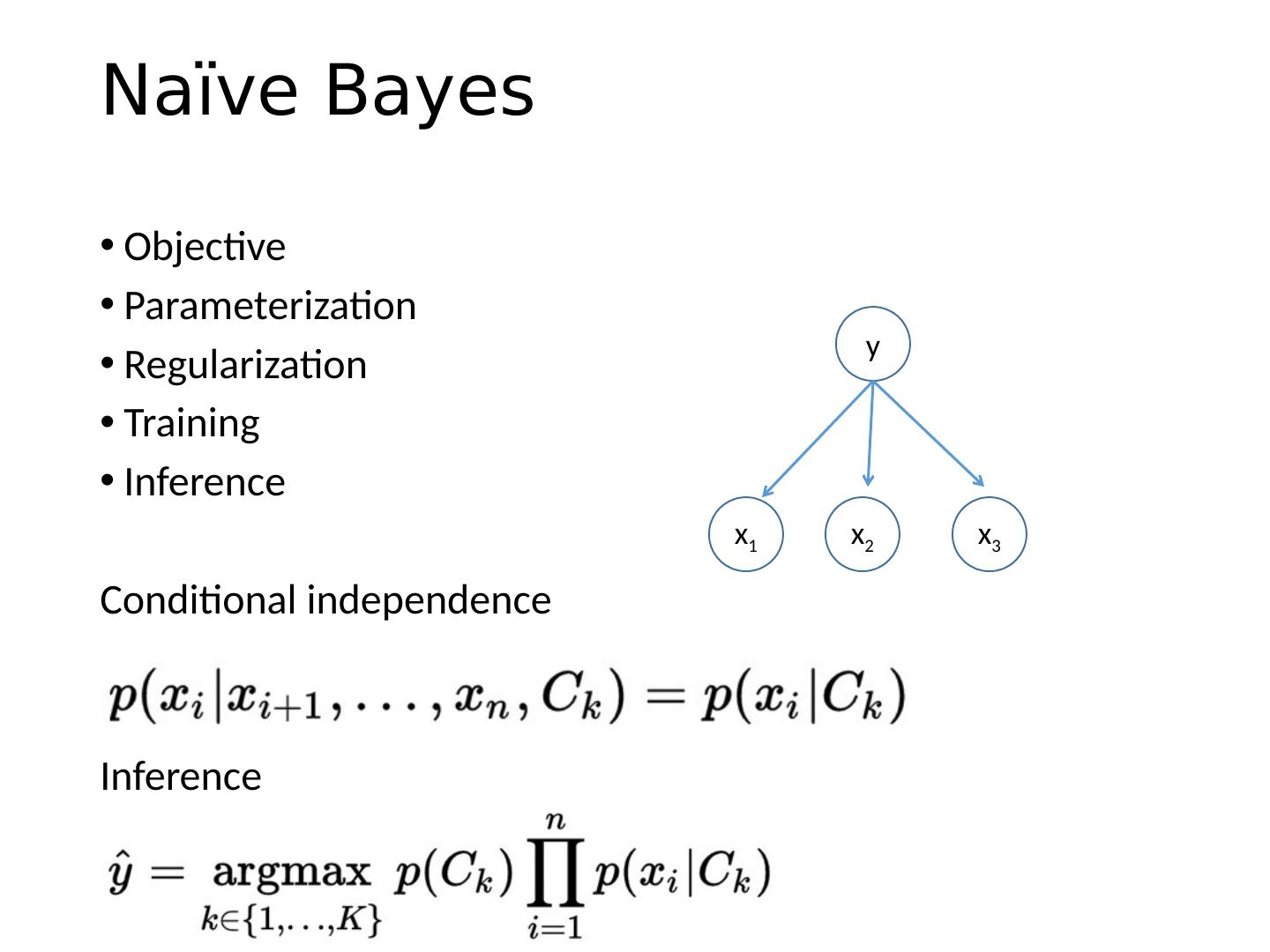 25 .Naïve Bayes Objective Parameterization Regularization Training Inference Conditional independence Inference x 1 x 2 x 3 y