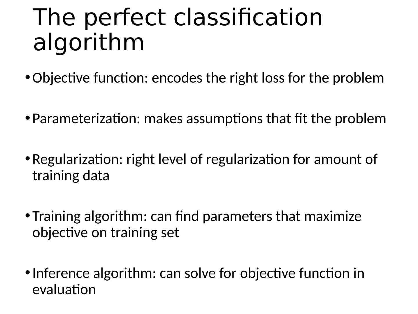 15 .Classifiers: Logistic Regression Objective Parameterization Regularization Training Inference x x x x x x x x o o o o o x2 x1 The objective function of most discriminative classifiers includes a loss term and a regularization term .