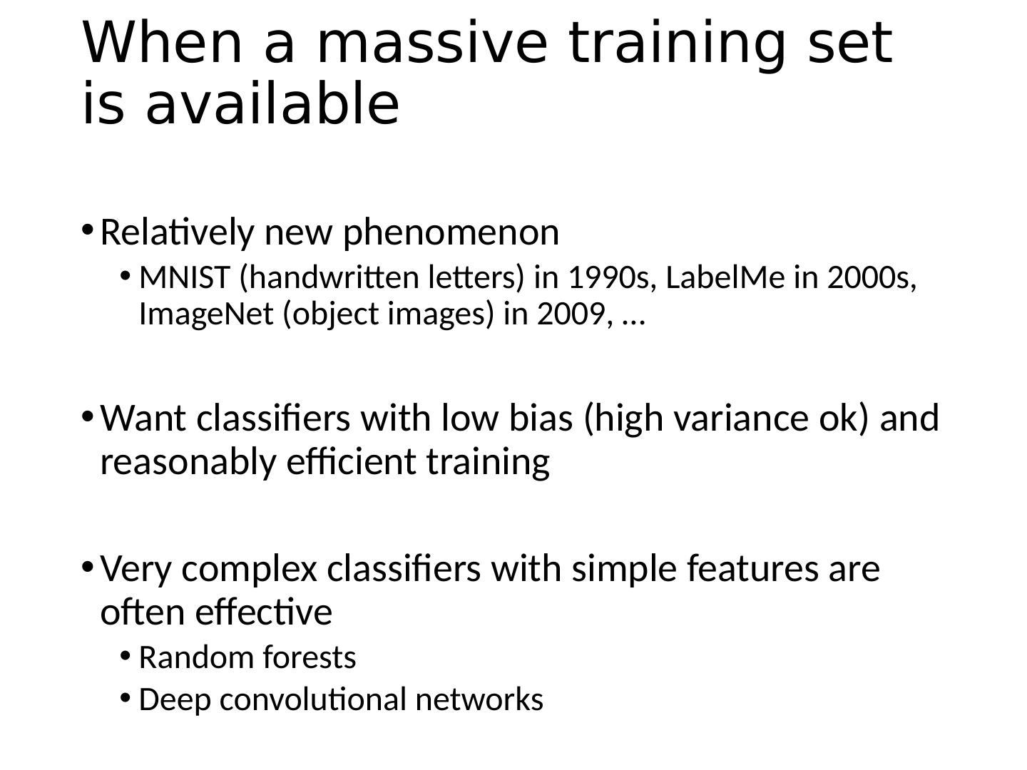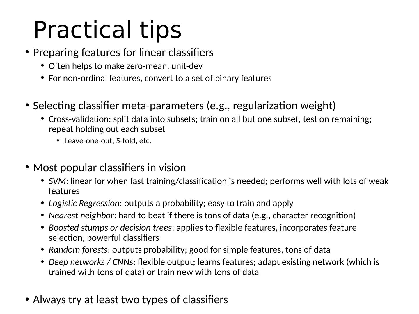 19 .Using SVMs Good general purpose classifier Generalization depends on margin, so works well with many weak features No feature selection Usually requires some parameter tuning Choosing kernel Linear: fast training/testing – start here RBF: related to neural networks, nearest neighbor Chi-squared, histogram intersection: good for histograms (but slower, esp. chi-squared) Can learn a kernel function
