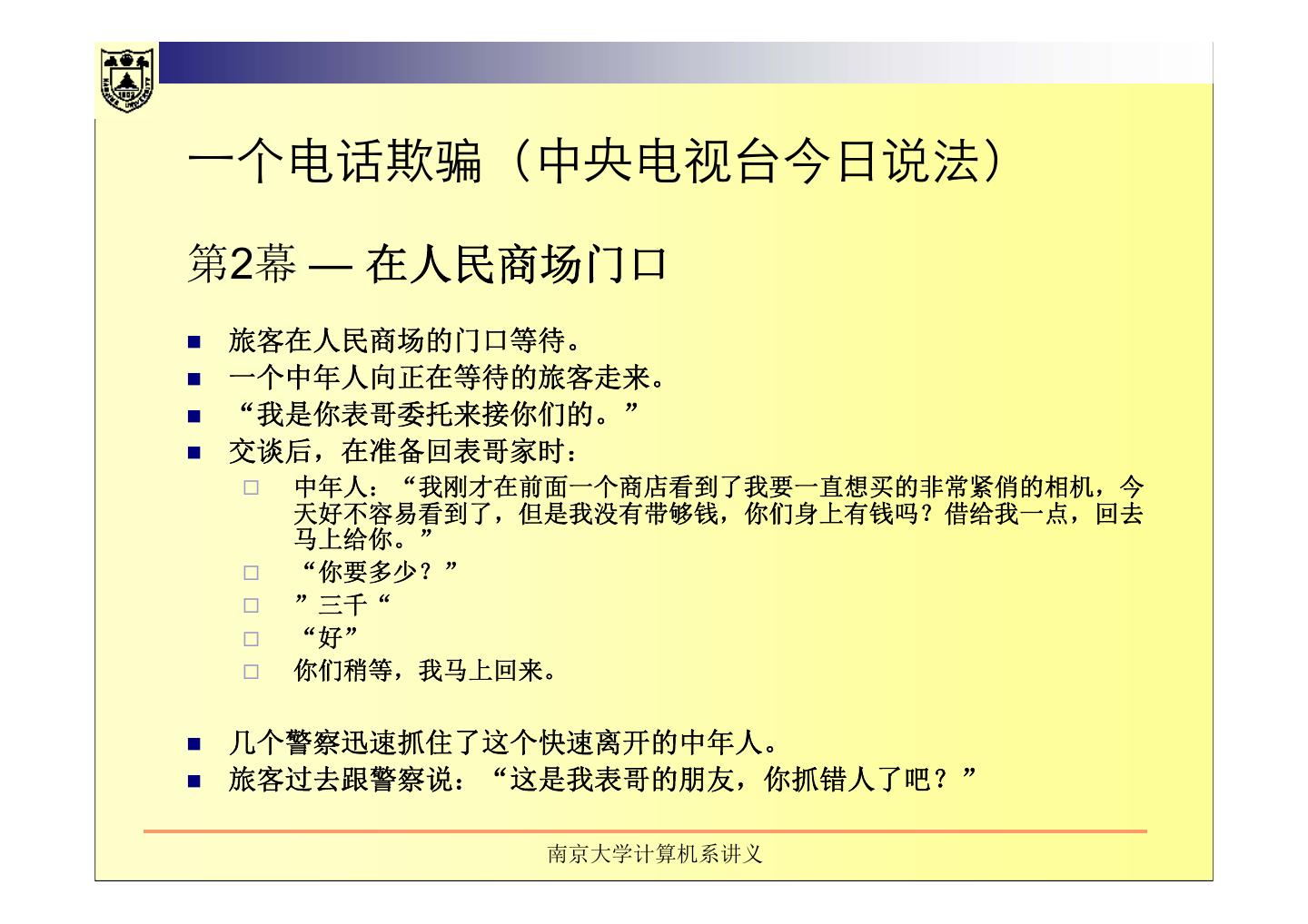 4 .一个电话欺骗(中央电视台今日说法) 第2幕 — 在人民商场门口 旅客在人民商场的门口等待。 一个中年人向正在等待的旅客走来。 “我是你表哥委托来接你们的。” 交谈后,在准备回表哥家时: 中年人:“我刚才在前面一个商店看到了我要一直想买的非常紧俏的相机,今 天好不容易看到了,但是我没有带够钱,你们身上有钱吗?借给我一点,回去 马上给你。” “你要多少?” ”三千“ “好” 你们稍等,我马上回来。 几个警察迅速抓住了这个快速离开的中年人。 旅客过去跟警察说:“这是我表哥的朋友,你抓错人了吧?” 南京大学计算机系讲义