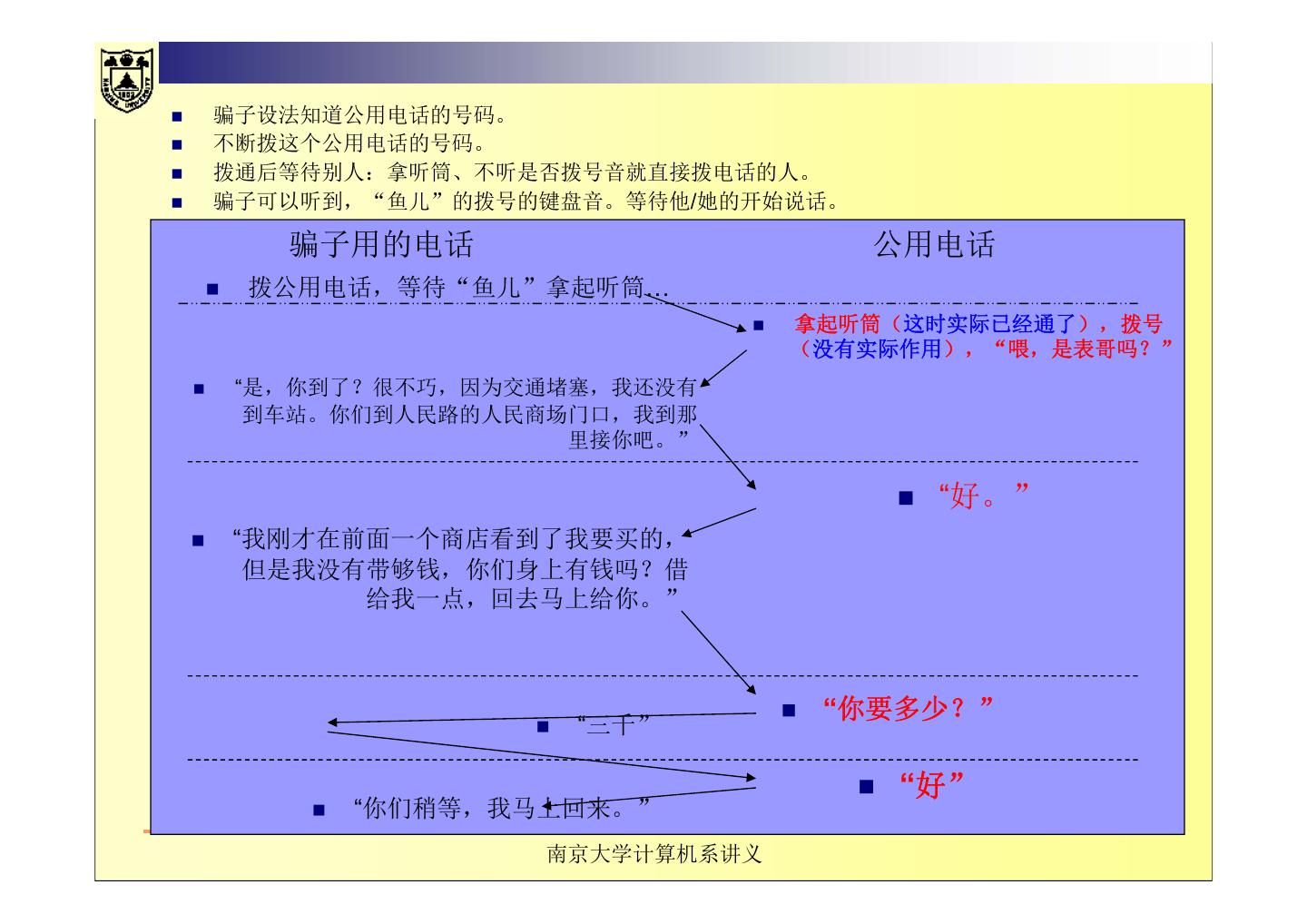 3 . 一个电话欺骗(中央电视台今日说法) 第1幕 — 在火车站 一个计划到上海的给孩子看病的旅客到达了上海站。 他到公用电话处,拿起电话听筒,拨打在上海的亲戚的电话。 旅客:“喂,是表哥吗?” 听筒传出:“是,你到了?很不巧,因为交通堵塞,我还没有到车站。你们 到人民路的人民商场门口,我到那里接你吧。” 旅客:“好。” 南京大学计算机系讲义