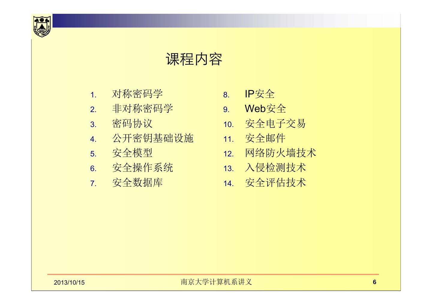6 . 课程内容 1. 对称密码学 8. IP安全 2. 非对称密码学 9. Web安全 3. 密码协议 10. 安全电子交易 4. 公开密钥基础设施 11. 安全邮件 5. 安全模型 12. 网络防火墙技术 6. 安全操作系统 13. 入侵检测技术 7. 安全数据库 14. 安全评估技术 2013/10/15 南京大学计算机系讲义 6