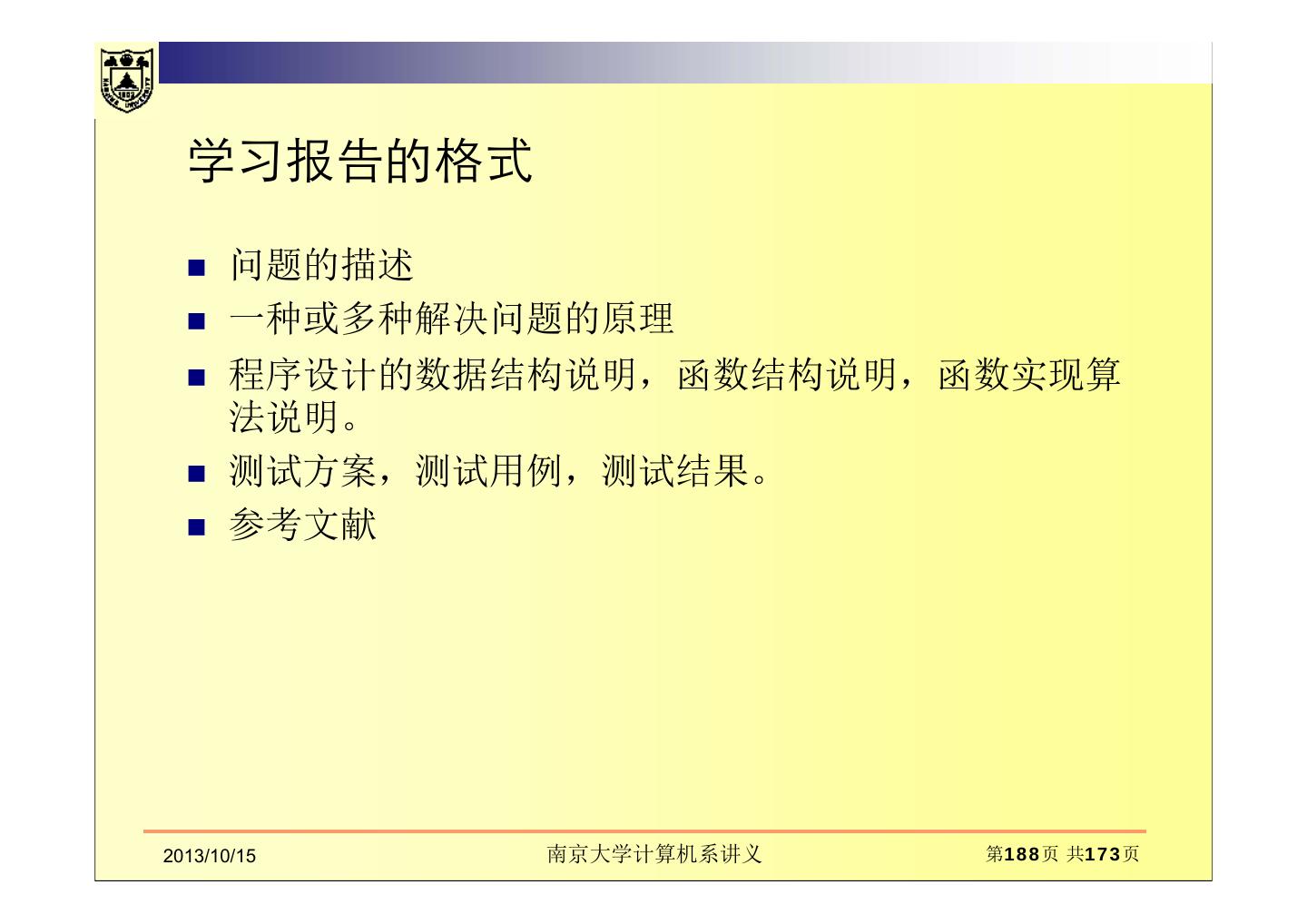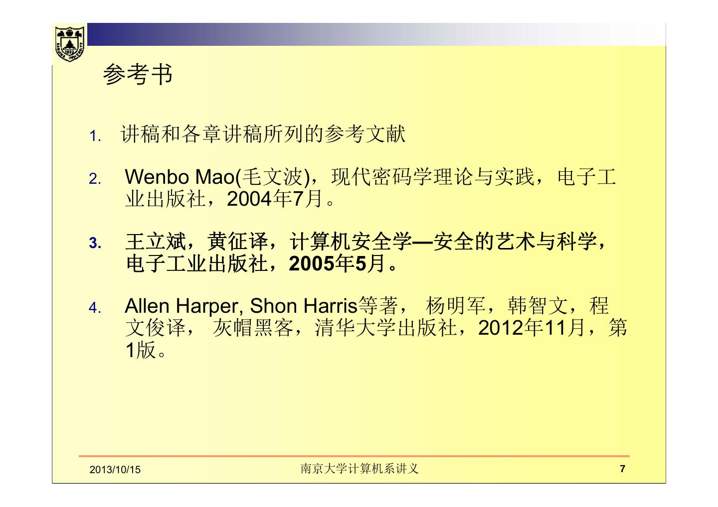 7 . 参考书 1. 讲稿和各章讲稿所列的参考文献 2. Wenbo Mao(毛文波),现代密码学理论与实践,电子工 业出版社,2004年7月。 3. 王立斌,黄征译,计算机安全学—安全的艺术与科学, 电子工业出版社,2005年5月。 4. Allen Harper, Shon Harris等著, 杨明军,韩智文,程 文俊译, 灰帽黑客,清华大学出版社,2012年11月,第 1版。 2013/10/15 南京大学计算机系讲义 7