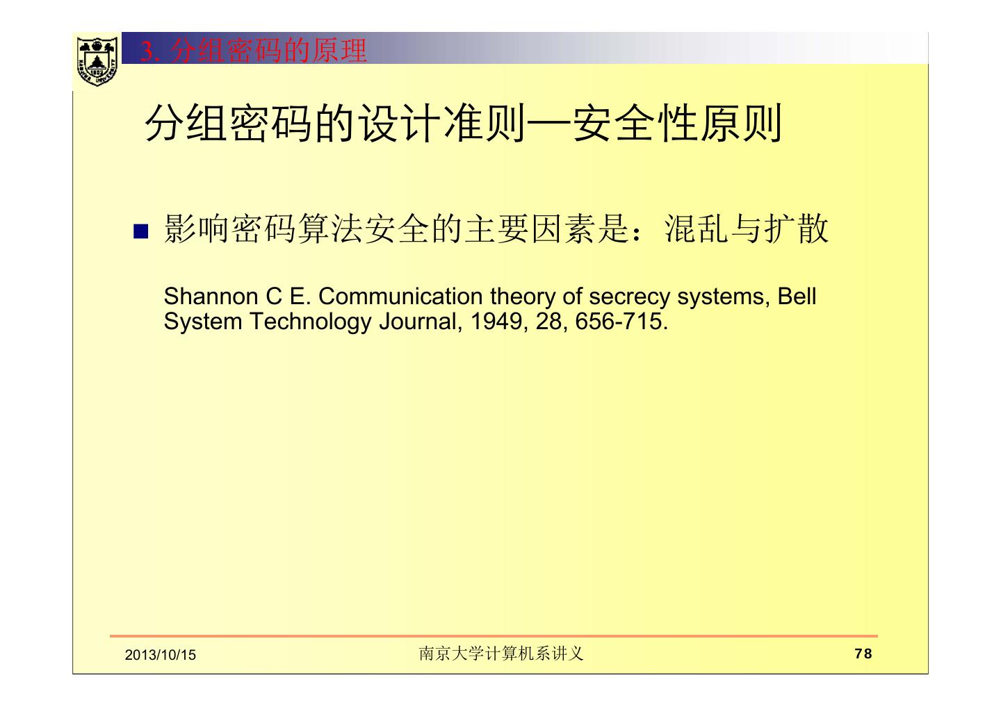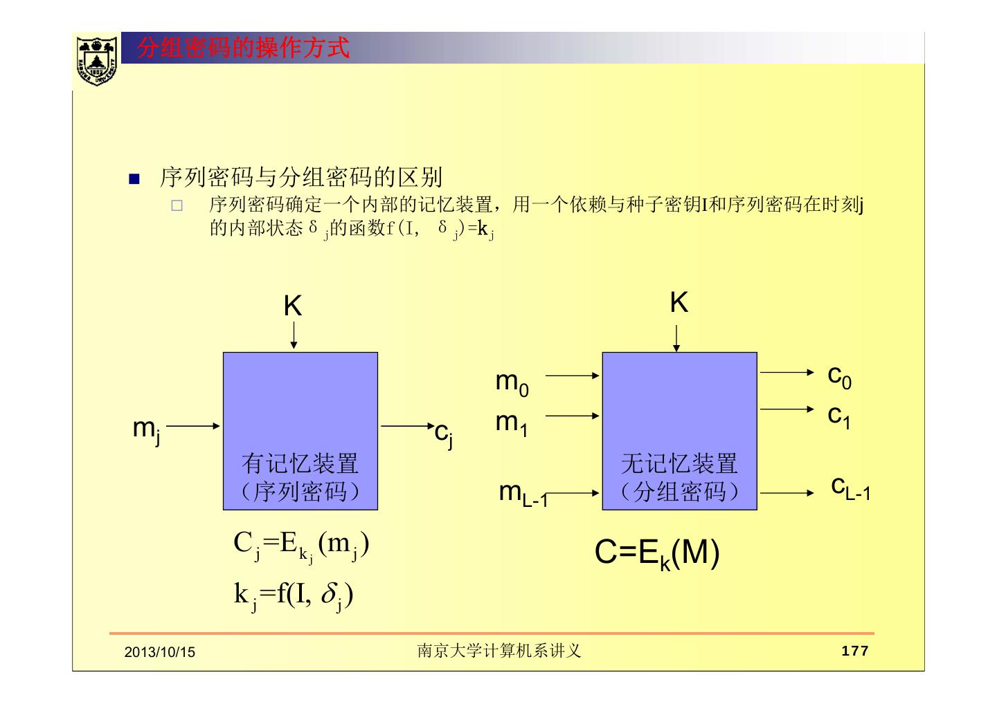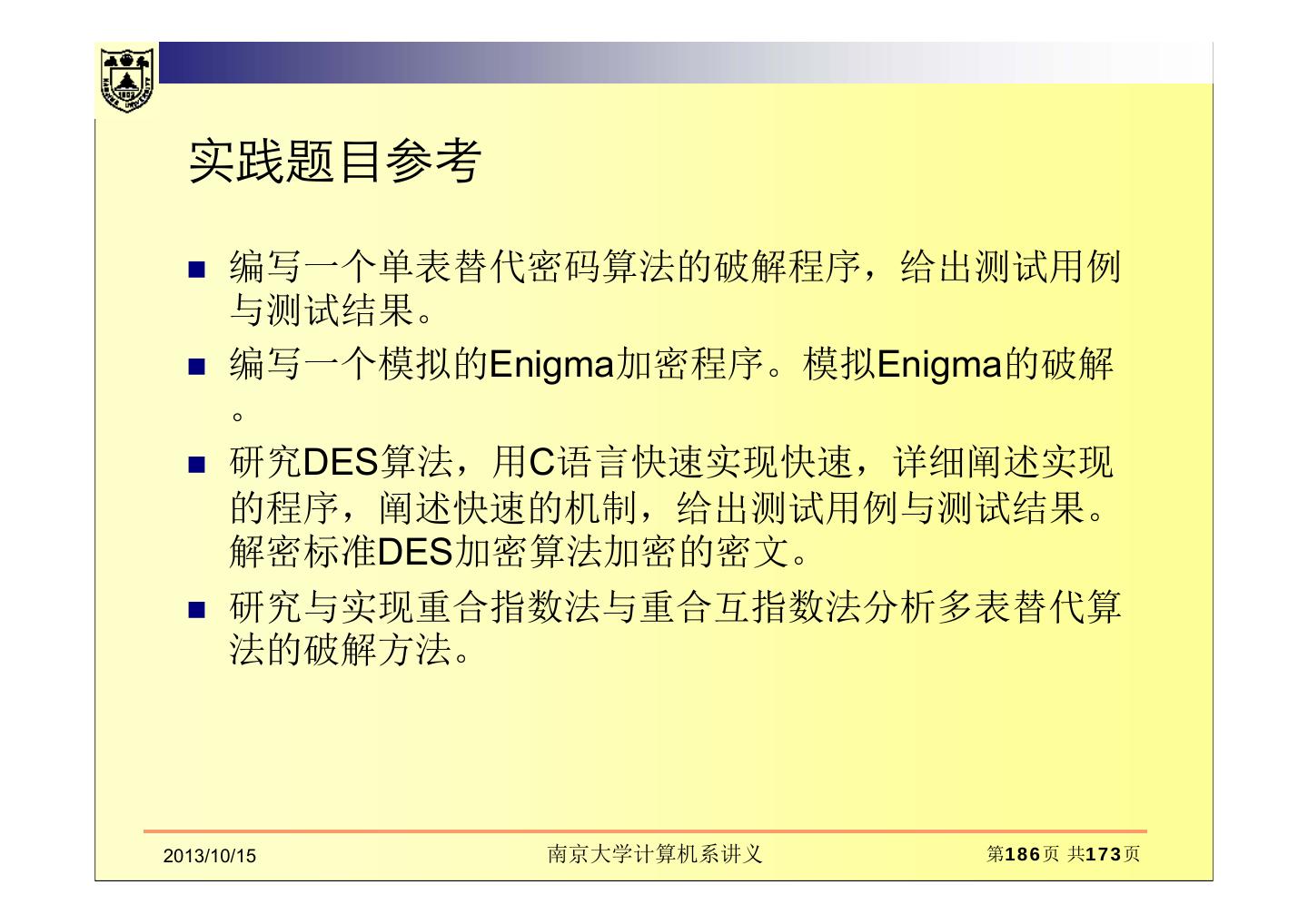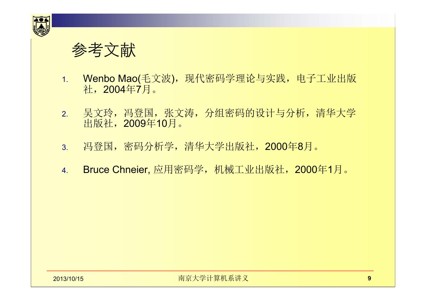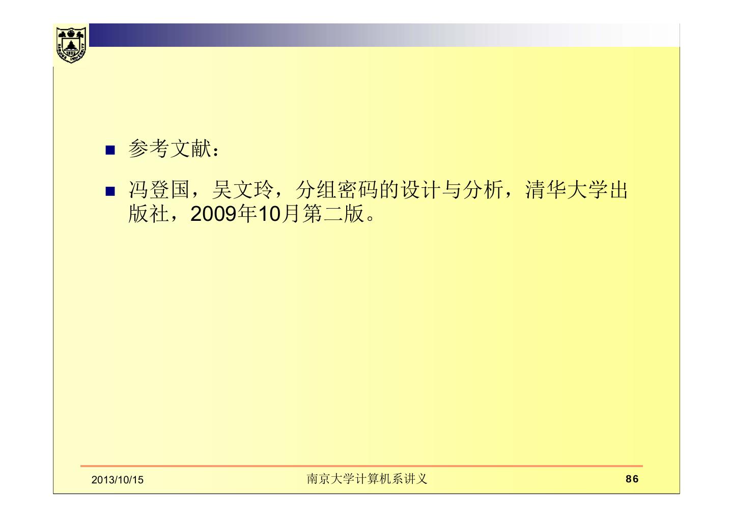 9 . 参考文献 1. Wenbo Mao(毛文波),现代密码学理论与实践,电子工业出版 社,2004年7月。 2. 吴文玲,冯登国,张文涛,分组密码的设计与分析,清华大学 出版社,2009年10月。 3. 冯登国,密码分析学,清华大学出版社,2000年8月。 4. Bruce Chneier, 应用密码学,机械工业出版社,2000年1月。 2013/10/15 南京大学计算机系讲义 9