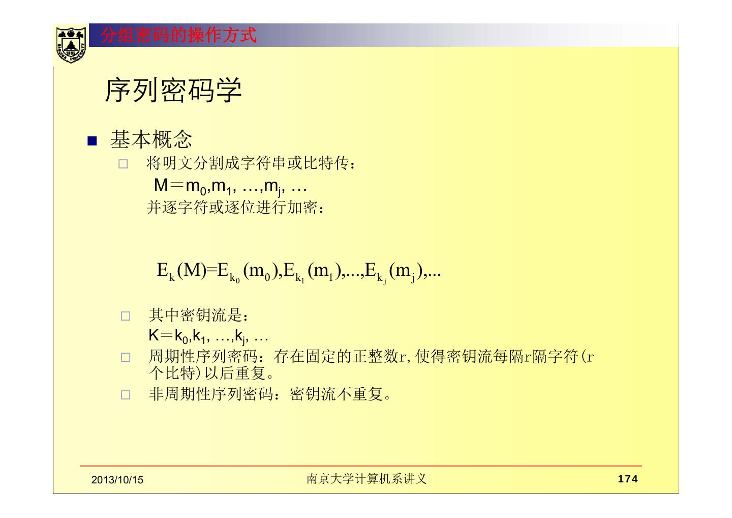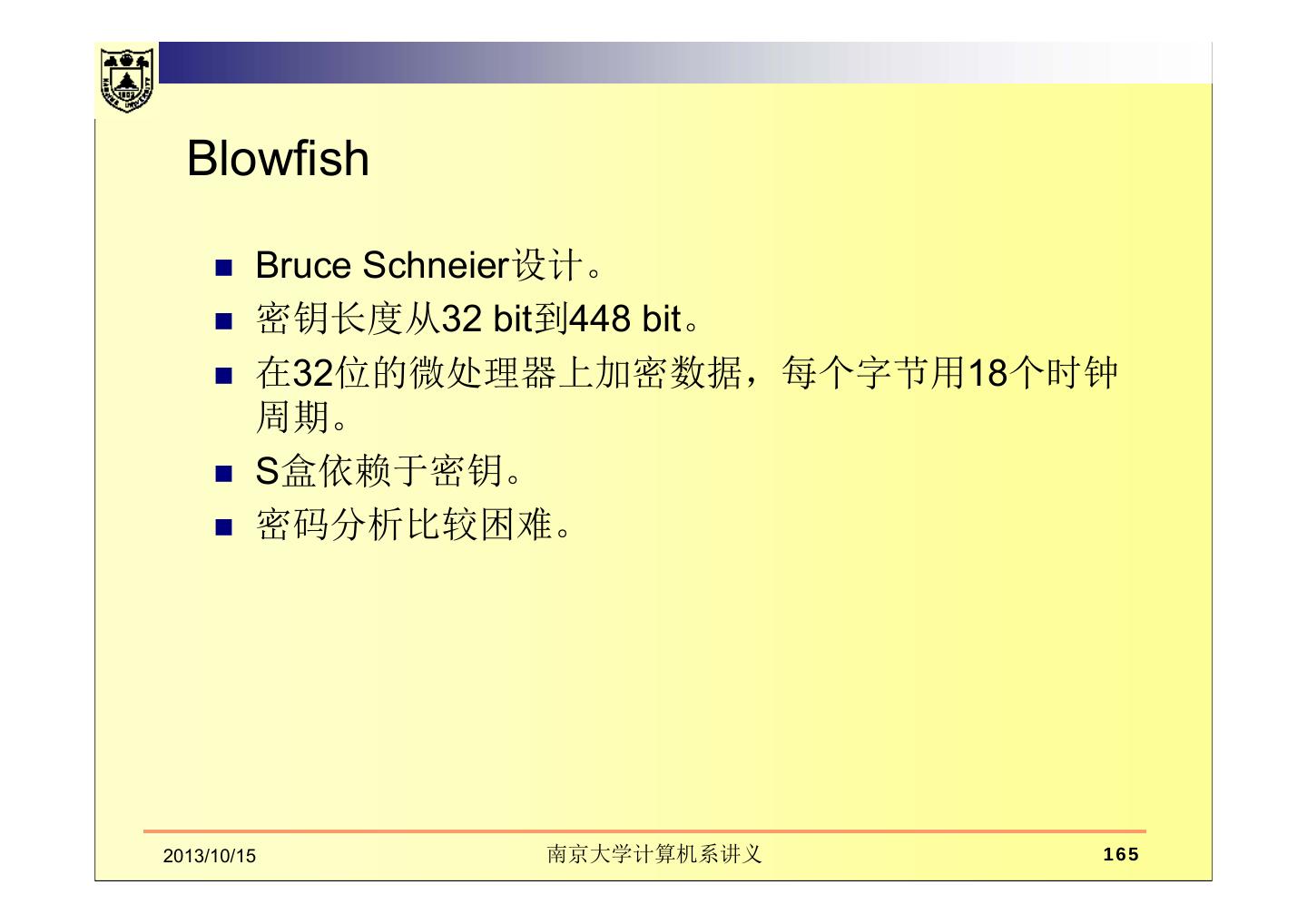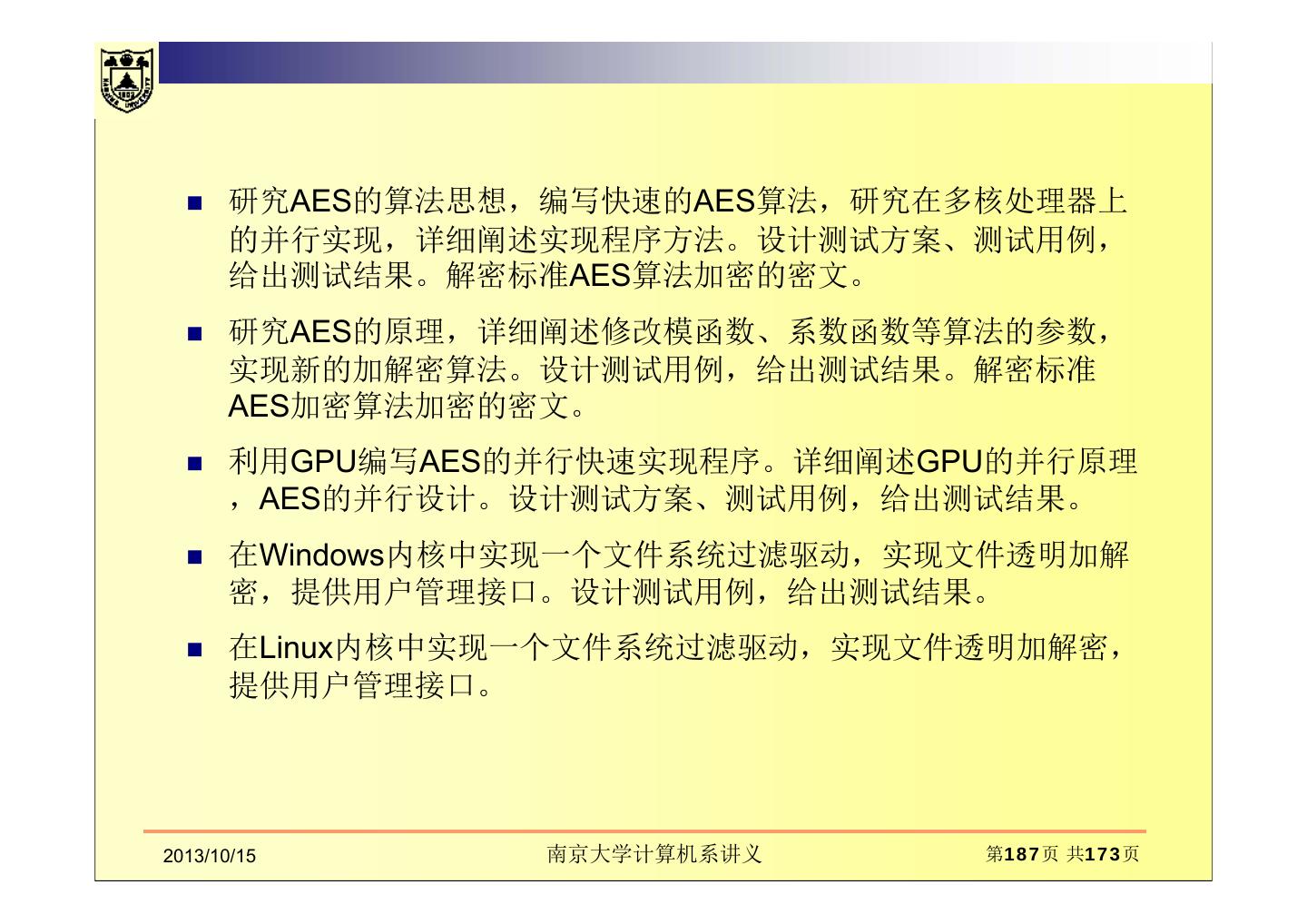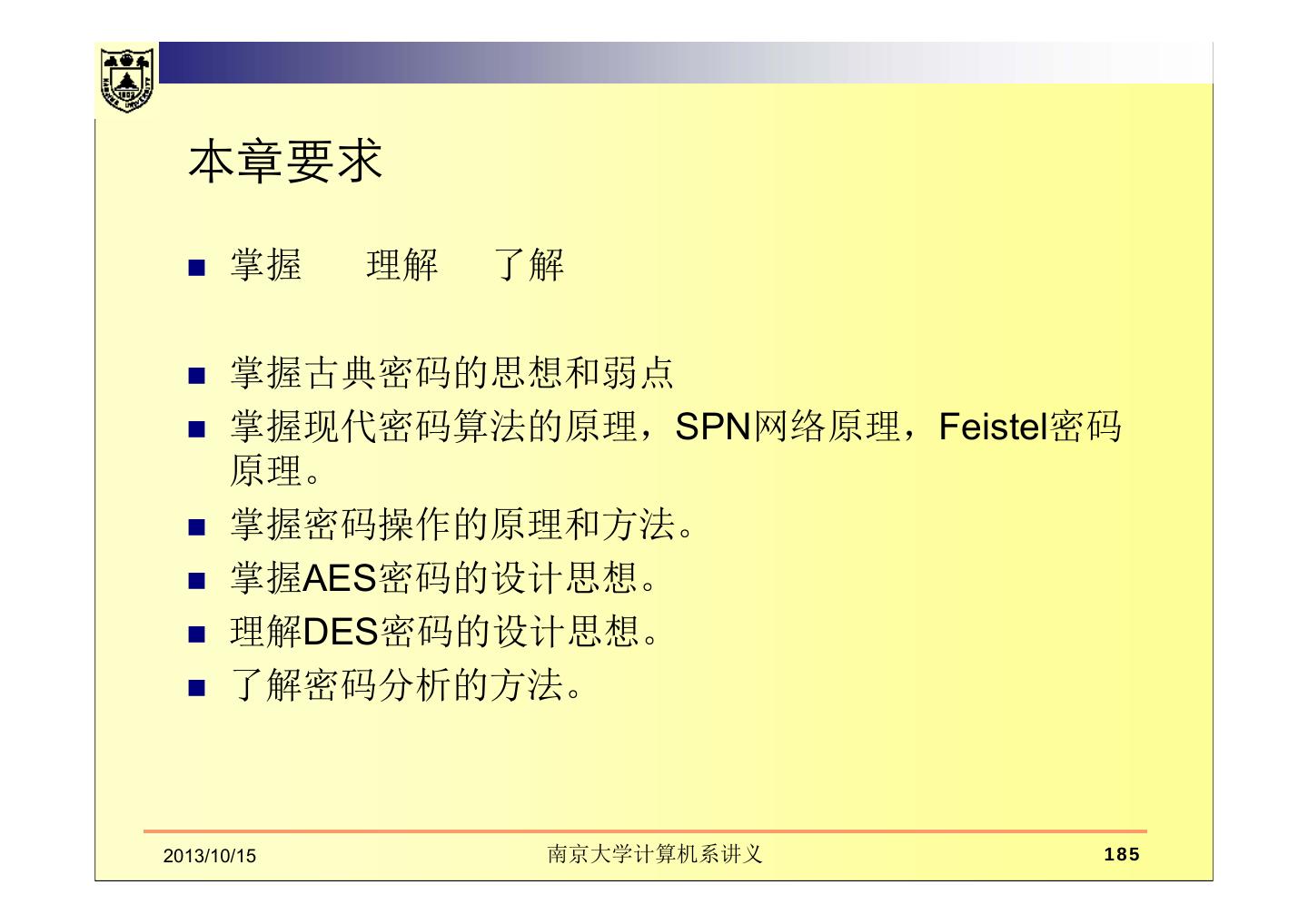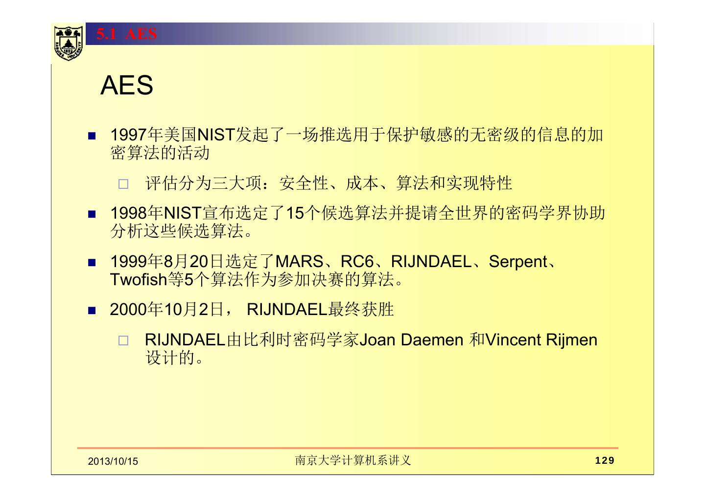 9 . 参考文献 1. Wenbo Mao(毛文波),现代密码学理论与实践,电子工业出版 社,2004年7月。 2. 吴文玲,冯登国,张文涛,分组密码的设计与分析,清华大学 出版社,2009年10月。 3. 冯登国,密码分析学,清华大学出版社,2000年8月。 4. Bruce Chneier, 应用密码学,机械工业出版社,2000年1月。 2013/10/15 南京大学计算机系讲义 9
