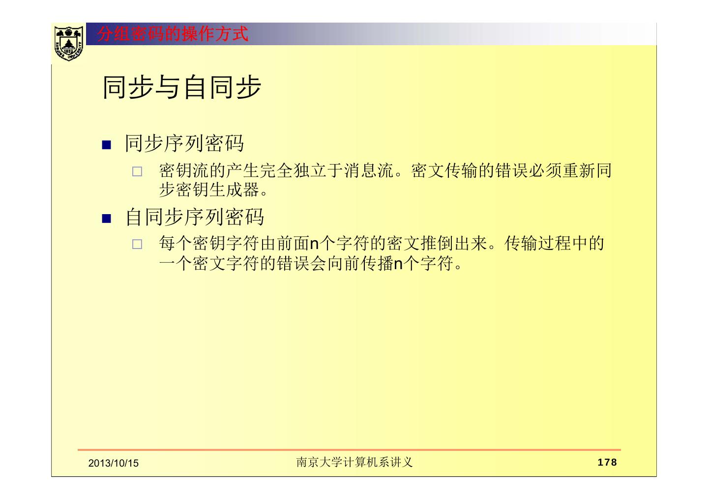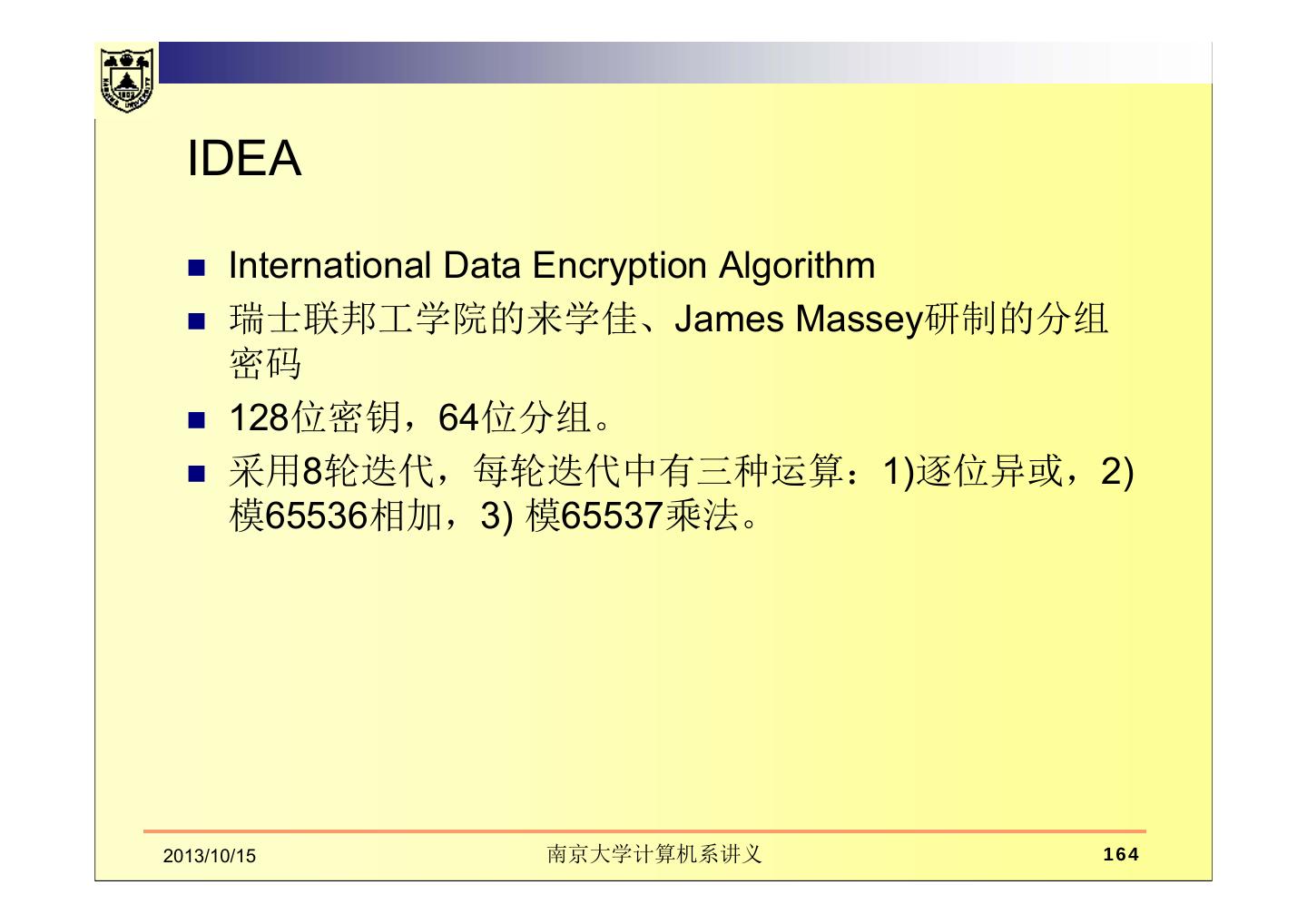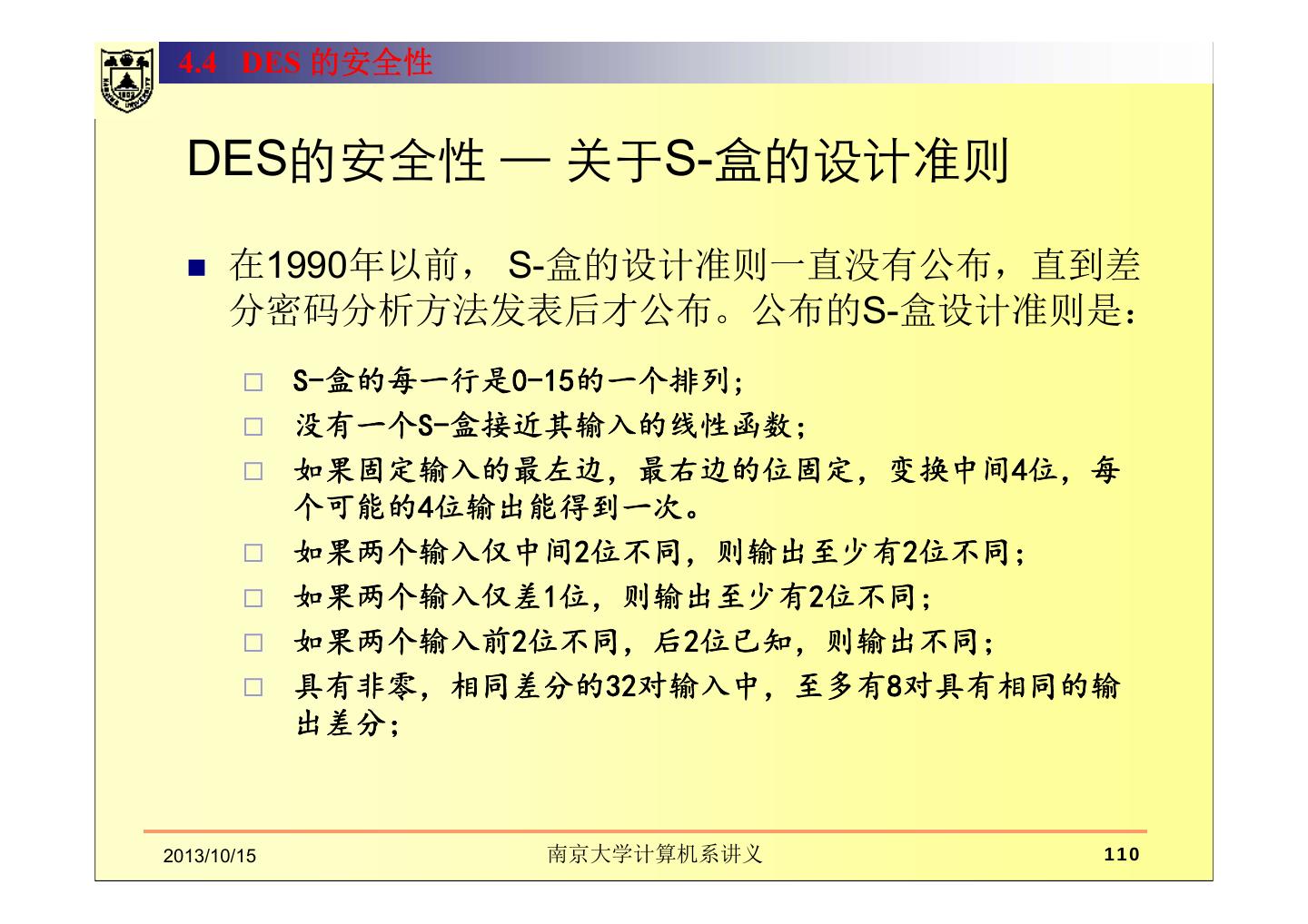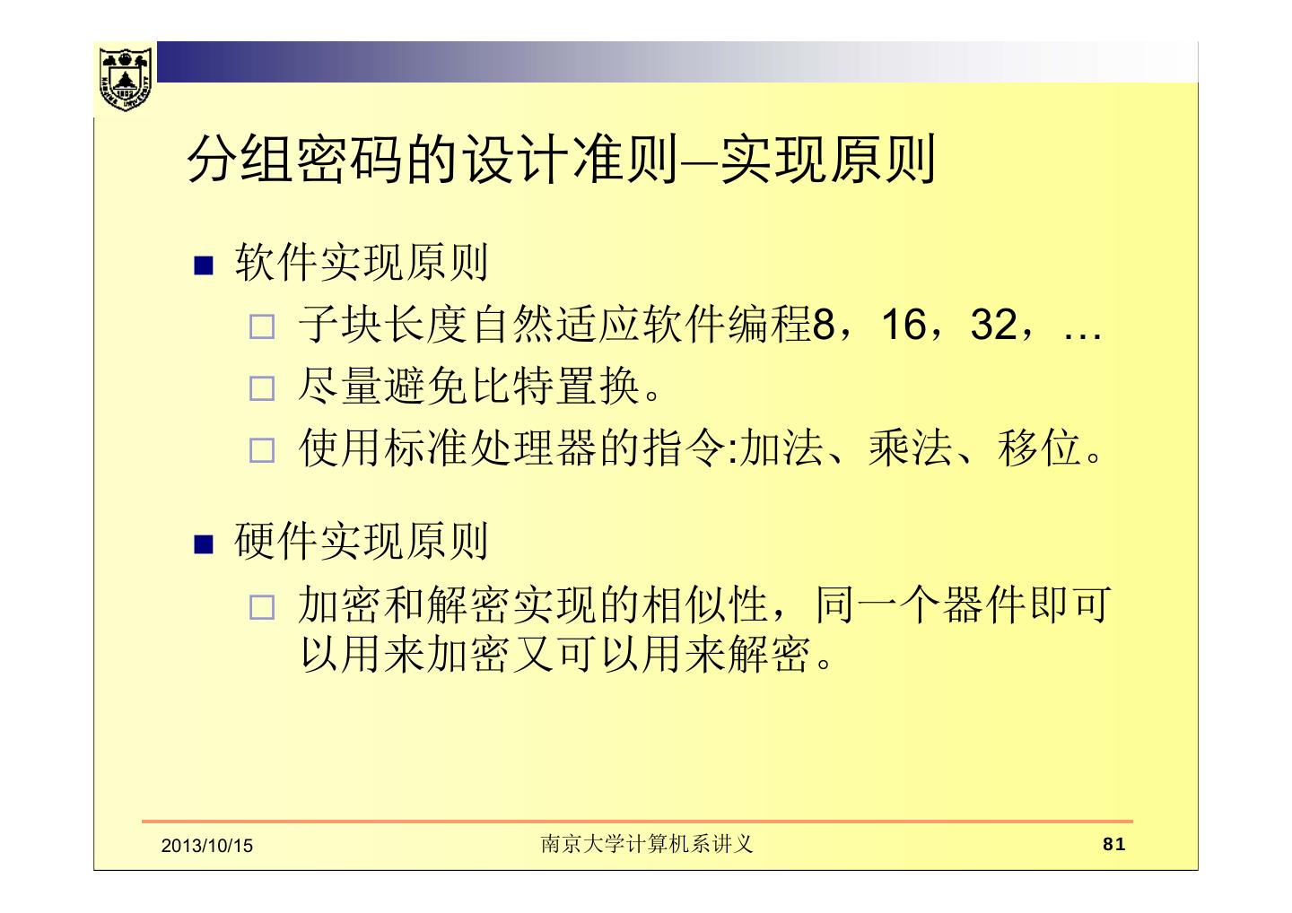 9 . 参考文献 1. Wenbo Mao(毛文波),现代密码学理论与实践,电子工业出版 社,2004年7月。 2. 吴文玲,冯登国,张文涛,分组密码的设计与分析,清华大学 出版社,2009年10月。 3. 冯登国,密码分析学,清华大学出版社,2000年8月。 4. Bruce Chneier, 应用密码学,机械工业出版社,2000年1月。 2013/10/15 南京大学计算机系讲义 9
