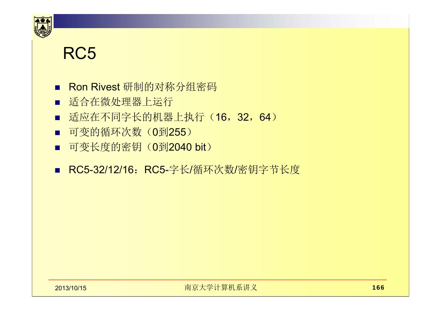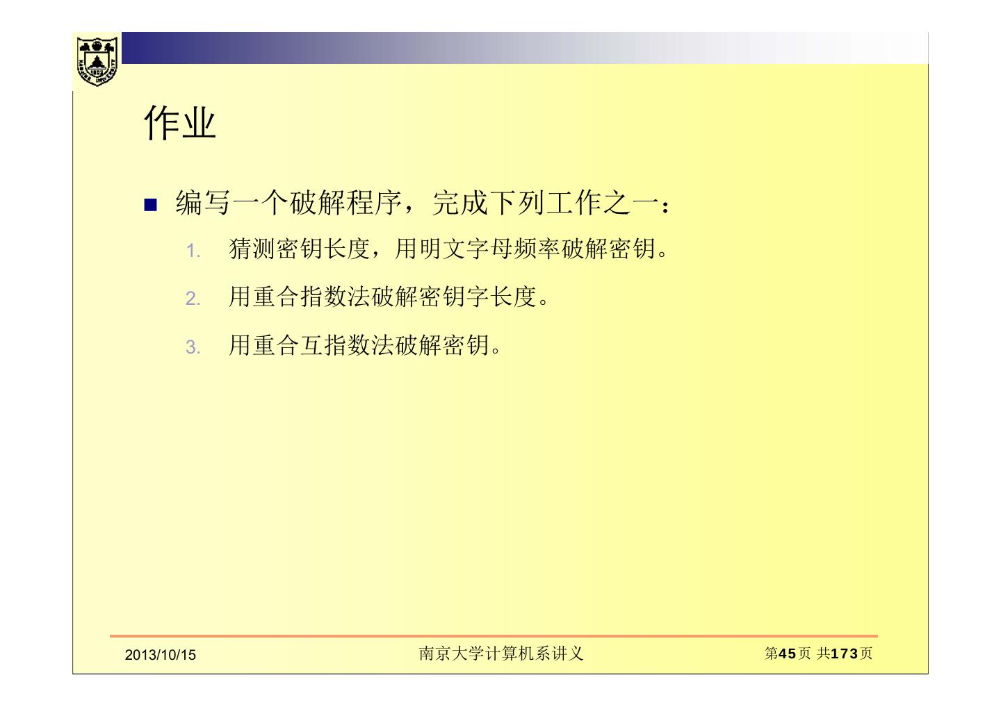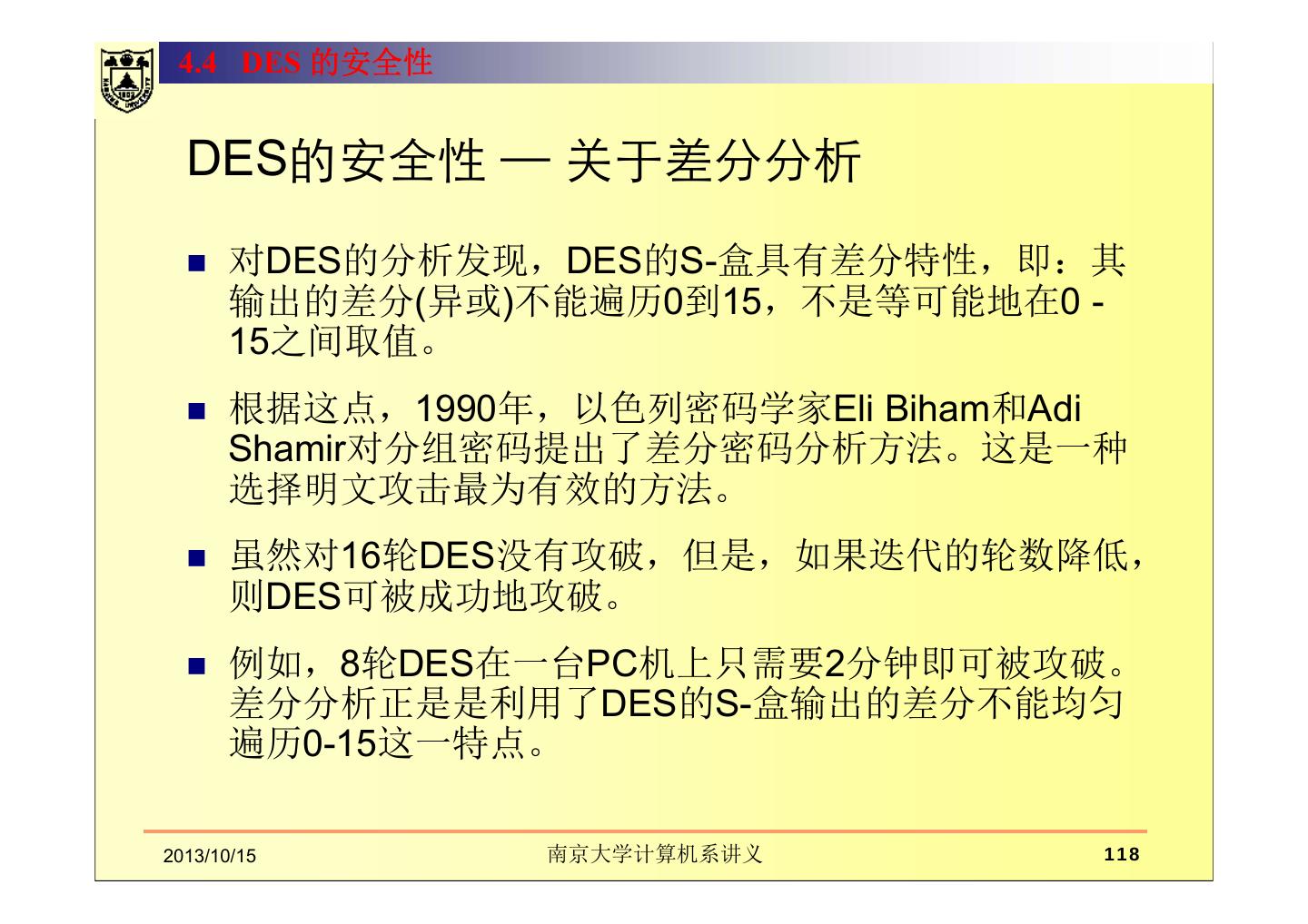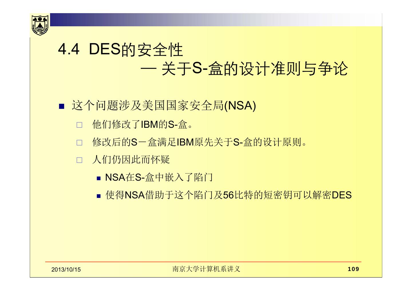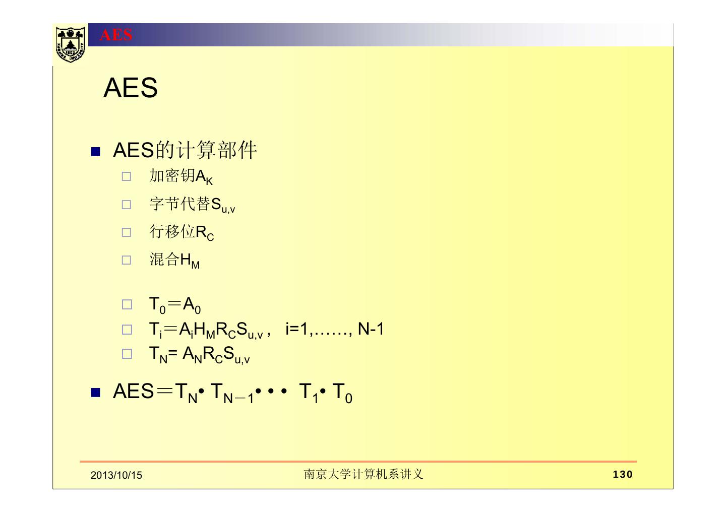 9 . 参考文献 1. Wenbo Mao(毛文波),现代密码学理论与实践,电子工业出版 社,2004年7月。 2. 吴文玲,冯登国,张文涛,分组密码的设计与分析,清华大学 出版社,2009年10月。 3. 冯登国,密码分析学,清华大学出版社,2000年8月。 4. Bruce Chneier, 应用密码学,机械工业出版社,2000年1月。 2013/10/15 南京大学计算机系讲义 9