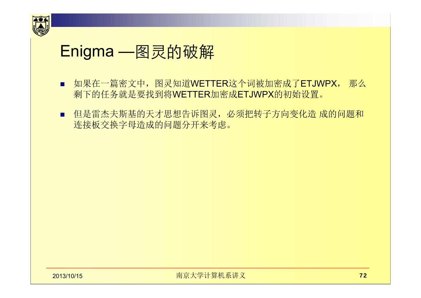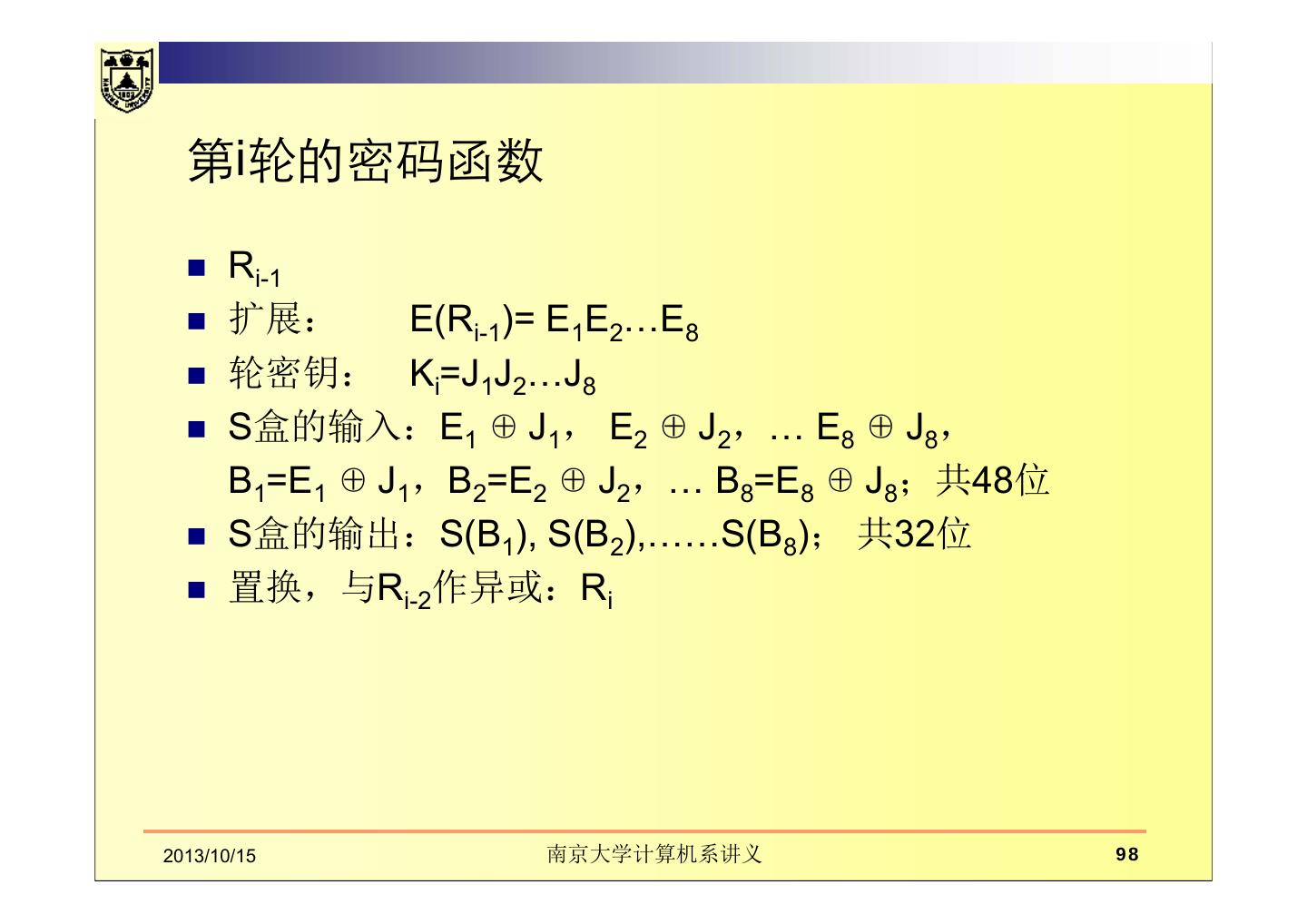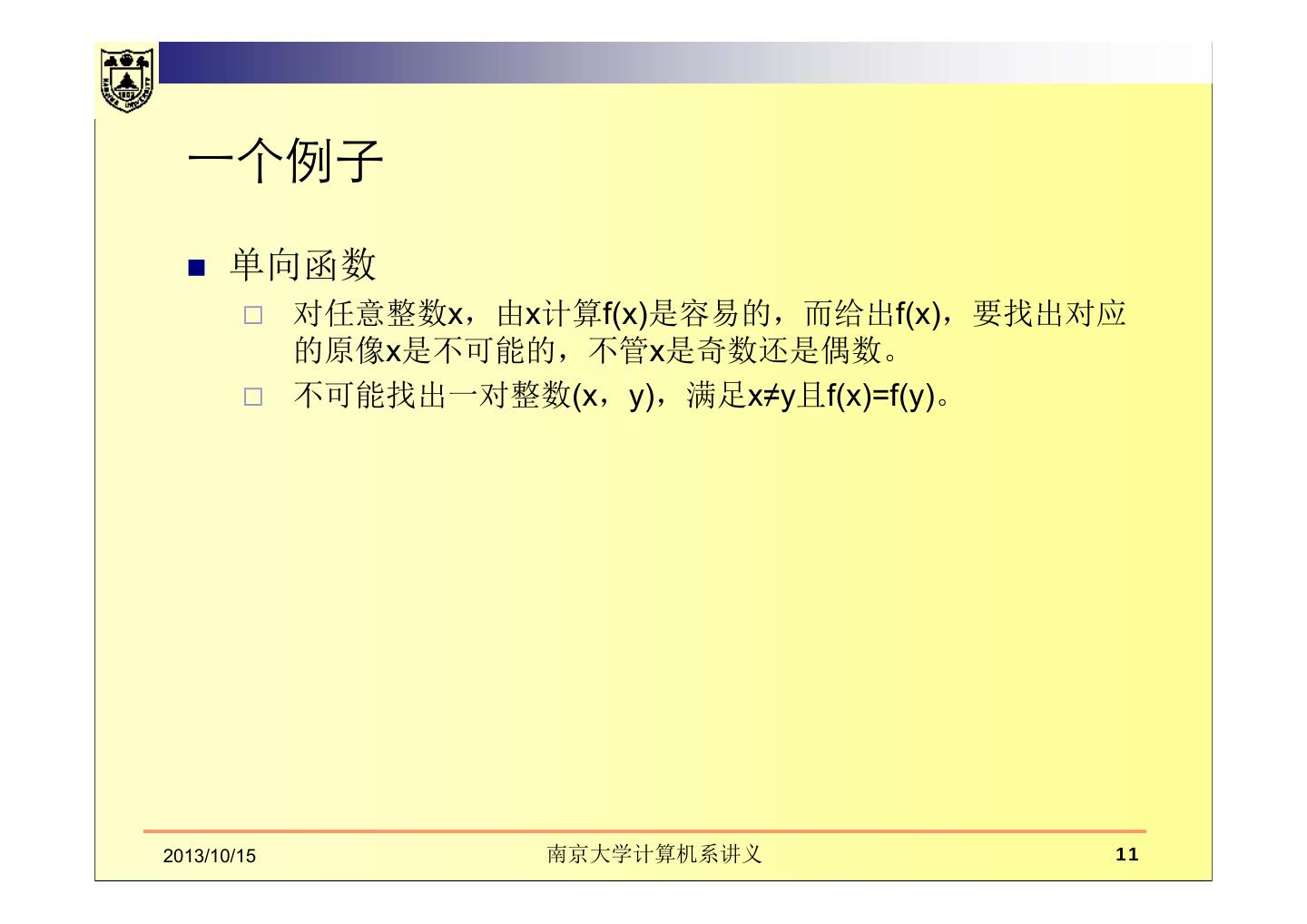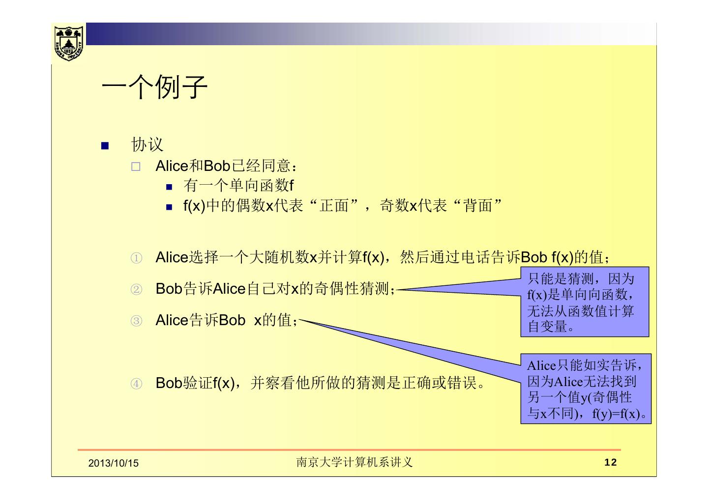 11 . 一个例子 单向函数 对任意整数x,由x计算f(x)是容易的,而给出f(x),要找出对应 的原像x是不可能的,不管x是奇数还是偶数。 不可能找出一对整数(x,y),满足x≠y且f(x)=f(y)。 2013/10/15 南京大学计算机系讲义 11