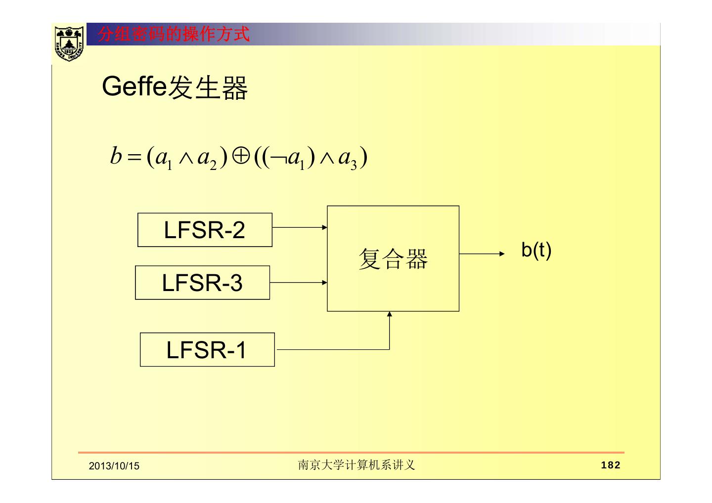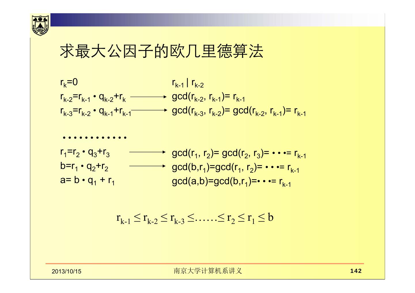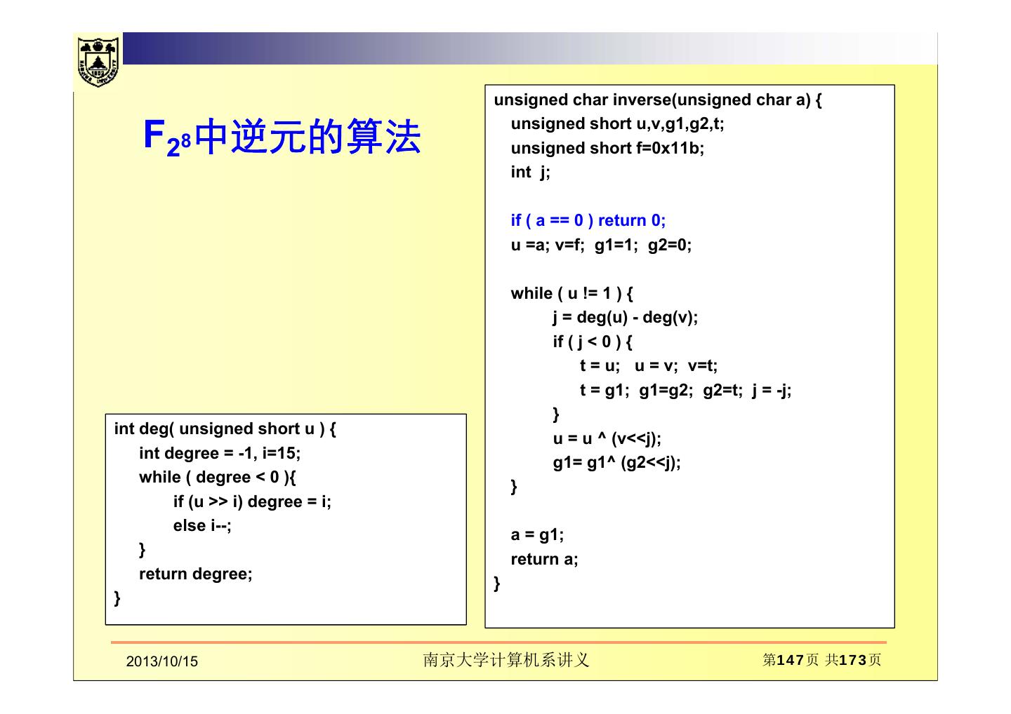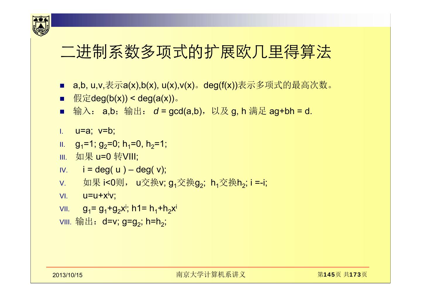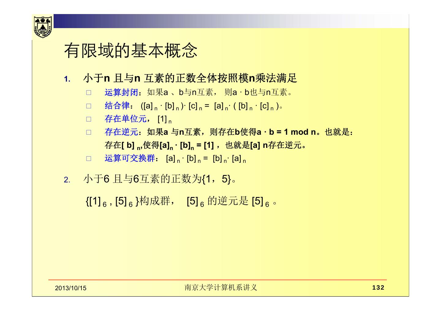 11 . 一个例子 单向函数 对任意整数x,由x计算f(x)是容易的,而给出f(x),要找出对应 的原像x是不可能的,不管x是奇数还是偶数。 不可能找出一对整数(x,y),满足x≠y且f(x)=f(y)。 2013/10/15 南京大学计算机系讲义 11