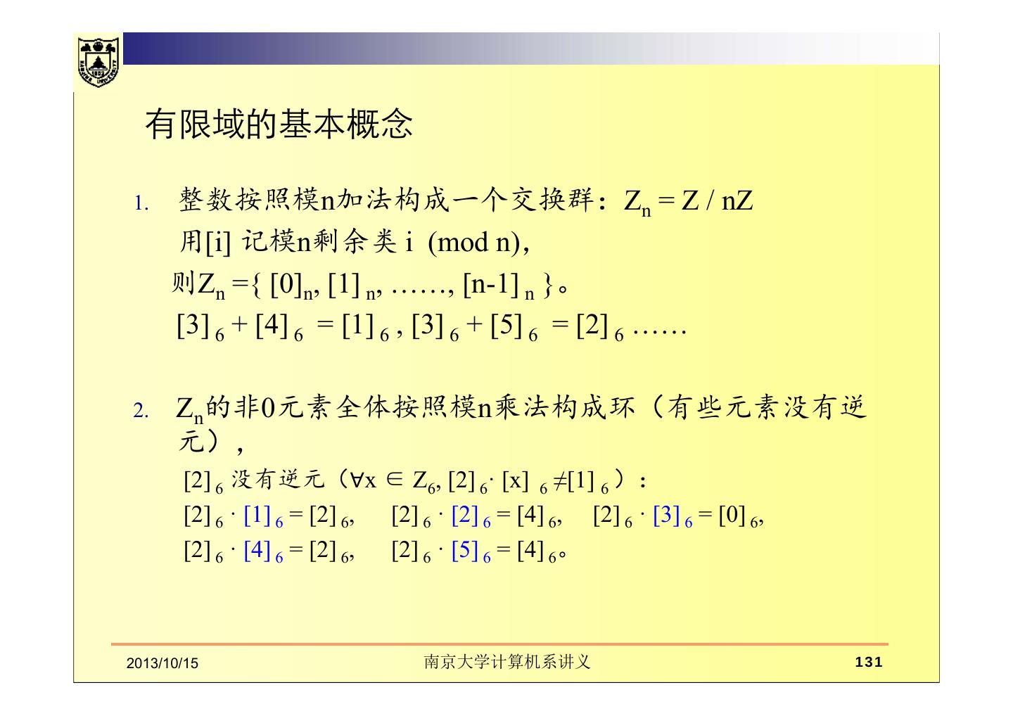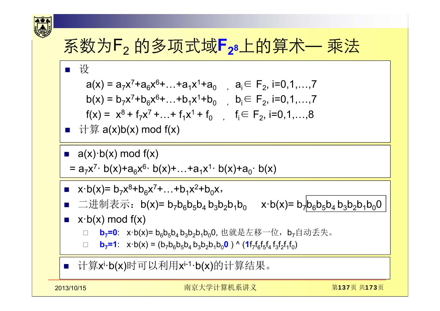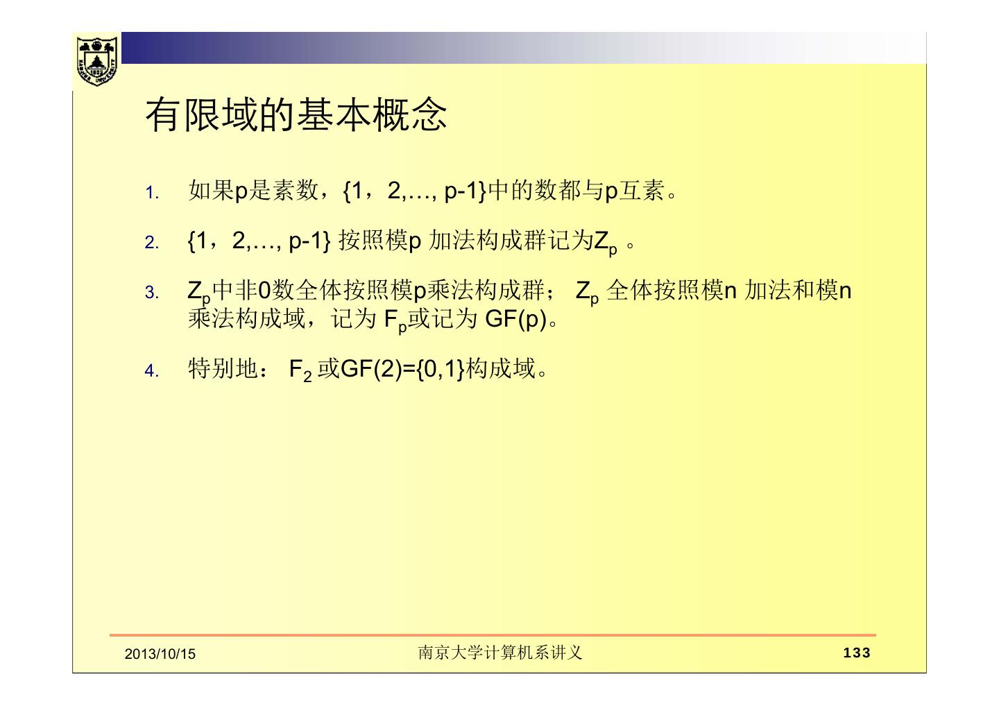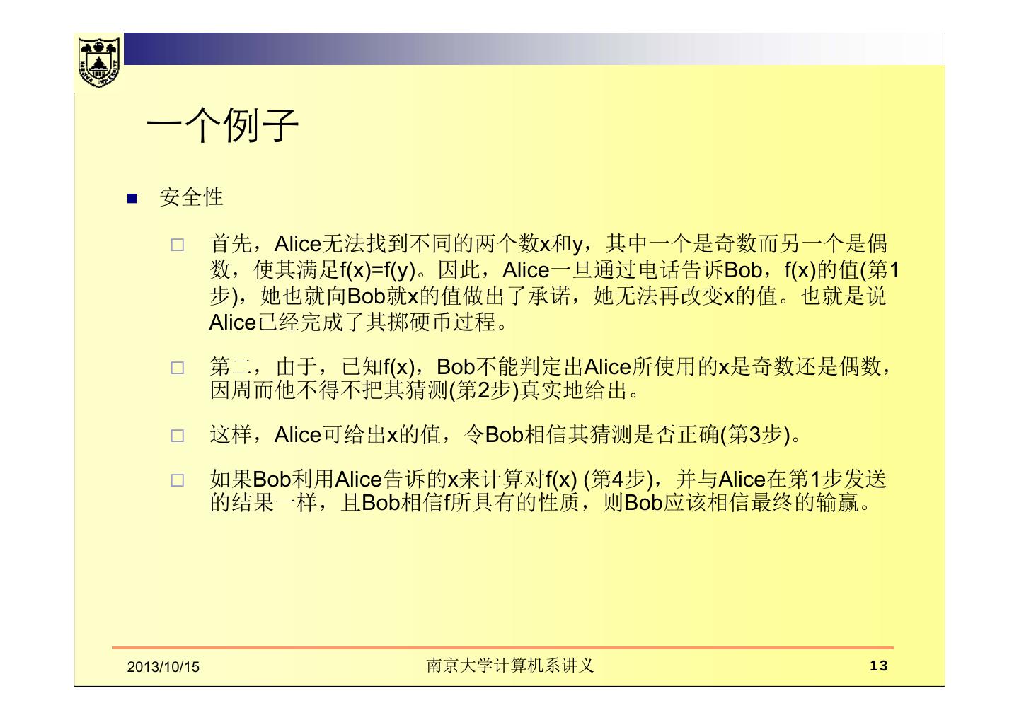 13 . 一个例子 安全性 首先,Alice无法找到不同的两个数x和y,其中一个是奇数而另一个是偶 数,使其满足f(x)=f(y)。因此,Alice一旦通过电话告诉Bob,f(x)的值(第1 步),她也就向Bob就x的值做出了承诺,她无法再改变x的值。也就是说 Alice已经完成了其掷硬币过程。 第二,由于,已知f(x),Bob不能判定出Alice所使用的x是奇数还是偶数, 因周而他不得不把其猜测(第2步)真实地给出。 这样,Alice可给出x的值,令Bob相信其猜测是否正确(第3步)。 如果Bob利用Alice告诉的x来计算对f(x) (第4步),并与Alice在第1步发送 的结果一样,且Bob相信f所具有的性质,则Bob应该相信最终的输赢。 2013/10/15 南京大学计算机系讲义 13