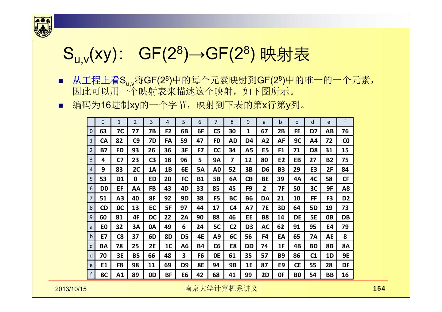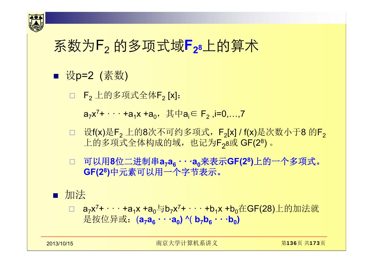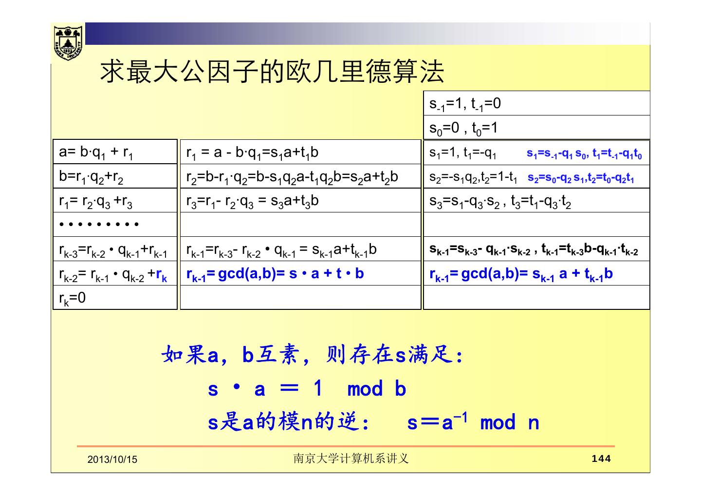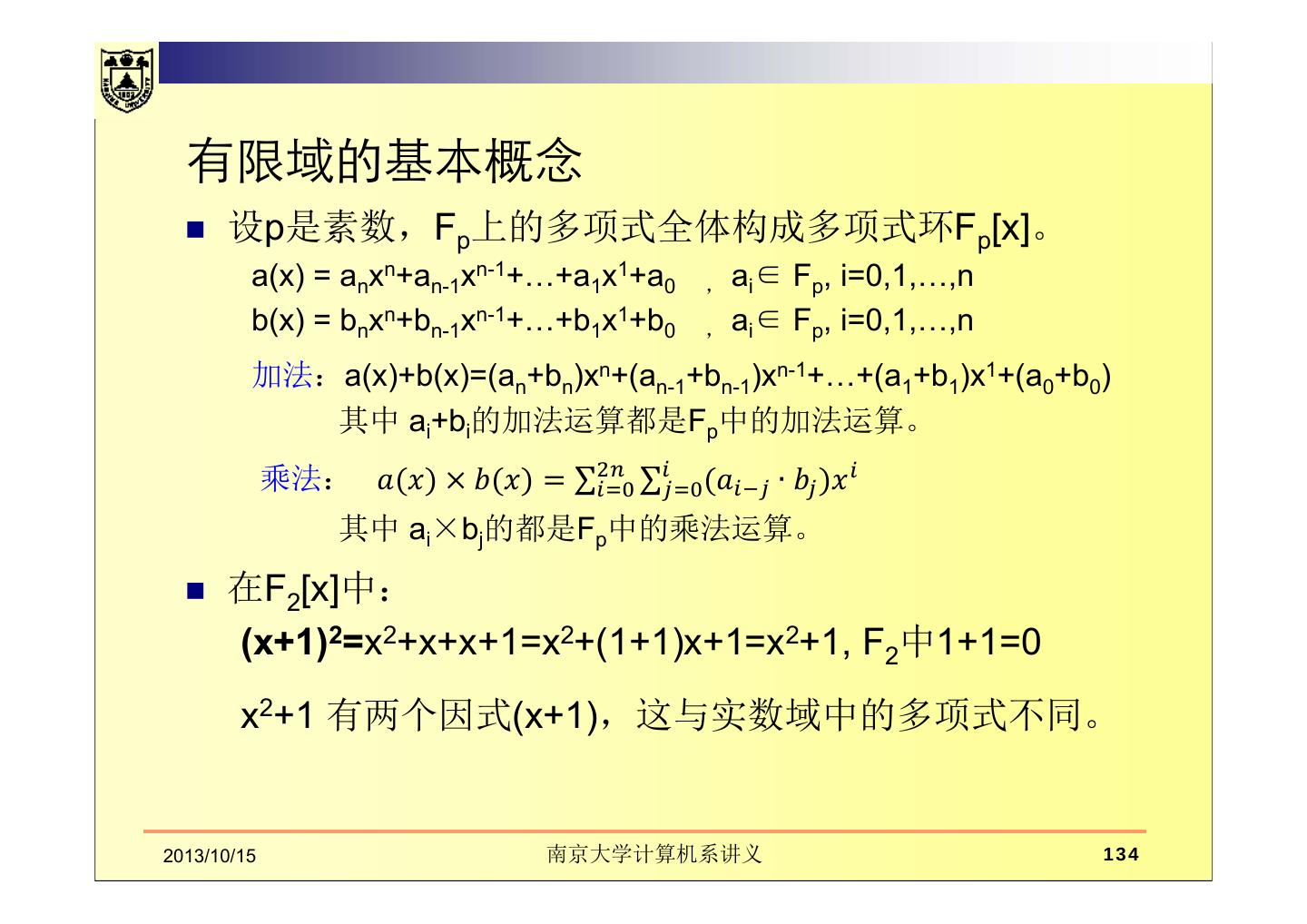 13 . 一个例子 安全性 首先,Alice无法找到不同的两个数x和y,其中一个是奇数而另一个是偶 数,使其满足f(x)=f(y)。因此,Alice一旦通过电话告诉Bob,f(x)的值(第1 步),她也就向Bob就x的值做出了承诺,她无法再改变x的值。也就是说 Alice已经完成了其掷硬币过程。 第二,由于,已知f(x),Bob不能判定出Alice所使用的x是奇数还是偶数, 因周而他不得不把其猜测(第2步)真实地给出。 这样,Alice可给出x的值,令Bob相信其猜测是否正确(第3步)。 如果Bob利用Alice告诉的x来计算对f(x) (第4步),并与Alice在第1步发送 的结果一样,且Bob相信f所具有的性质,则Bob应该相信最终的输赢。 2013/10/15 南京大学计算机系讲义 13