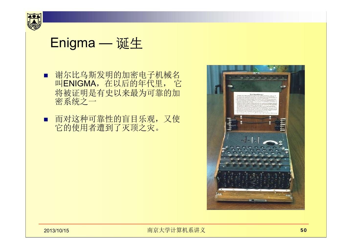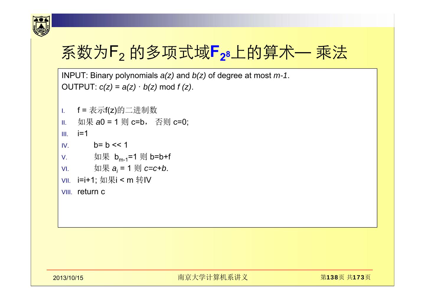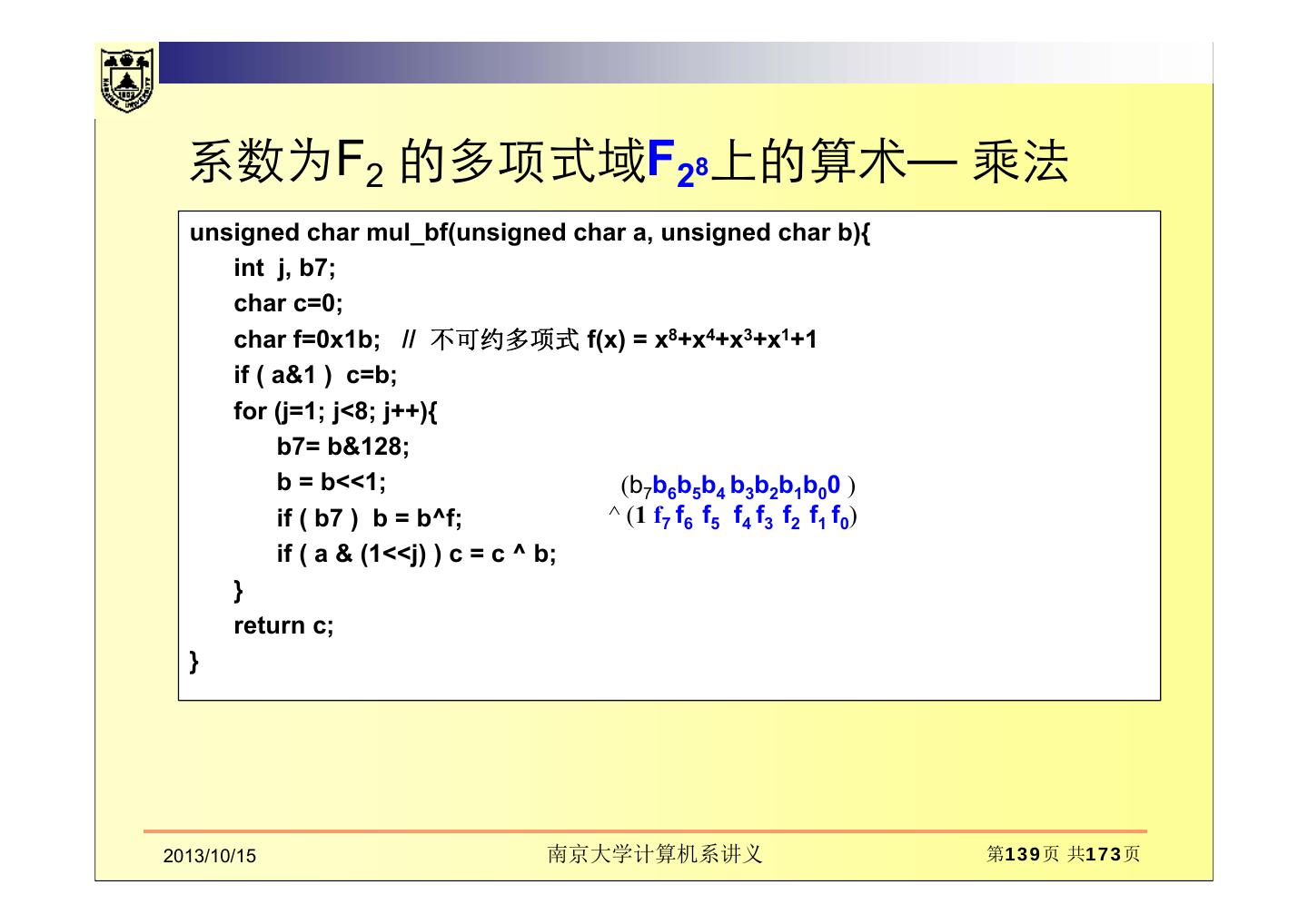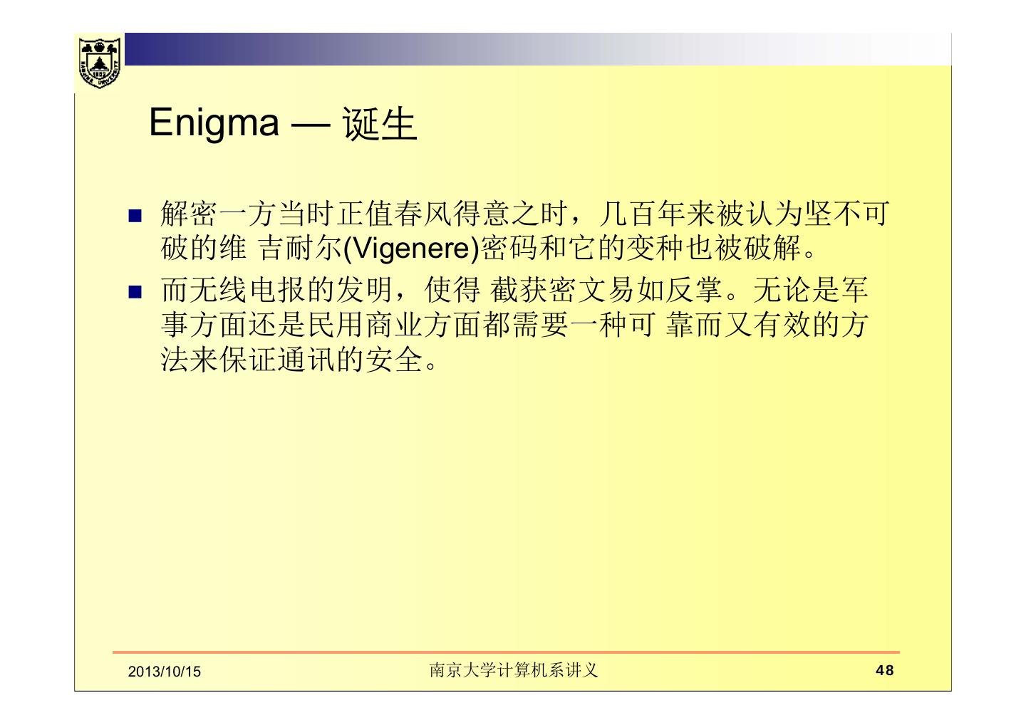 13 . 一个例子 安全性 首先,Alice无法找到不同的两个数x和y,其中一个是奇数而另一个是偶 数,使其满足f(x)=f(y)。因此,Alice一旦通过电话告诉Bob,f(x)的值(第1 步),她也就向Bob就x的值做出了承诺,她无法再改变x的值。也就是说 Alice已经完成了其掷硬币过程。 第二,由于,已知f(x),Bob不能判定出Alice所使用的x是奇数还是偶数, 因周而他不得不把其猜测(第2步)真实地给出。 这样,Alice可给出x的值,令Bob相信其猜测是否正确(第3步)。 如果Bob利用Alice告诉的x来计算对f(x) (第4步),并与Alice在第1步发送 的结果一样,且Bob相信f所具有的性质,则Bob应该相信最终的输赢。 2013/10/15 南京大学计算机系讲义 13