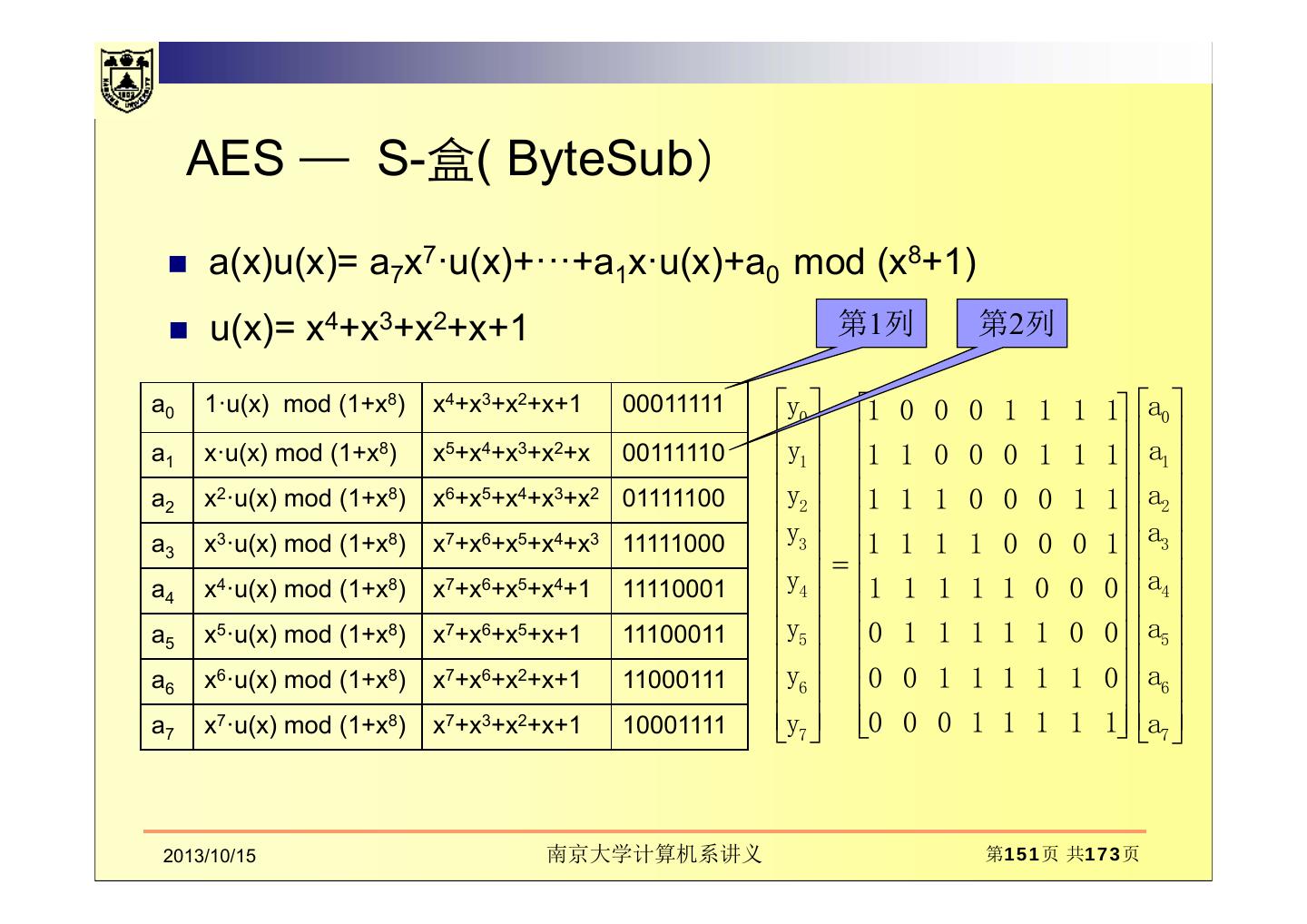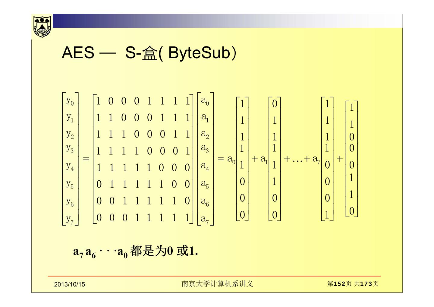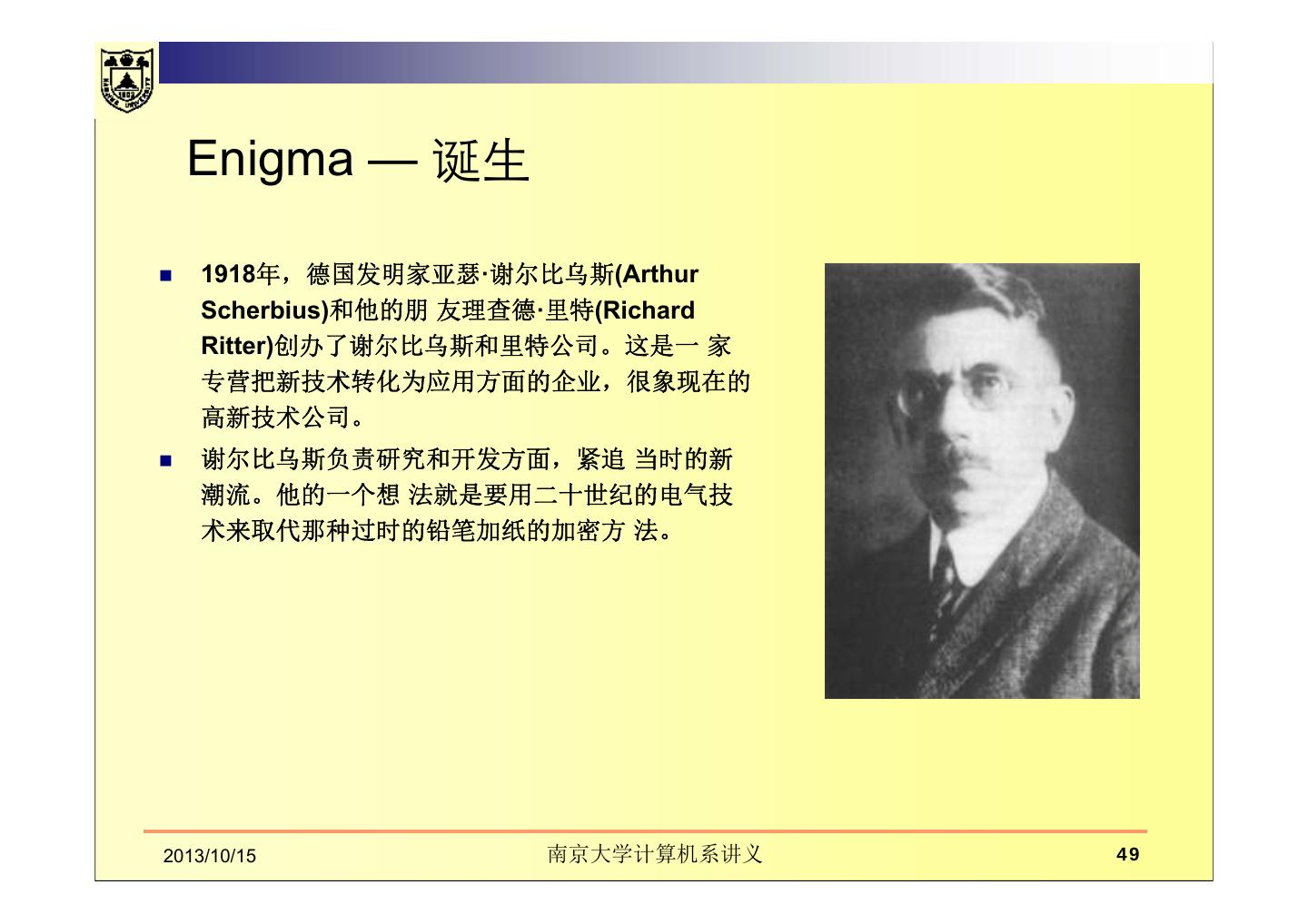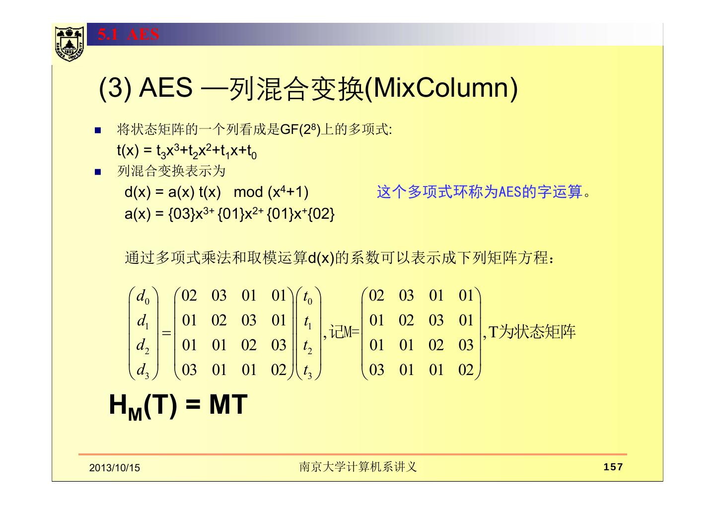 13 . 一个例子 安全性 首先,Alice无法找到不同的两个数x和y,其中一个是奇数而另一个是偶 数,使其满足f(x)=f(y)。因此,Alice一旦通过电话告诉Bob,f(x)的值(第1 步),她也就向Bob就x的值做出了承诺,她无法再改变x的值。也就是说 Alice已经完成了其掷硬币过程。 第二,由于,已知f(x),Bob不能判定出Alice所使用的x是奇数还是偶数, 因周而他不得不把其猜测(第2步)真实地给出。 这样,Alice可给出x的值,令Bob相信其猜测是否正确(第3步)。 如果Bob利用Alice告诉的x来计算对f(x) (第4步),并与Alice在第1步发送 的结果一样,且Bob相信f所具有的性质,则Bob应该相信最终的输赢。 2013/10/15 南京大学计算机系讲义 13