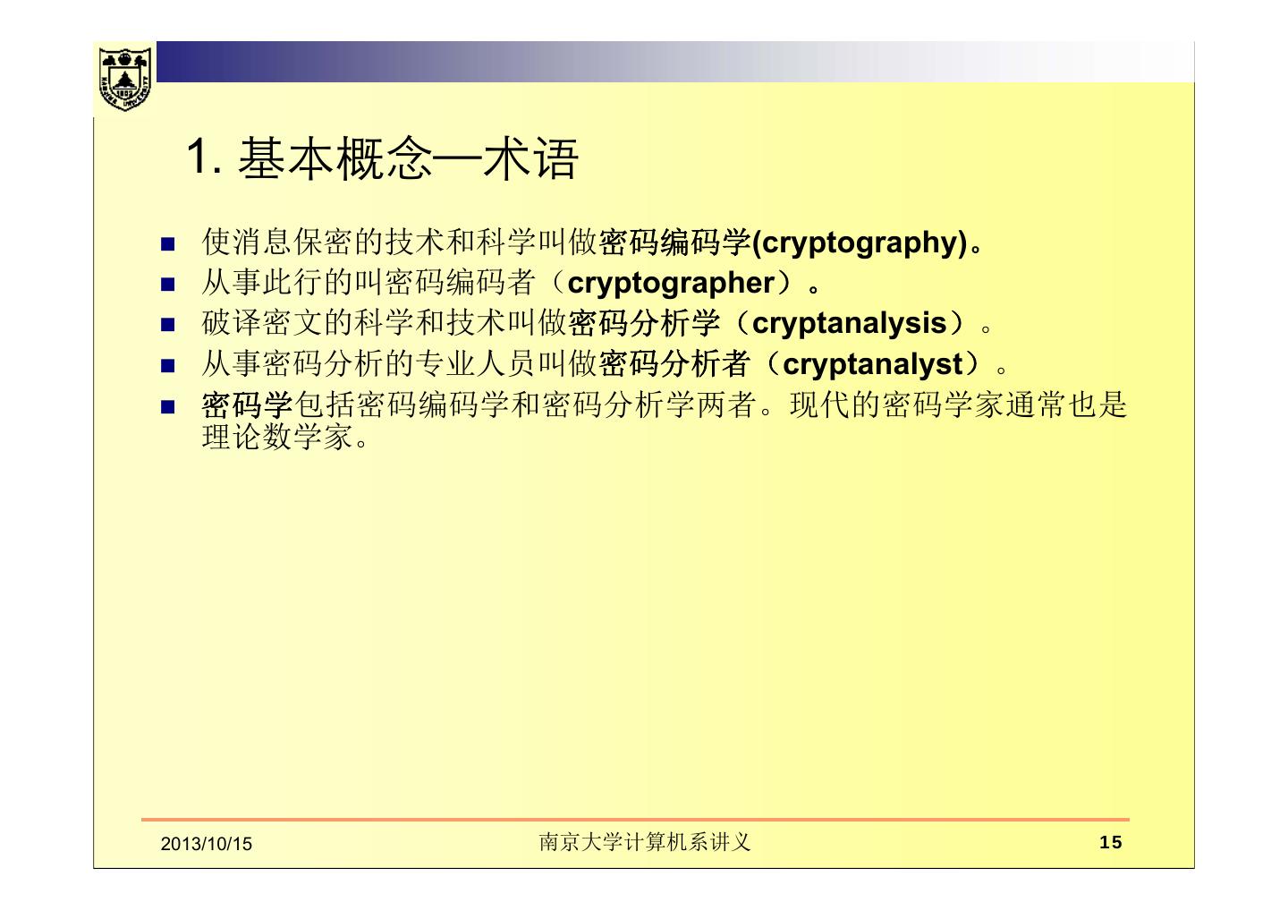 15 . 1. 基本概念—术语 使消息保密的技术和科学叫做密码编码学(cryptography)。 从事此行的叫密码编码者(cryptographer)。 破译密文的科学和技术叫做密码分析学(cryptanalysis)。 从事密码分析的专业人员叫做密码分析者(cryptanalyst)。 密码学包括密码编码学和密码分析学两者。现代的密码学家通常也是 理论数学家。 2013/10/15 南京大学计算机系讲义 15