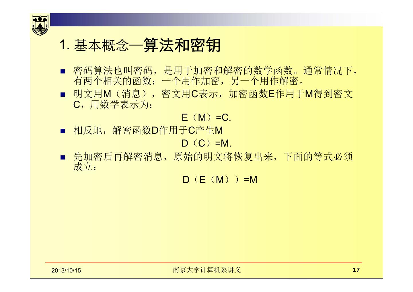 16 . 1. 基本概念—密码学的其它作用 鉴别 消息的接收者应该能够确认消息的来源;入侵者不 可能伪装成他人。 完整性 消息的接收者应该能够验证在传送过程中消息没 有被修改;入侵者不可能用假消息代替合法消息。 抗抵赖 发送者事后不可能虚假地否认他发送的消息。 2013/10/15 南京大学计算机系讲义 16
