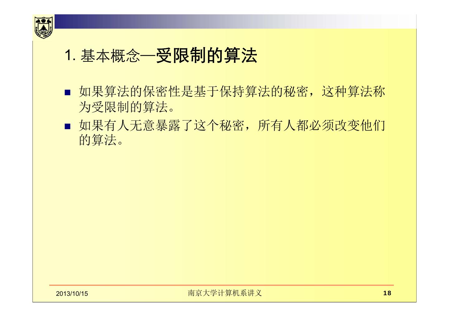 18 . 1. 基本概念—受限制的算法 如果算法的保密性是基于保持算法的秘密,这种算法称 为受限制的算法。 如果有人无意暴露了这个秘密,所有人都必须改变他们 的算法。 2013/10/15 南京大学计算机系讲义 18