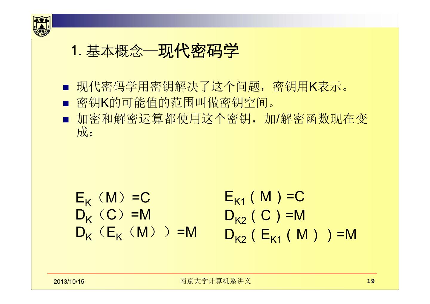 19 . 1. 基本概念—现代密码学 现代密码学用密钥解决了这个问题,密钥用K表示。 密钥K的可能值的范围叫做密钥空间。 加密和解密运算都使用这个密钥,加/解密函数现在变 成: EK(M)=C EK1(M)=C DK(C)=M DK2(C)=M DK(EK(M))=M DK2(EK1(M))=M 2013/10/15 南京大学计算机系讲义 19
