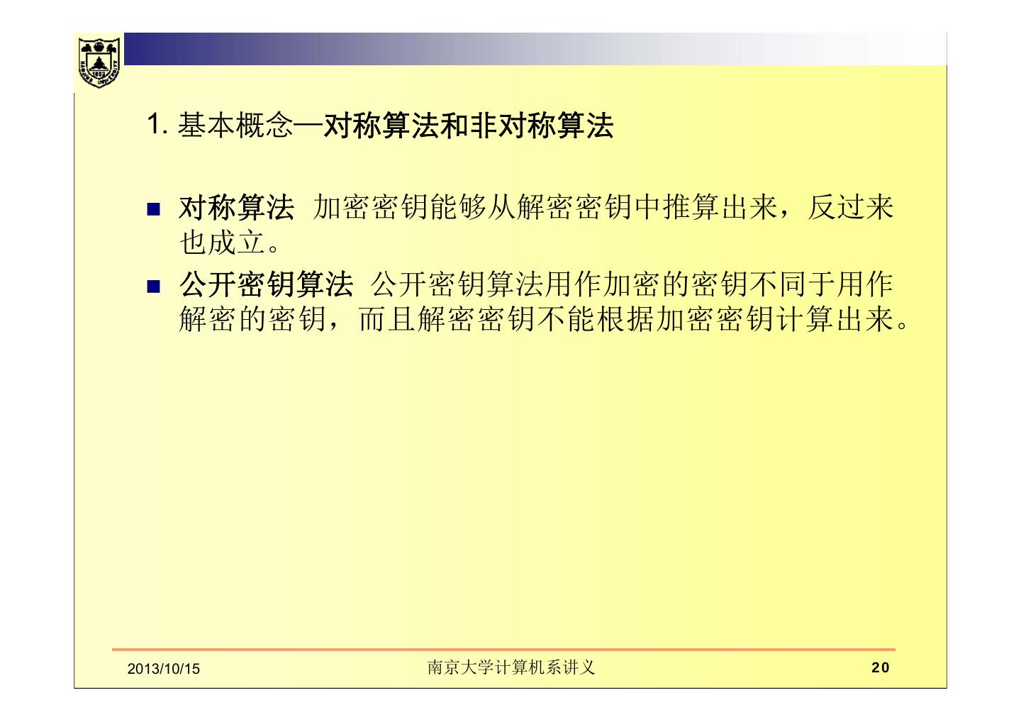 20 . 1. 基本概念—对称算法和非对称算法 对称算法 加密密钥能够从解密密钥中推算出来,反过来 也成立。 公开密钥算法 公开密钥算法用作加密的密钥不同于用作 解密的密钥,而且解密密钥不能根据加密密钥计算出来。 2013/10/15 南京大学计算机系讲义 20