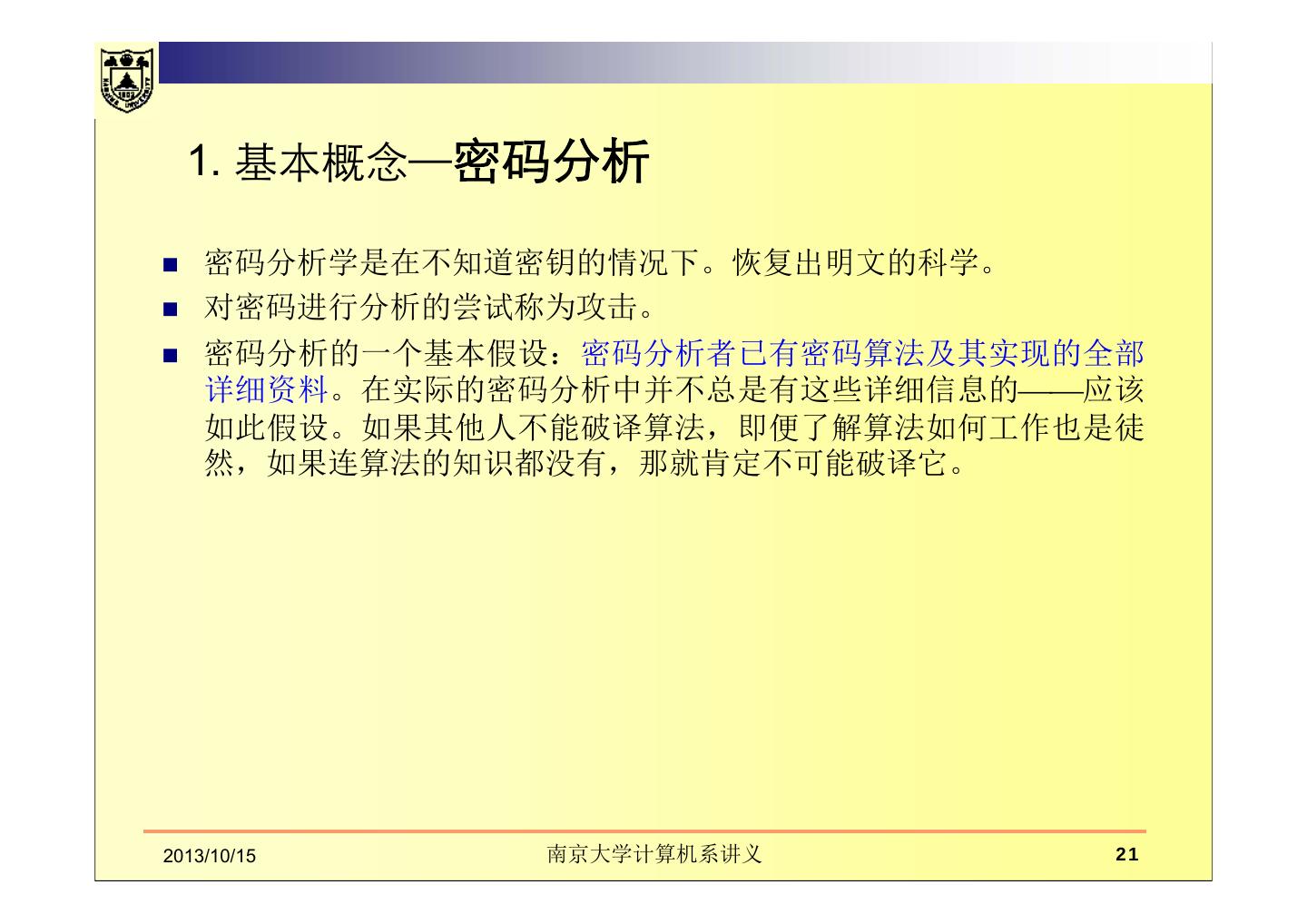 21 . 1. 基本概念—密码分析 密码分析学是在不知道密钥的情况下。恢复出明文的科学。 对密码进行分析的尝试称为攻击。 密码分析的一个基本假设:密码分析者已有密码算法及其实现的全部 详细资料。在实际的密码分析中并不总是有这些详细信息的应该 如此假设。如果其他人不能破译算法,即便了解算法如何工作也是徒 然,如果连算法的知识都没有,那就肯定不可能破译它。 2013/10/15 南京大学计算机系讲义 21