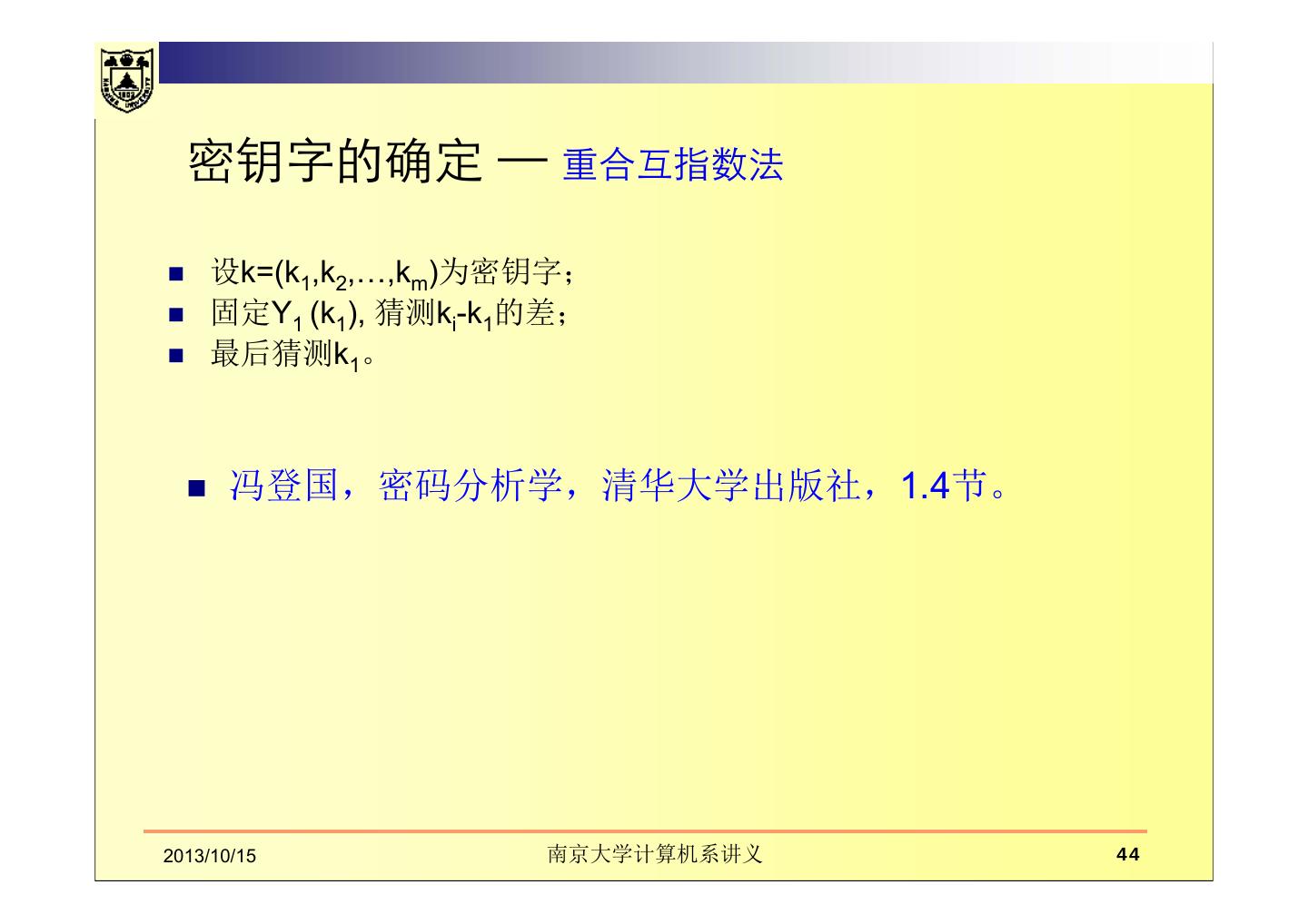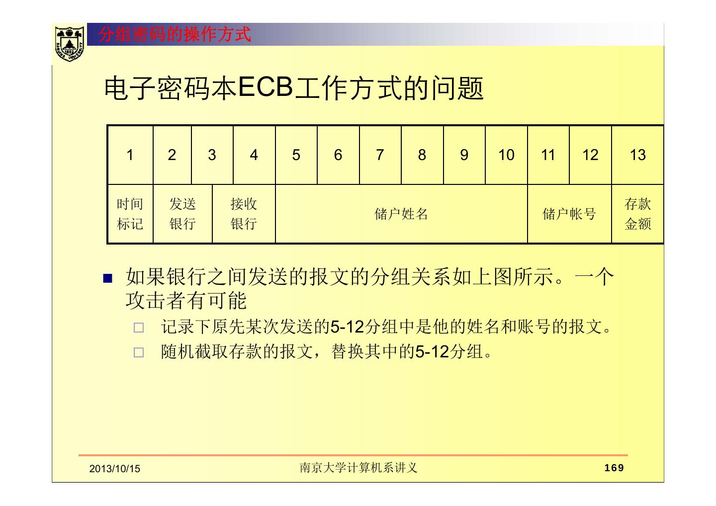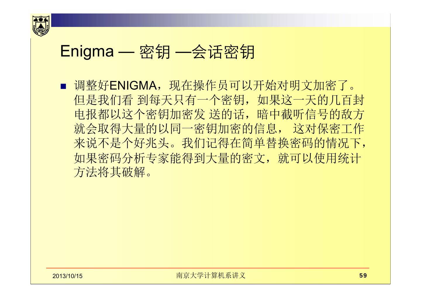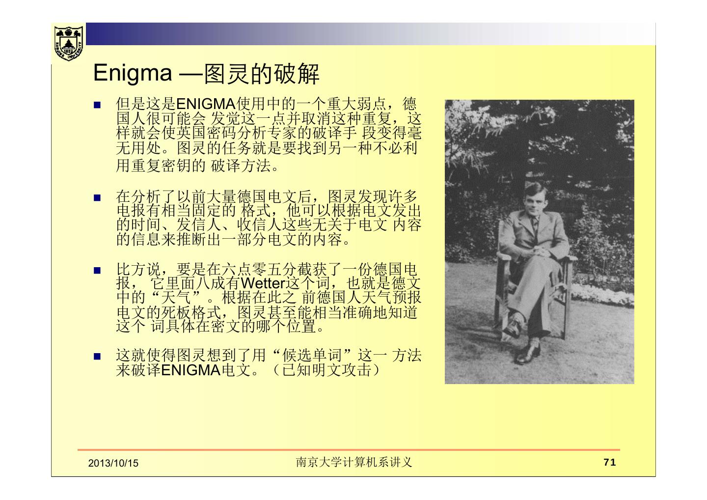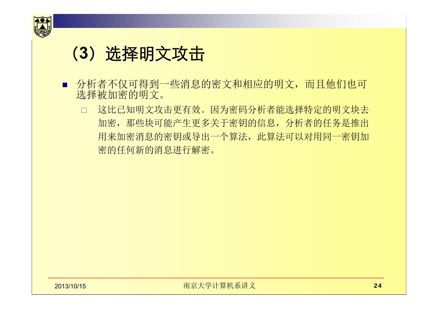 23 . (2)已知明文攻击 密码分析者不仅可得到一些消息的密文,而且也知道这些 消息的明文。 分析者的任务就是用加密信息推出用来加密的密钥或导出一个算 法,此算法可以对用同一密钥加密的任何新的消息进行解密。 已知:P1,C1=Ek(P1),P2,C2=Ek(P2),,Pi,Ci=Ek (Pi) 推导出:密钥k,或从Ci+1= Ek(Pi+1)推出Pi+1的算法。 2013/10/15 南京大学计算机系讲义 23