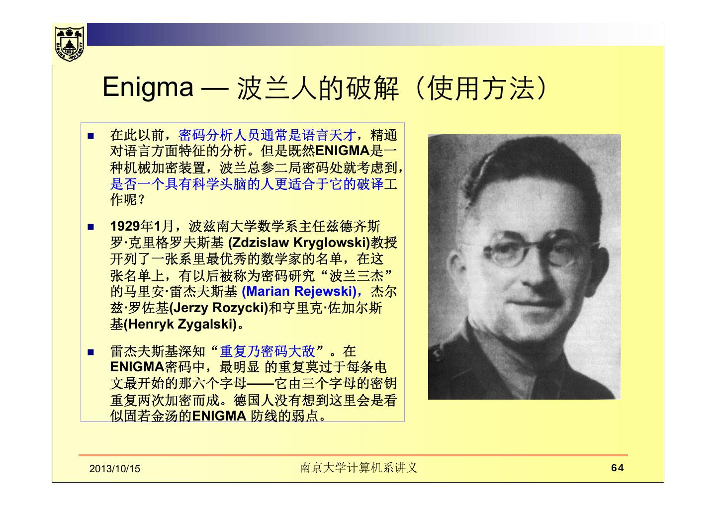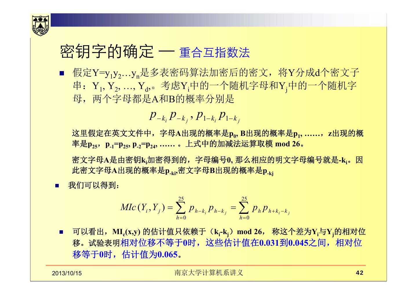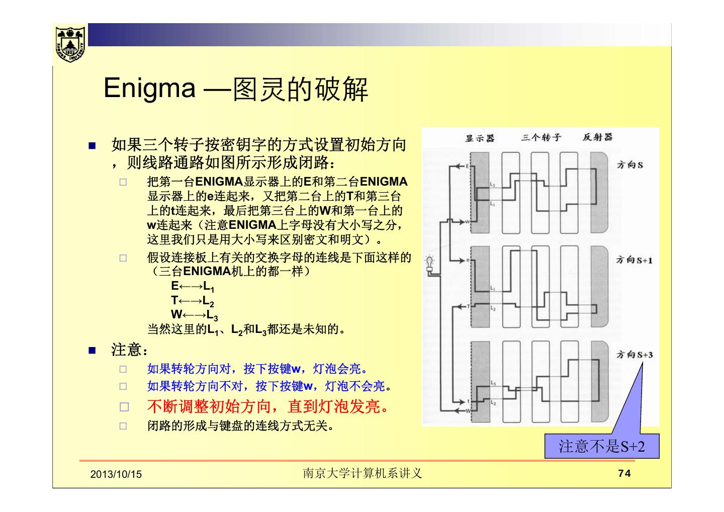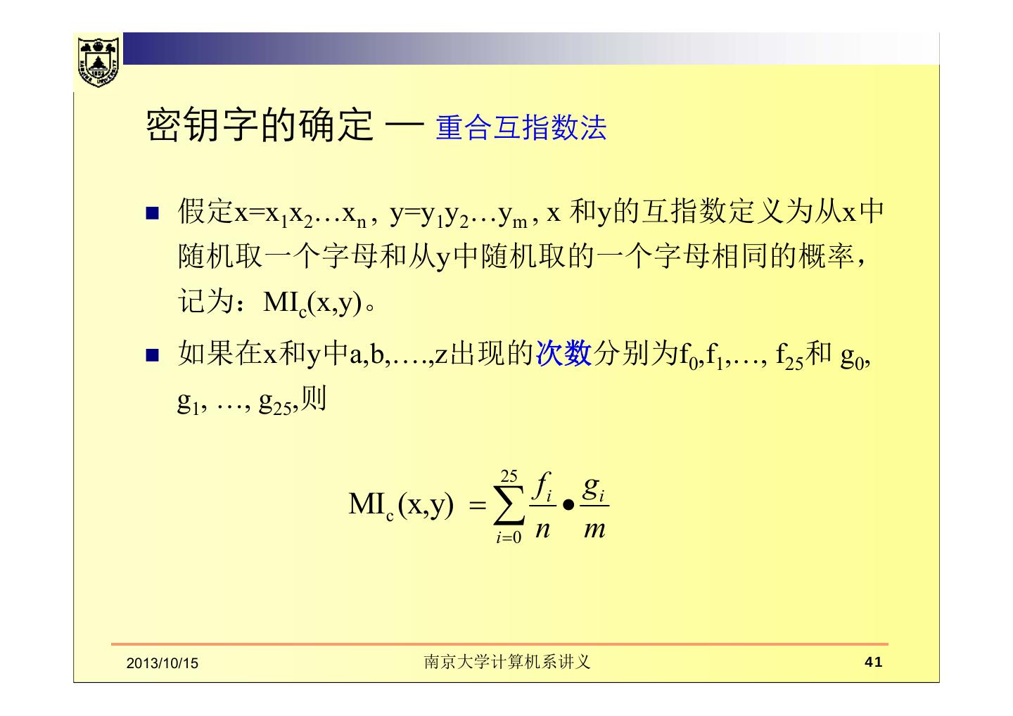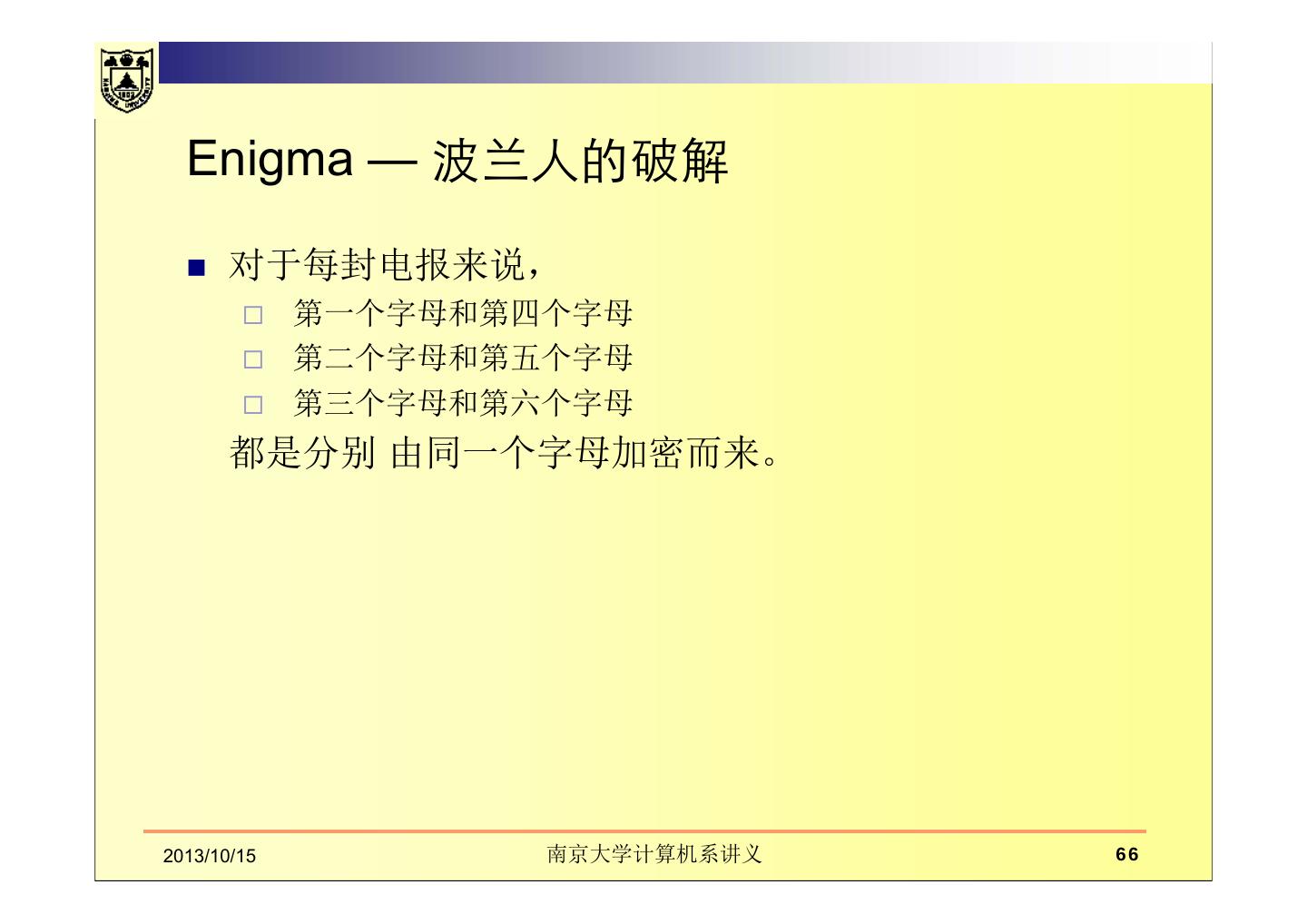 23 . (2)已知明文攻击 密码分析者不仅可得到一些消息的密文,而且也知道这些 消息的明文。 分析者的任务就是用加密信息推出用来加密的密钥或导出一个算 法,此算法可以对用同一密钥加密的任何新的消息进行解密。 已知:P1,C1=Ek(P1),P2,C2=Ek(P2),,Pi,Ci=Ek (Pi) 推导出:密钥k,或从Ci+1= Ek(Pi+1)推出Pi+1的算法。 2013/10/15 南京大学计算机系讲义 23