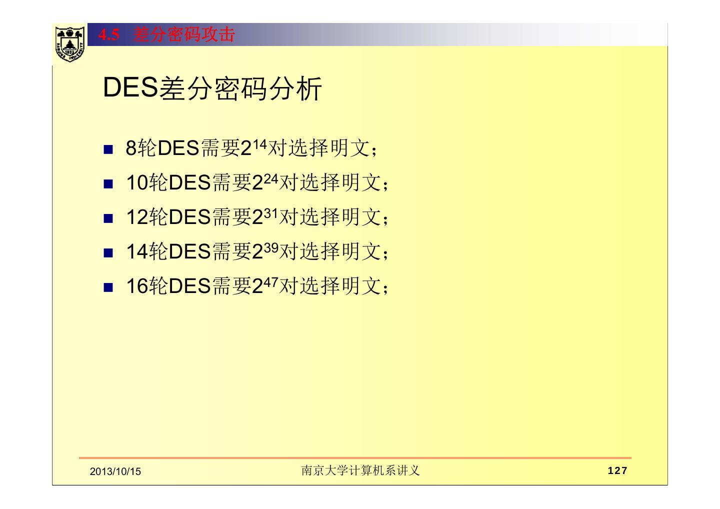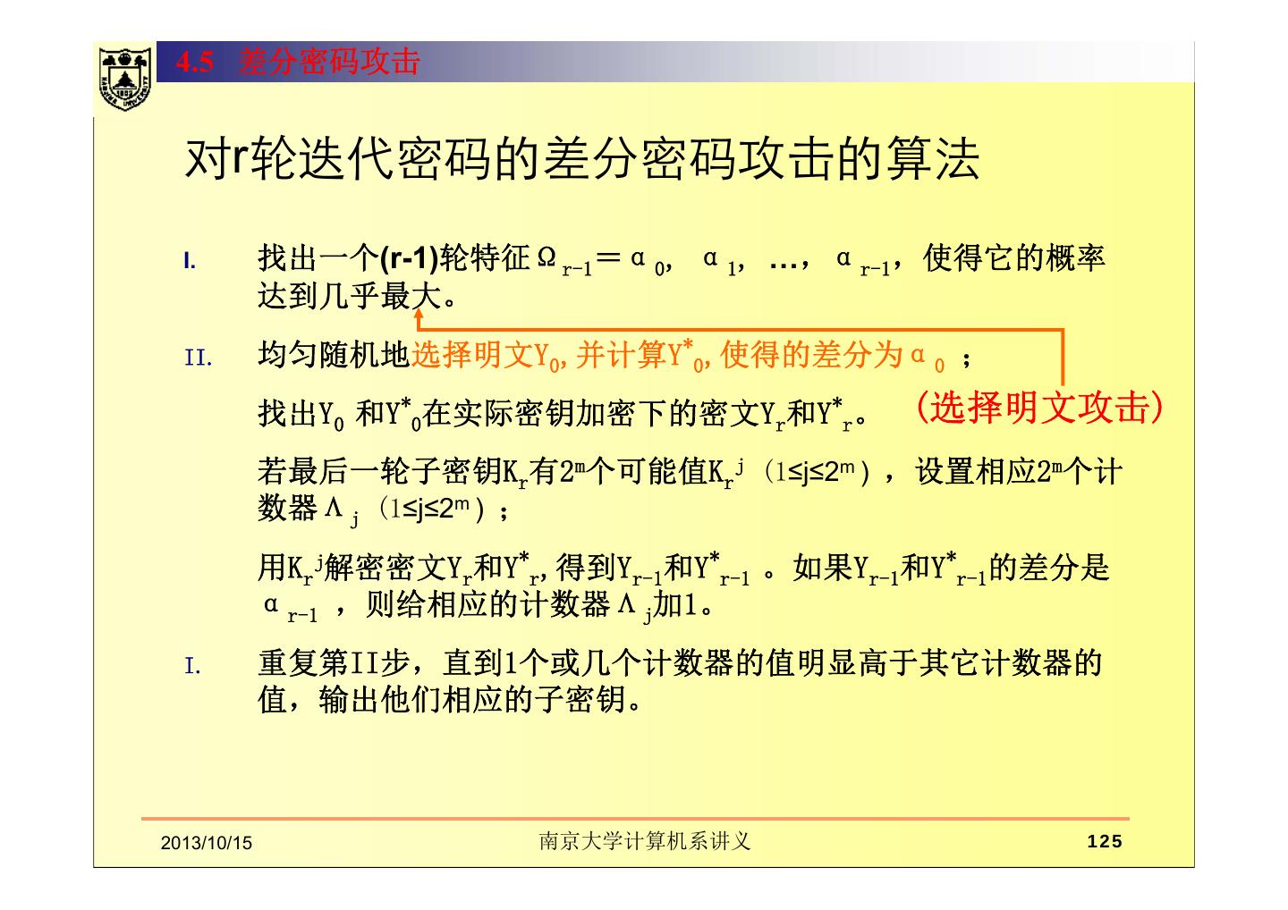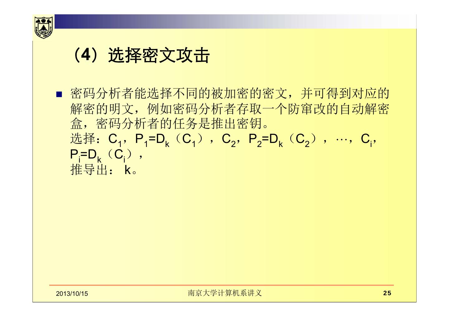 24 . (3)选择明文攻击 分析者不仅可得到一些消息的密文和相应的明文,而且他们也可 选择被加密的明文。 这比已知明文攻击更有效。因为密码分析者能选择特定的明文块去 加密,那些块可能产生更多关于密钥的信息,分析者的任务是推出 用来加密消息的密钥或导出一个算法,此算法可以对用同一密钥加 密的任何新的消息进行解密。 2013/10/15 南京大学计算机系讲义 24