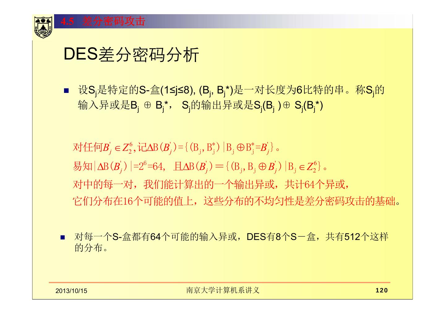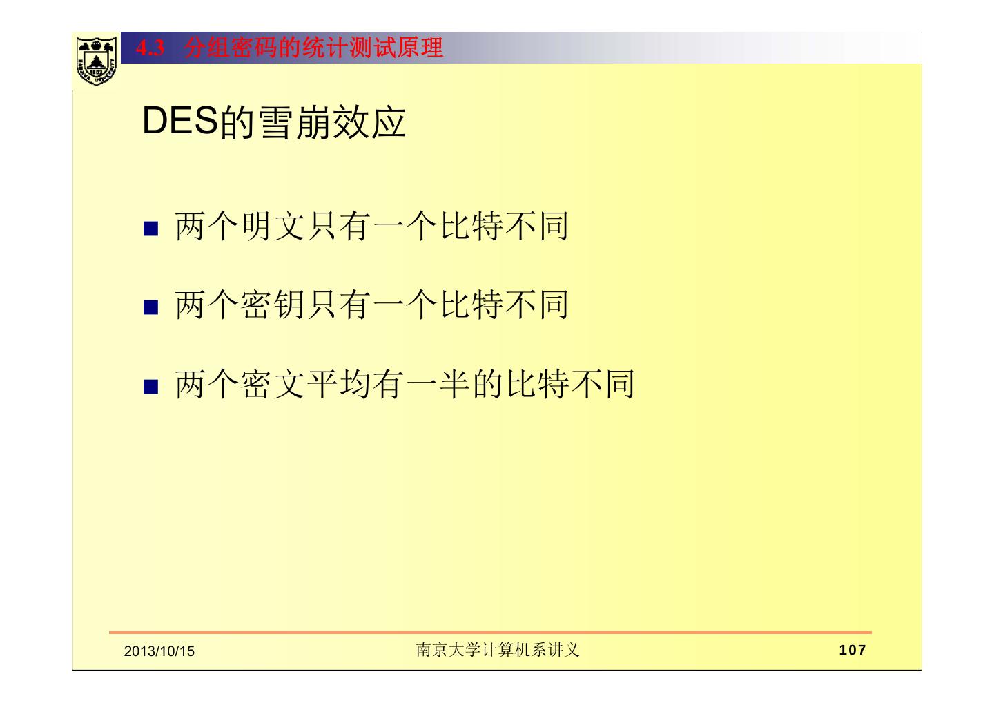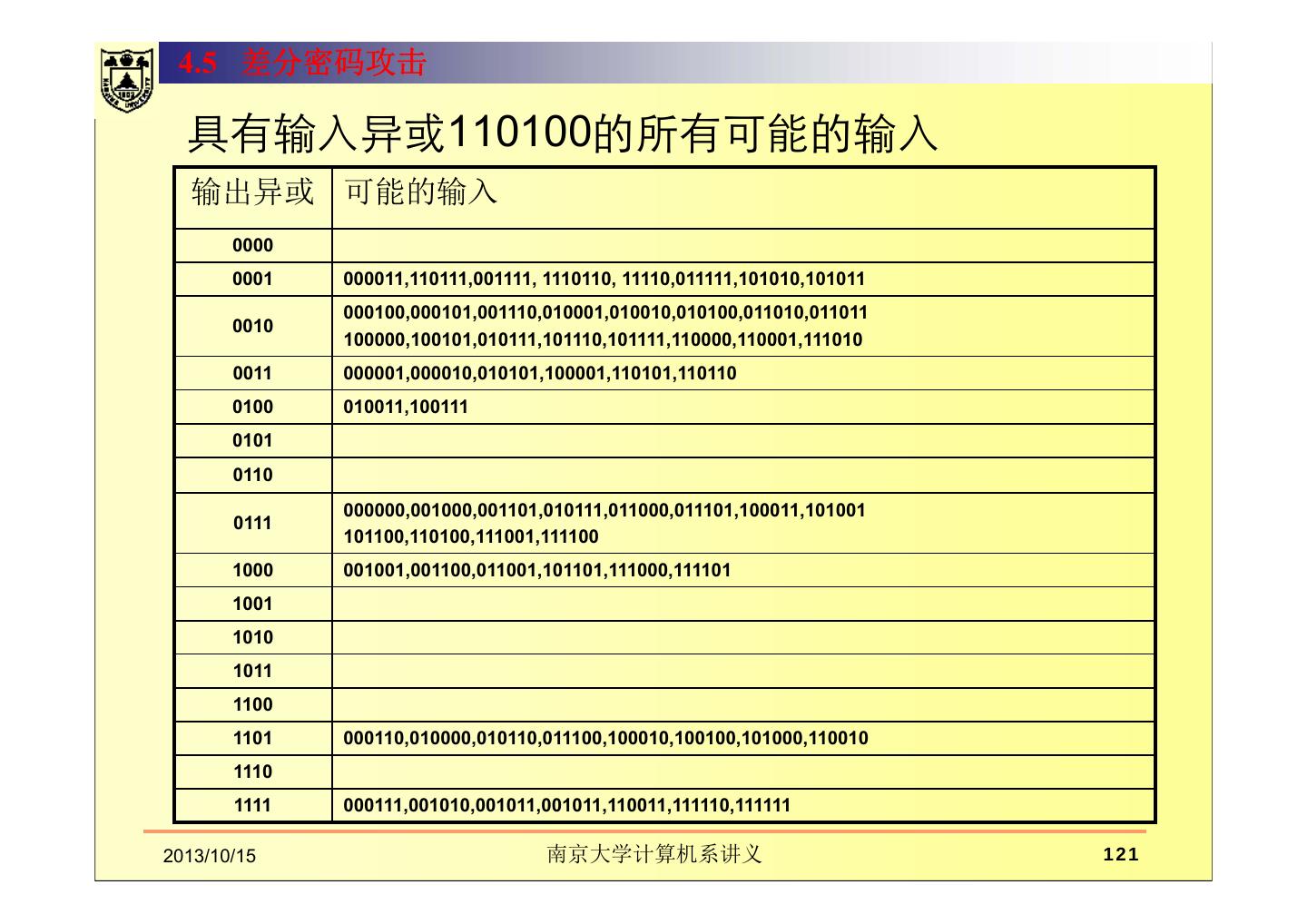 24 . (3)选择明文攻击 分析者不仅可得到一些消息的密文和相应的明文,而且他们也可 选择被加密的明文。 这比已知明文攻击更有效。因为密码分析者能选择特定的明文块去 加密,那些块可能产生更多关于密钥的信息,分析者的任务是推出 用来加密消息的密钥或导出一个算法,此算法可以对用同一密钥加 密的任何新的消息进行解密。 2013/10/15 南京大学计算机系讲义 24